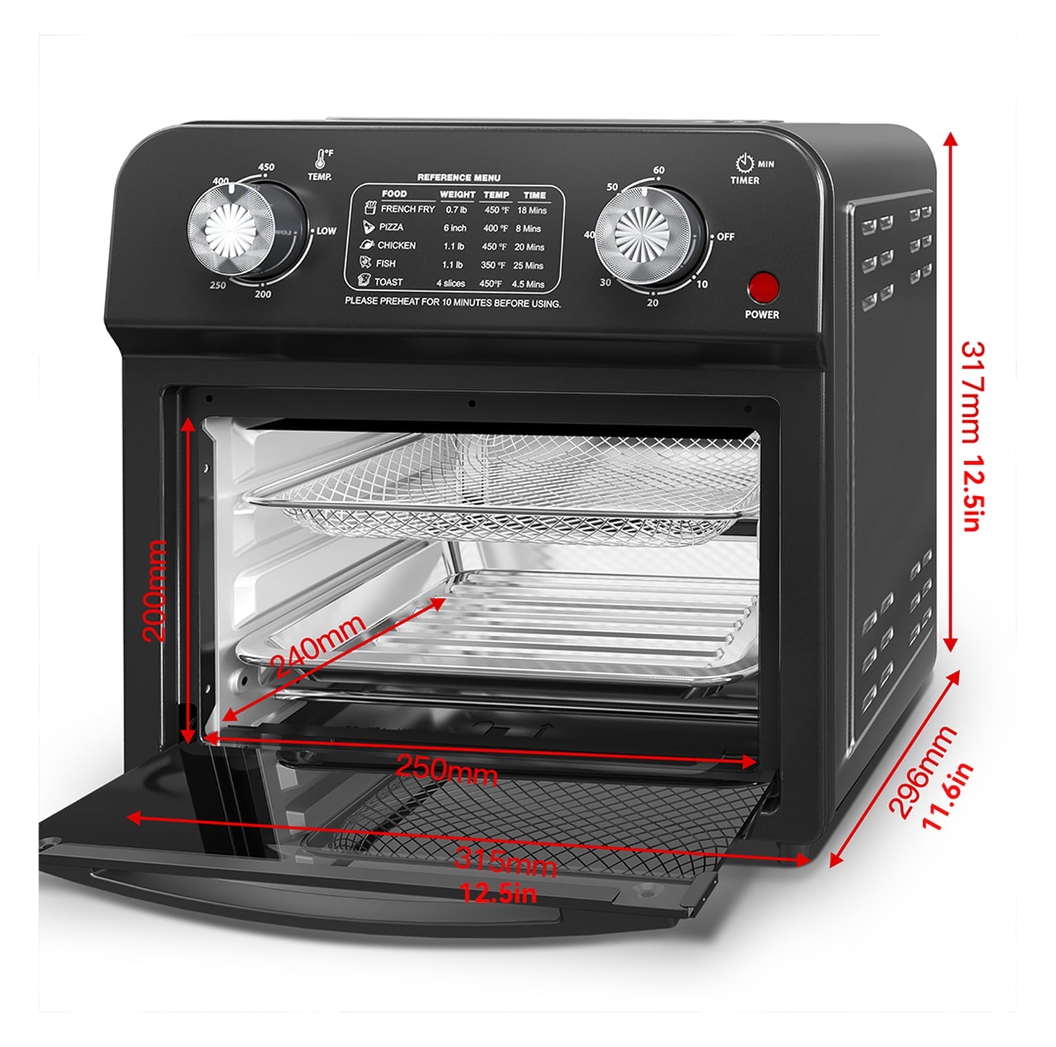 - Complete Starter Package: Your toaster oven comes with all the you need to get cooking right away. Included are a user manual, mesh rack, bake tray, toaster tong, and a convenient built-in crumb tray, so you’re ready to prepare your favorite meals.