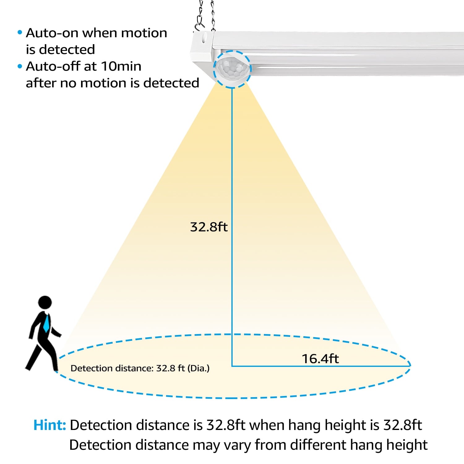 ✓Built-in newly designed motion sensor, no switch required, automatically turn on & off, 16.4ft radius detection range, auto-on when motion is detected and auto-off at 10mins after no motion is detected. (To completely turn the shop light off, simply plug out the power cord or install a manual switch on the circuit instead.)