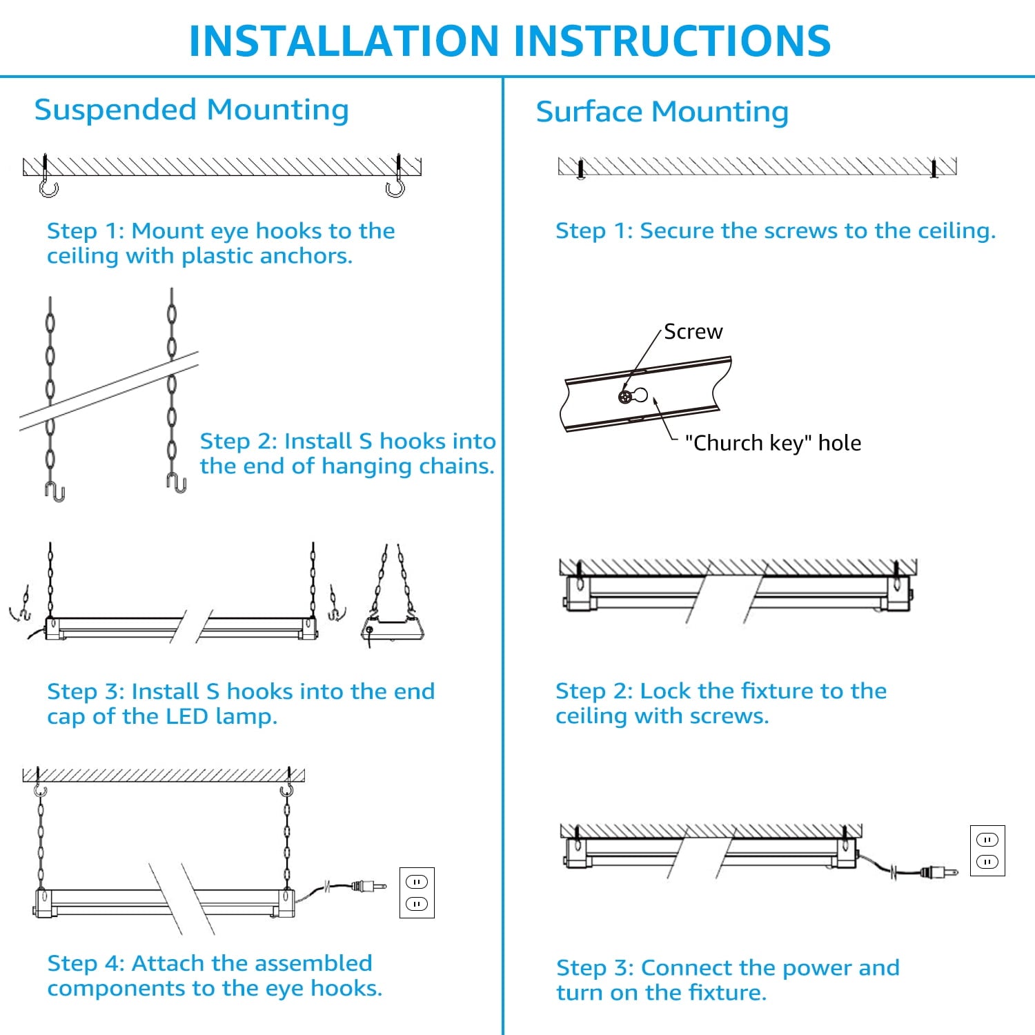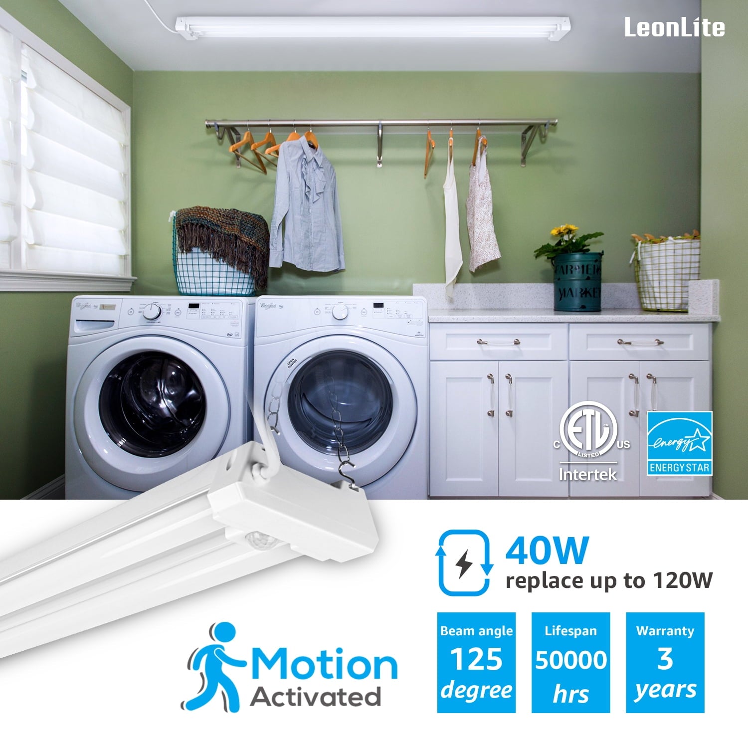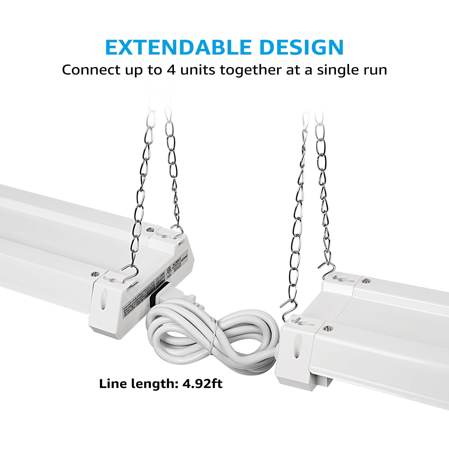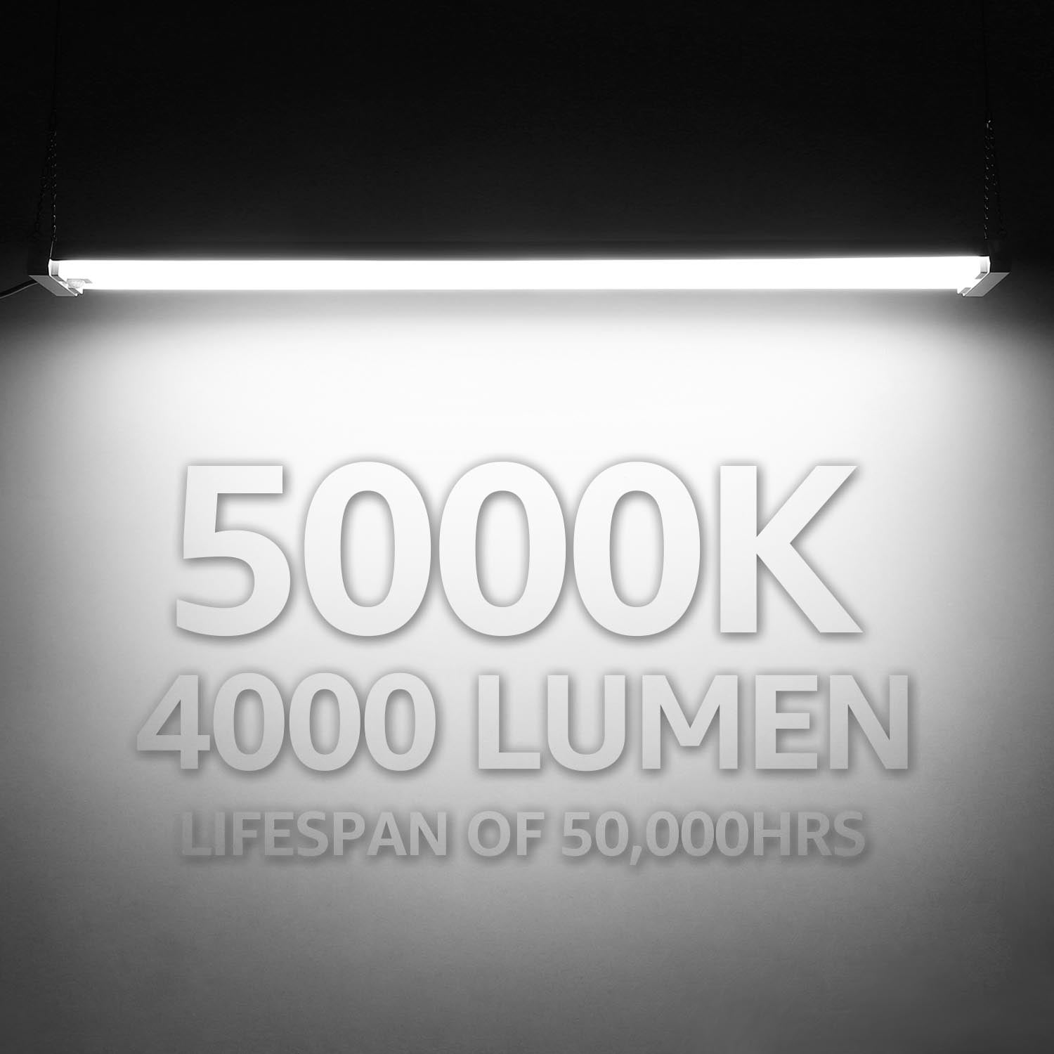 The motion sensor LED light for shops features a built-in motion sensor that detects movement within a 16.4 ft radius, automatically turning the light on and off without the need for a switch. When activated, the light remains on for 10 minutes, offering convenience and safety. Emitting an ultra-bright 4000 lumens, this LED motion shop light is perfect for lighting up whole rooms or areas such as laundry rooms, garages, kitchens, workshops, utility rooms, warehouses, and other commercial and residential spaces. The linkable LED light can be either surface-mounted or suspended and requires no additional wiring due to its plug-and-play design, making it energy-efficient. Equipped with 240 high-quality LED chips, it offers even and well-balanced light without glare or buzzing. With a service lifespan of 50,000 hours, this 40W light consumes significantly less power while providing brightness comparable to 120W T8 tubes, free from harmful substances such as mercury, infrared, and UV radiation.