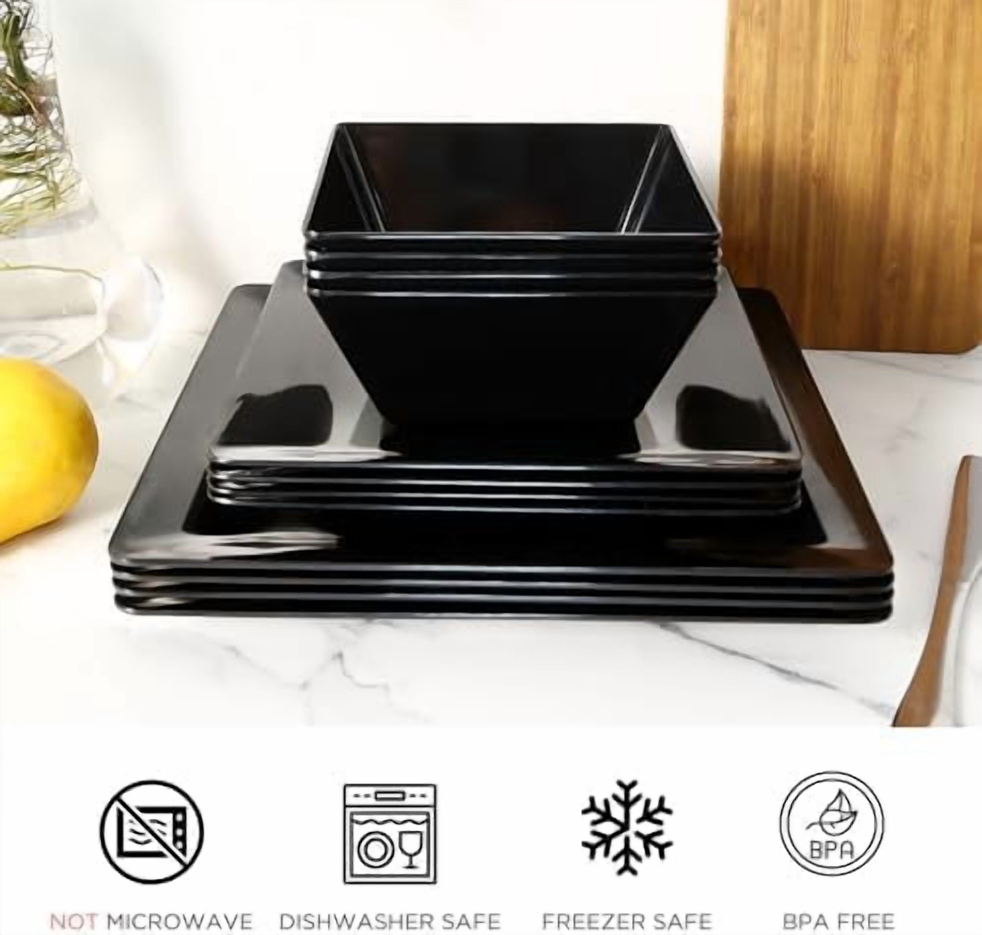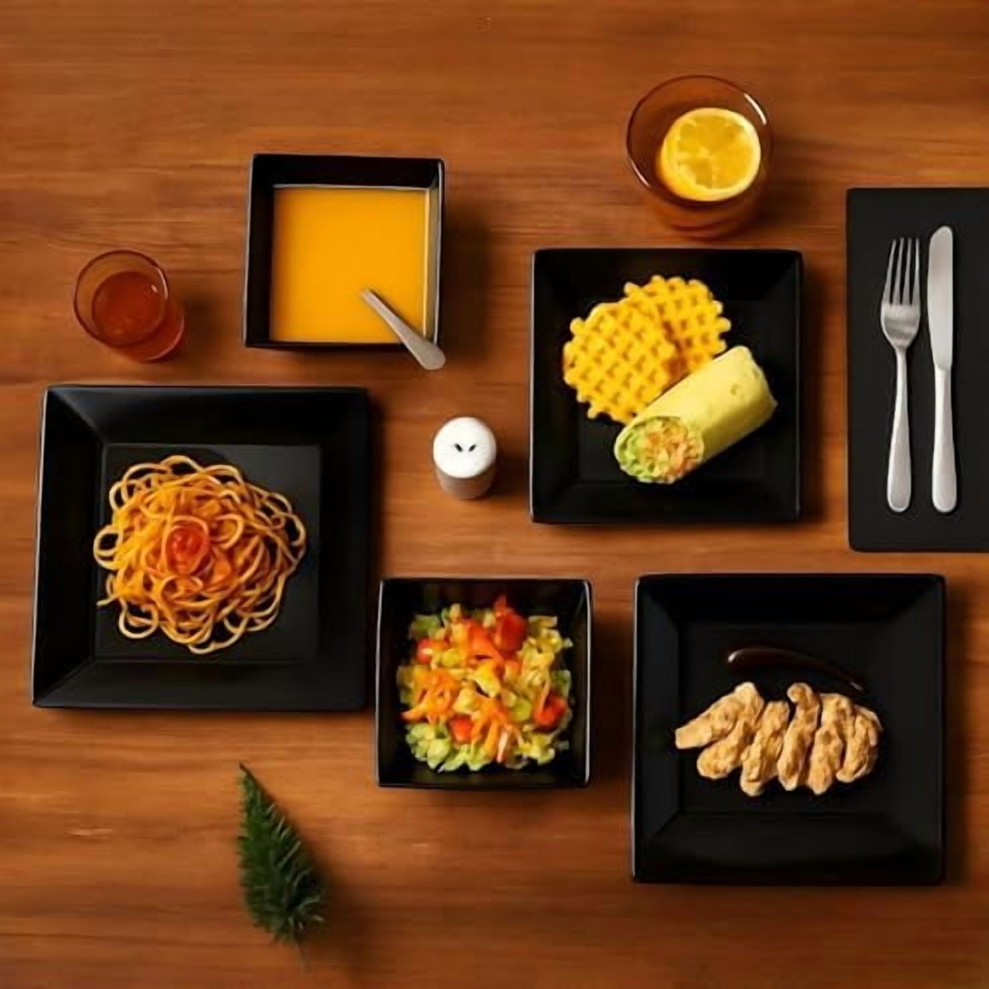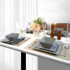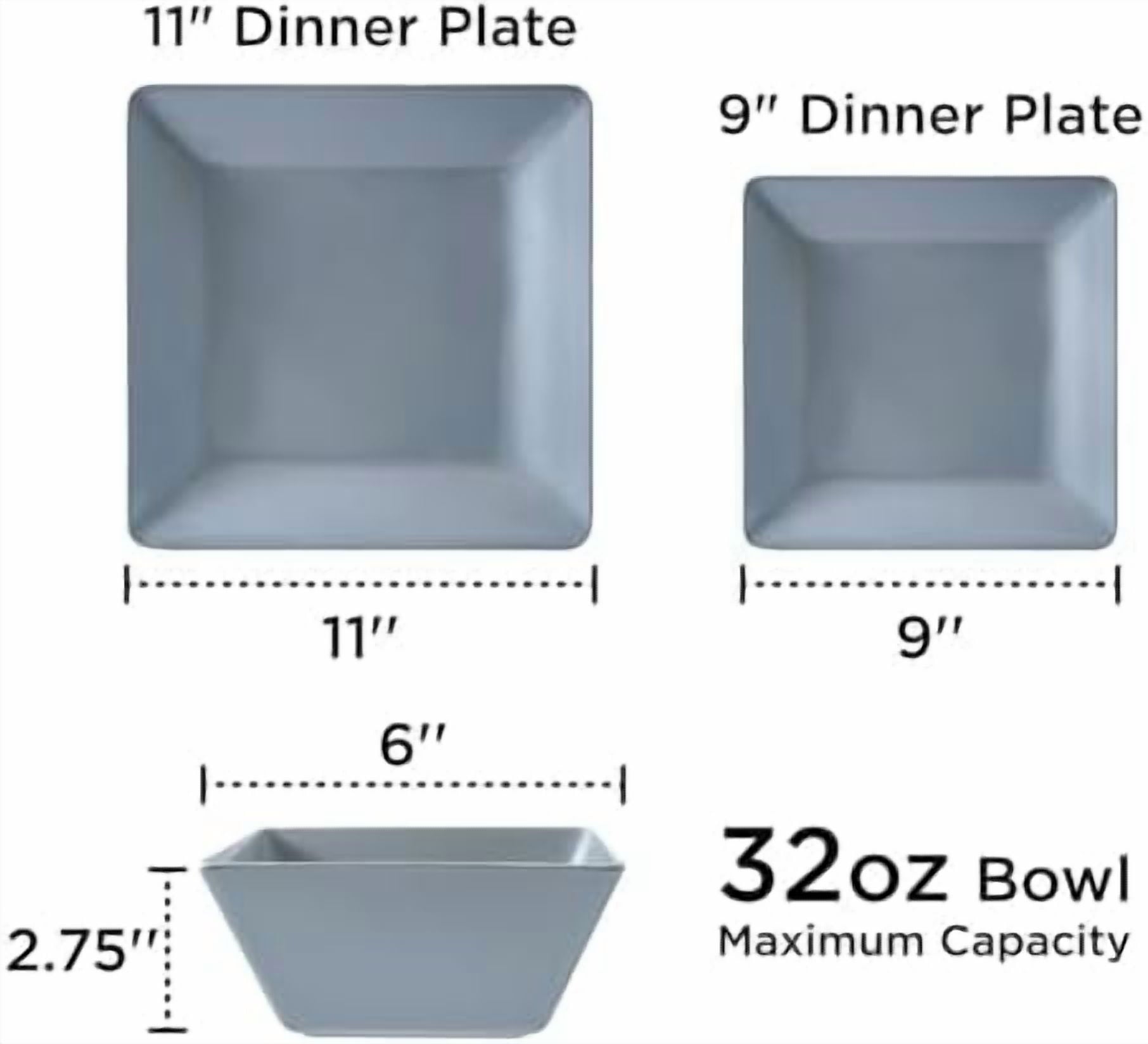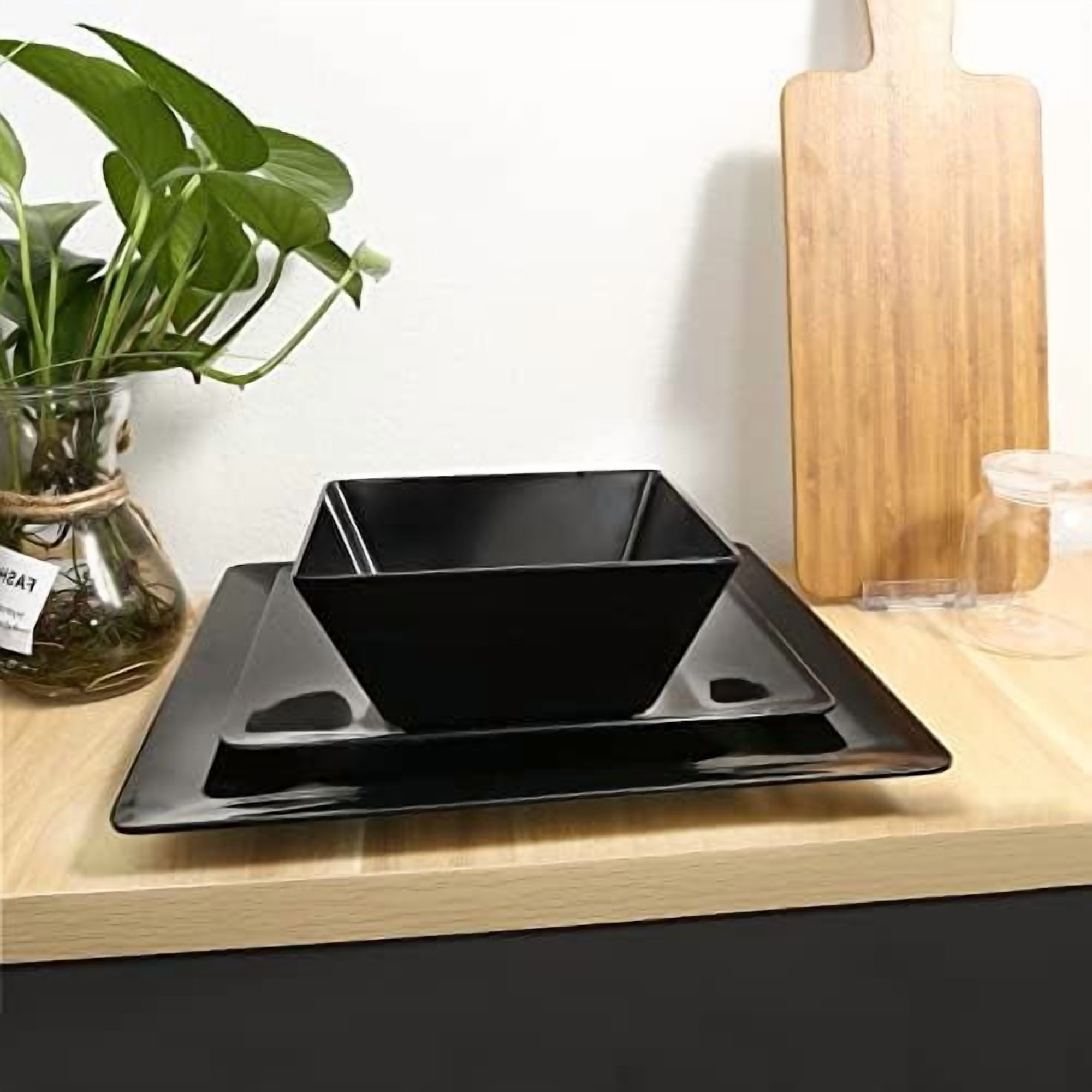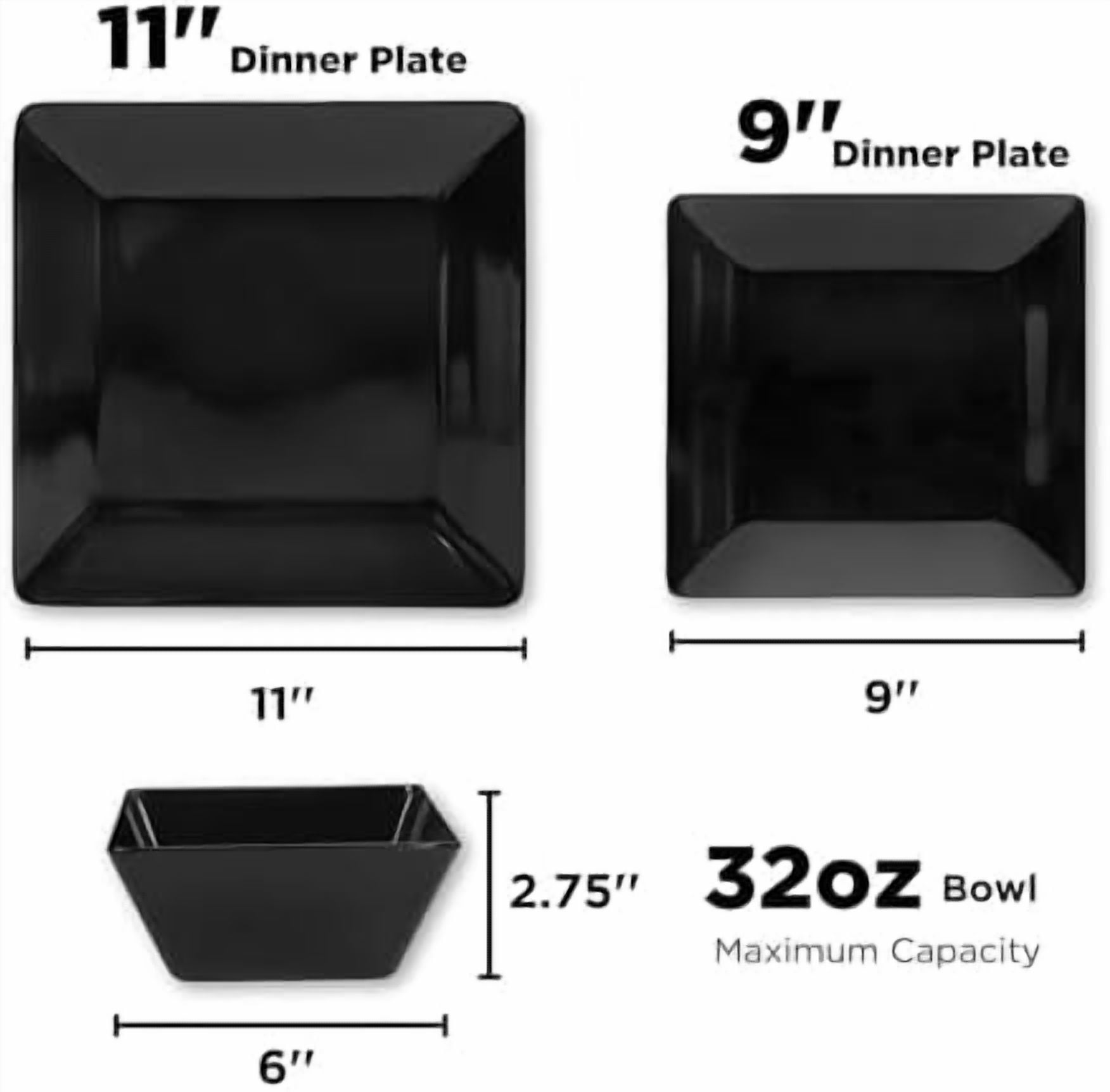 - Dinnerware Set for 4: Includes 4 each of 32 oz bowls, 11″ dinner plates, and 9″ salad plates — crafted in a sleek square shape with a dark gray finish and brilliant glow, ideal for both everyday meals and formal gatherings.