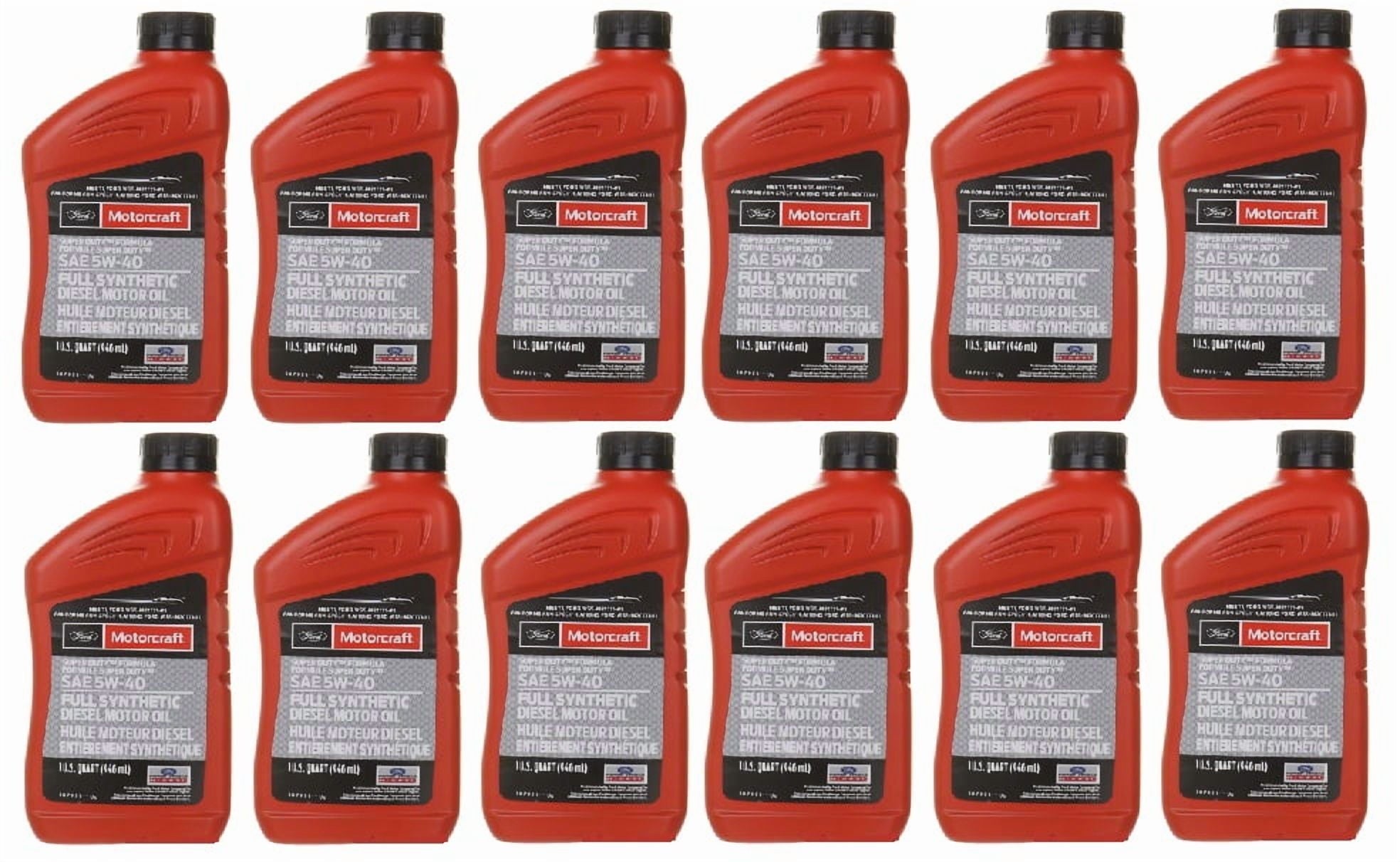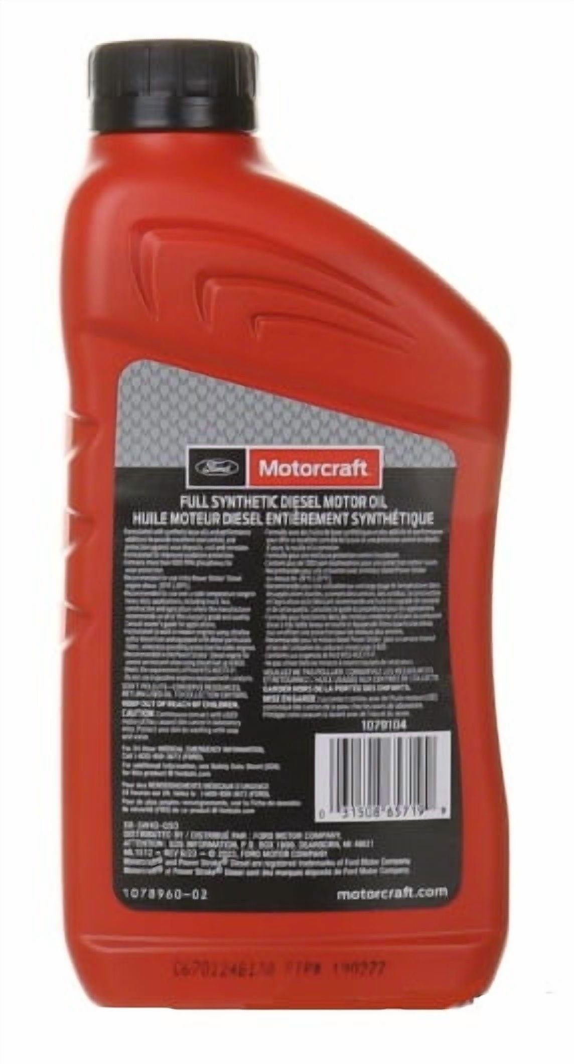 Motorcraft® SAE 5W-40 Full Synthetic Diesel Motor Oil is a high-performance light- and heavy-duty diesel engine oil formulated with synthetic base oils and unique additive technology and recommended by Ford Motor Company. It is particularly recommended for use in Ford vehicles equipped with Power Stroke® diesel engines as in truck, bus, construction and other heavy-duty diesel engine applications, as well as the smaller Ford diesel engines