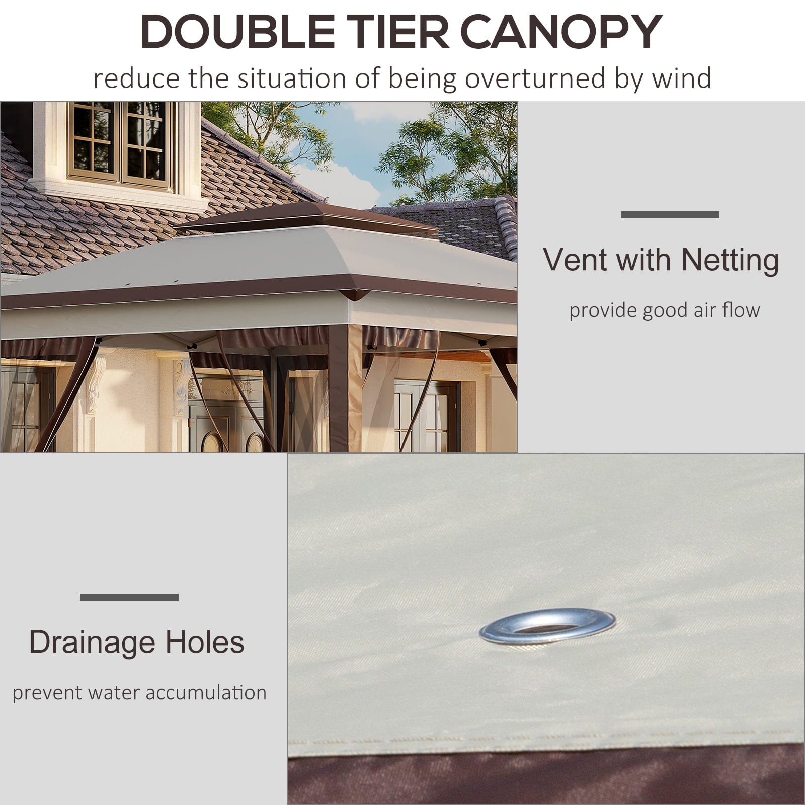 • Two-Tier Canopy: The top of the tent gazebo features two tiers covered with mesh netting so you can enjoy comfortable airflow without letting in unwanted winged guests. On the edges, you’ll find four drainage holes to drain away the rain. The vented top helps keep your tent stable in the wind and keeps a firm footing on your plans.