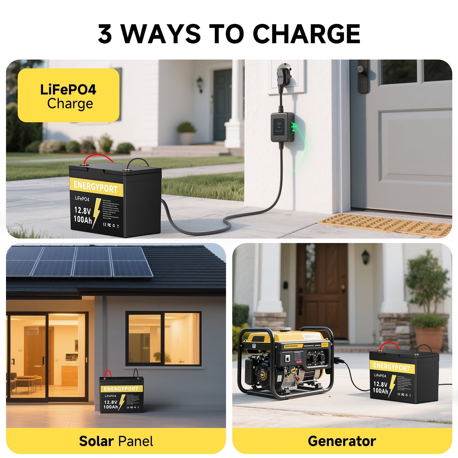 • High Performance: Our LiFePO4 battery has a capacity of 100Ah and a standard voltage of 12.8V. It features A+ grade cells and can endure up to 15000 cycles. It has obtained SDS/UN38.3/FCC/CE/ROHS certifications, ensuring its quality and safety. You can easily connect up to 4 batteries in series or 4 battery packs in parallel, providing a remarkable capacity of up to 20.48kWh.Built-in BMS Protection: The LiFePO4 battery incorporates a built-in 100A BMS protection plate that automatically disconnects the battery if the discharge current exceeds 300±50A. This intelligent design ensures optimal safety for the battery.Low-Temperature Protection: Designed to withstand extreme temperatures, our lithium battery can operate in conditions as low as -4℉ (-20℃) and as high as 158℉ (70℃). It adapts to various climate environments.Multiple Applications: RVs often rely on batteries to power appliances, lighting, electronics, and other systems while off-grid or on the road. LiFePO4 batteries can provide a reliable energy storage solution for RV owners. Battery-powered lawn mowers, trimmers, and other garden equipment can benefit from the high capacity and long cycle life of LiFePO4 batteries.