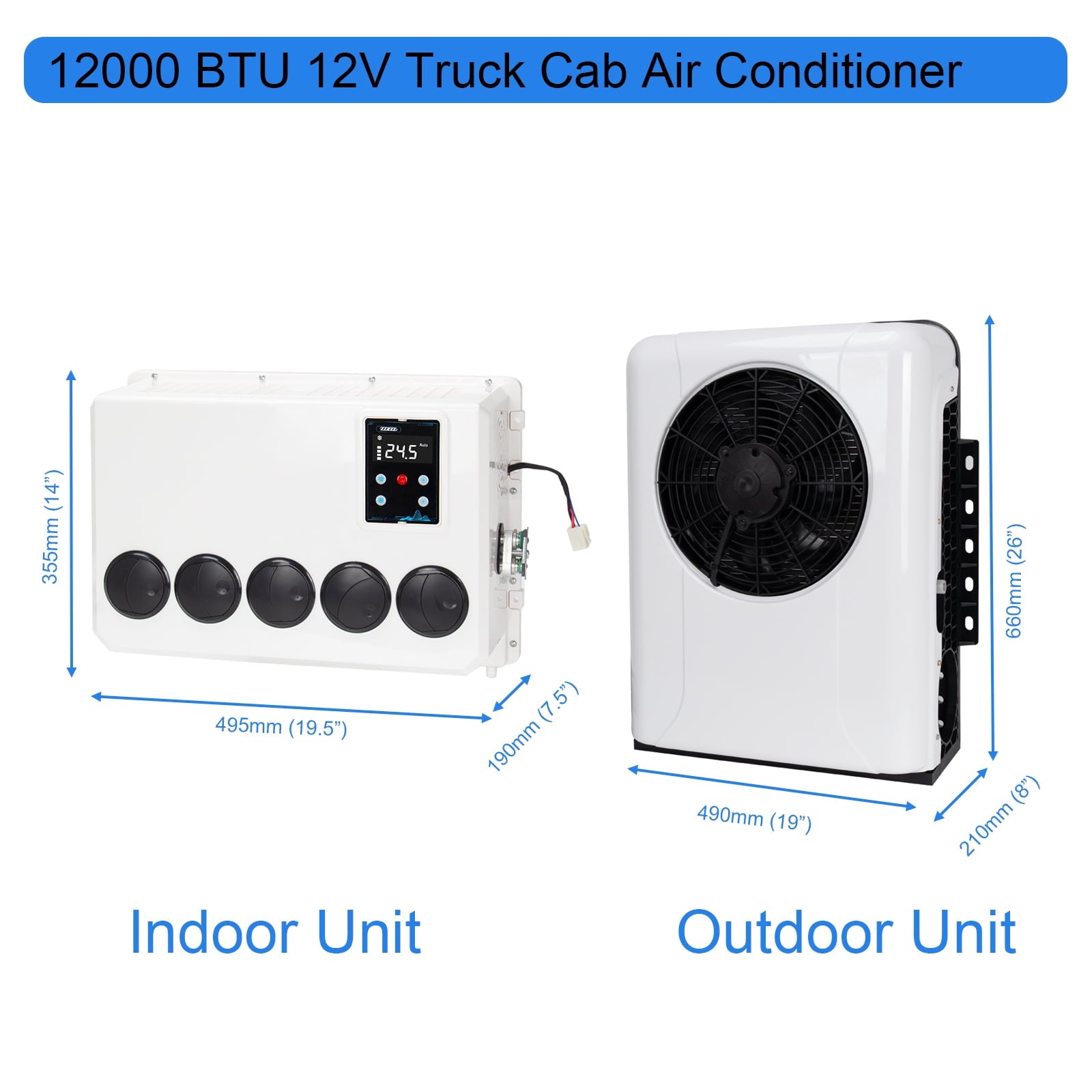【12V air conditioner parameters】 12v air conditioner Rated voltage: 12V, rated current: 60-80A, power: 960W, cooling capacity: 1000W-3000W, inner unit size: L:495 * W:355 * H:190 (Mm) / L:19.5 X W:14 X H:7.5 – Inches, outer unit size: L:660 * W:490 * H:210 (Mm) / L:26 X W:19 X H:8 – Inches, please You carefully compare whether the parameters meet your needs.