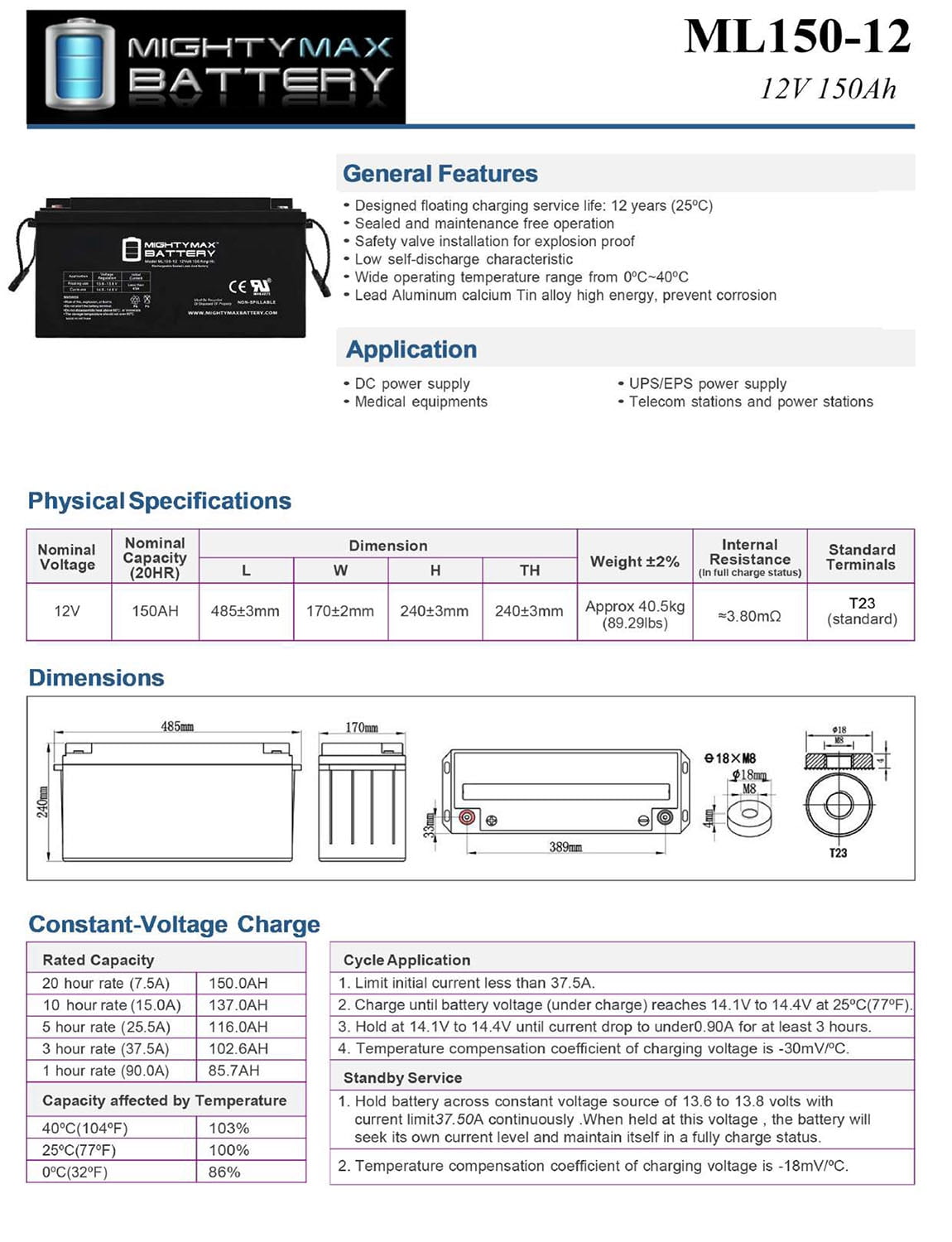 • ML150-12 SLA is a 12V 150AH Sealed Lead Acid (SLA) rechargeable maintenance free battery – UL Certified