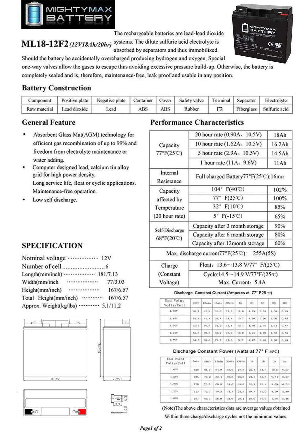 Delivering power when you need it, the Mighty Max ML18-12 F2 12 Volt 18 AH uses a state of the art, heavy-duty, calcium-alloy grid that provides exceptional performance and service life in both float and cyclic applications.