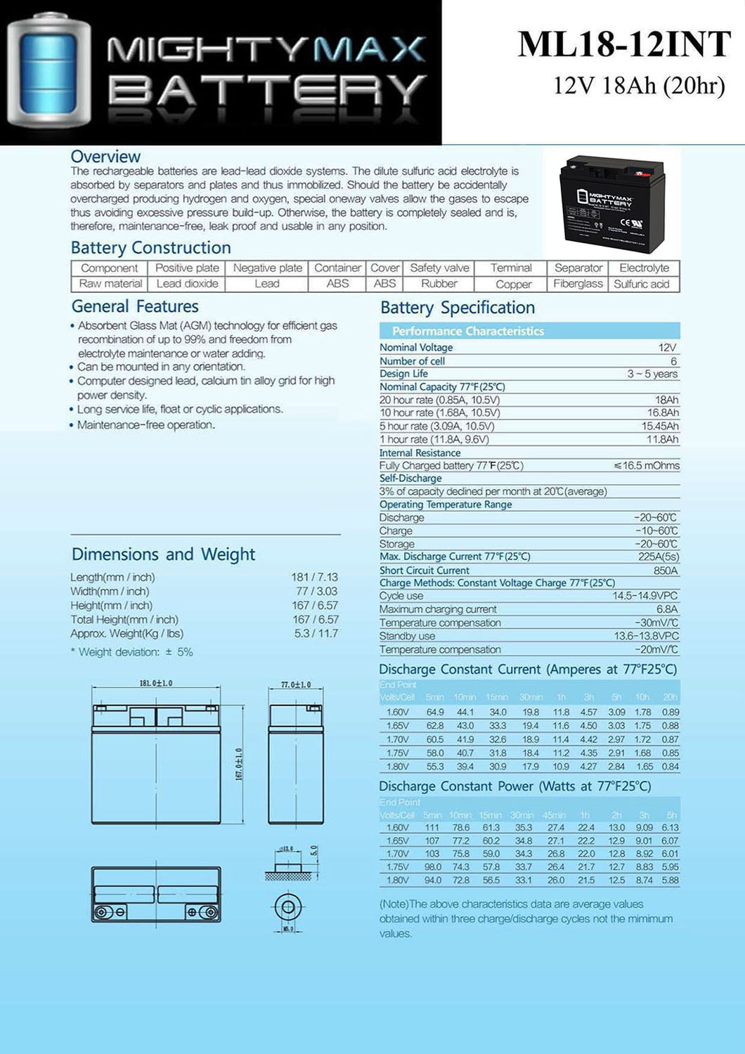 Delivering power when you need it, the Mighty Max ML18-12 Internal Thread 12 Volt 18 AH uses a state of the art, heavy-duty, calcium-alloy grid that provides exceptional performance and service life in both float and cyclic applications.