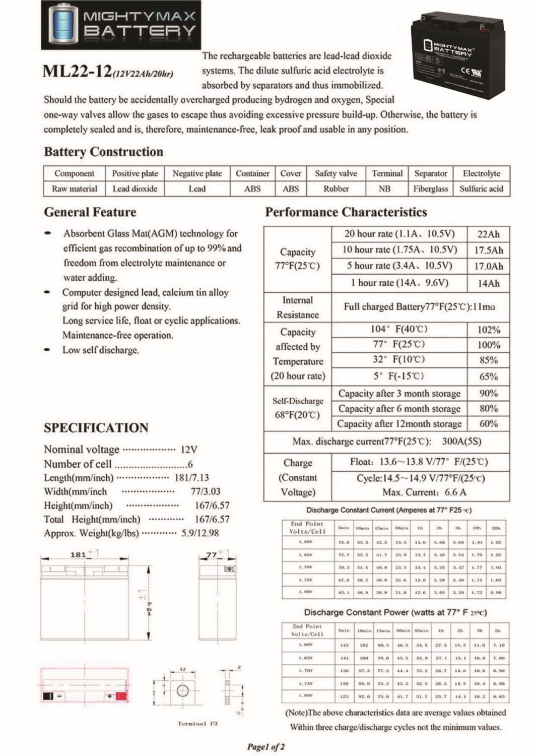 Delivering power when you need it, the Mighty Max ML22-12 12 Volt 22 AH uses a state of the art, heavy-duty, calcium-alloy grid that provides exceptional performance and service life in both float and cyclic applications.