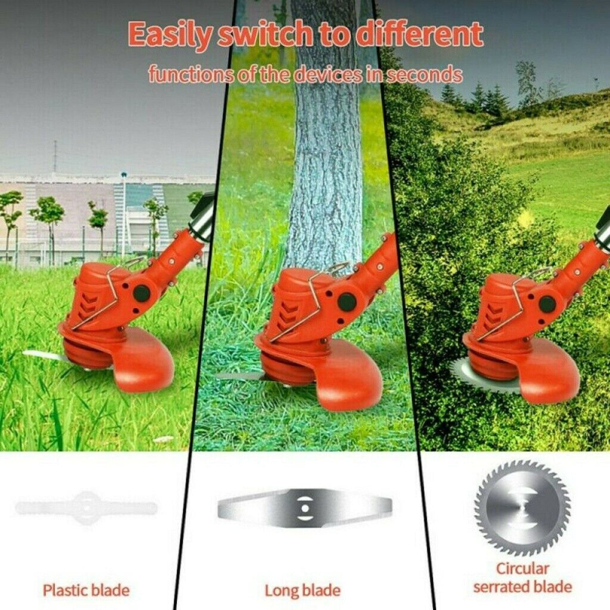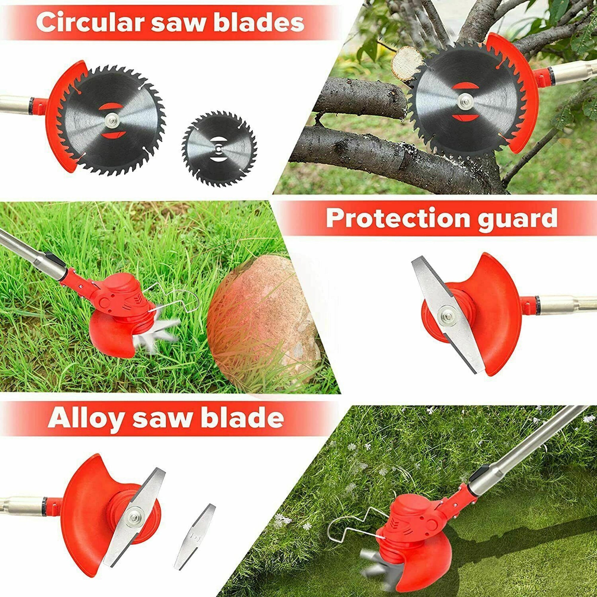 Plastic blades for mowing delicate grass, Metal blades for cutting thick weeds and small shrubs, Saw blades for pruning thicker shrubs and branches. Ideal for trimming around yards and bushes, lots, flower beds, walkways, patios.