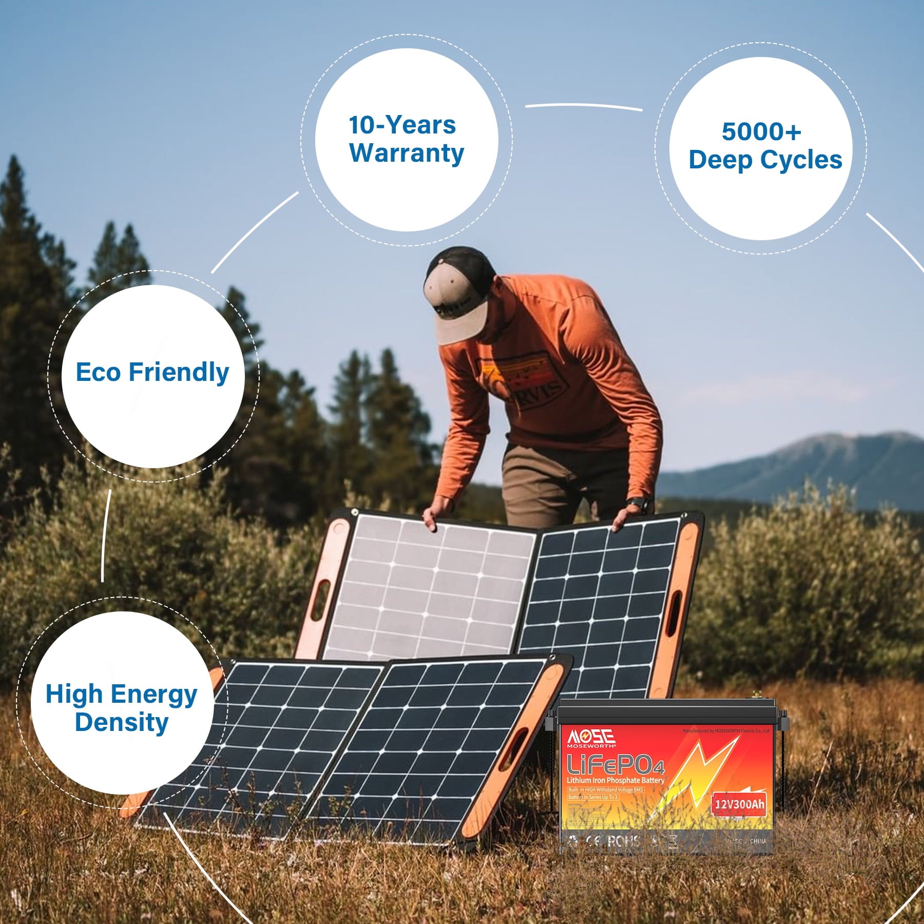 - MOSEWORTH 12V 300AH LiFePO4 Battery with a lifespan of up to 10 years and 4000-15000 cycles, our 12V 300Ah LiFePO4 battery produces a total of 15360kWh energy (3840Wh x 4000 cycles = 15360kWh), providing 50% power savings compared to utility power. Simple installation and reliable performance offer clean energy and cost savings.