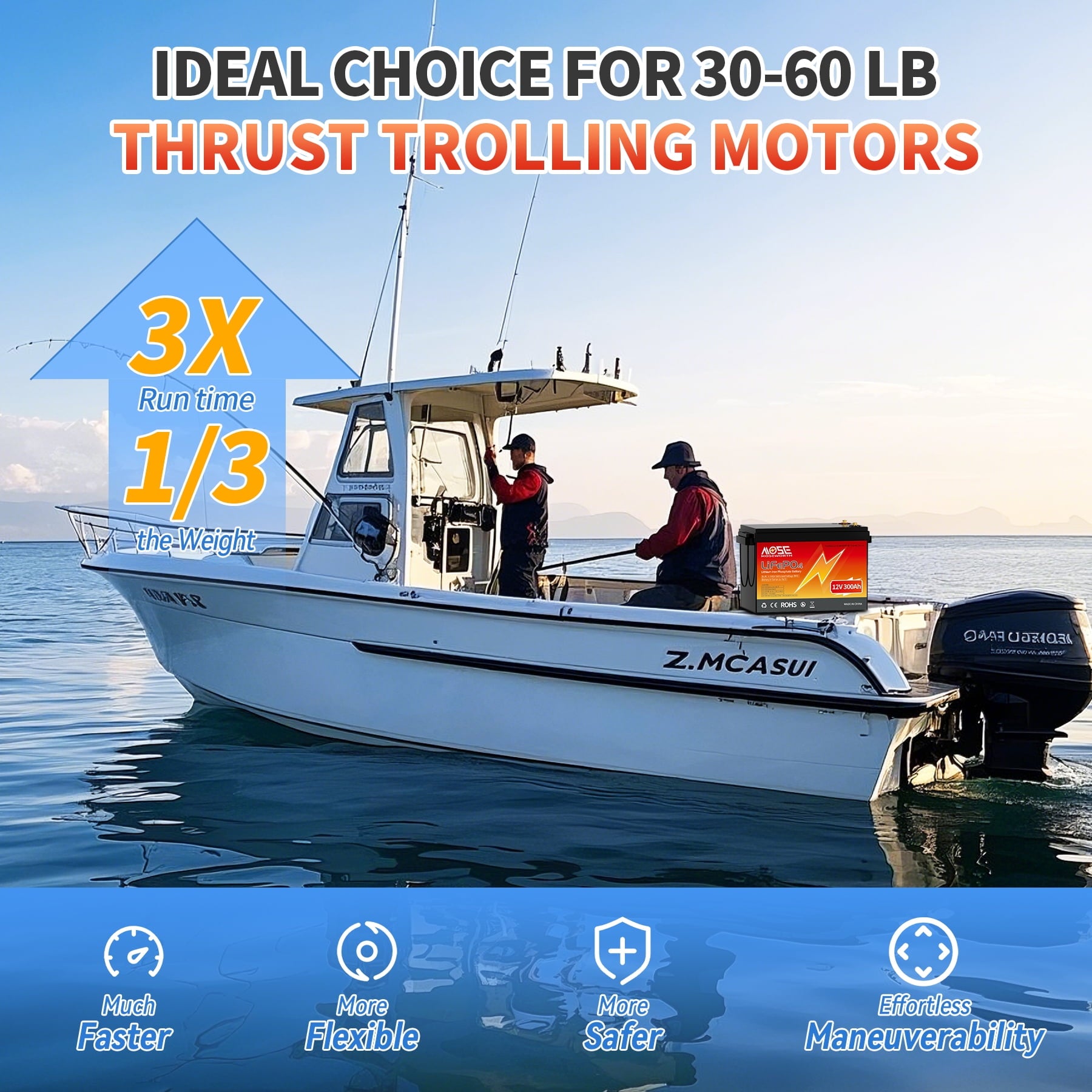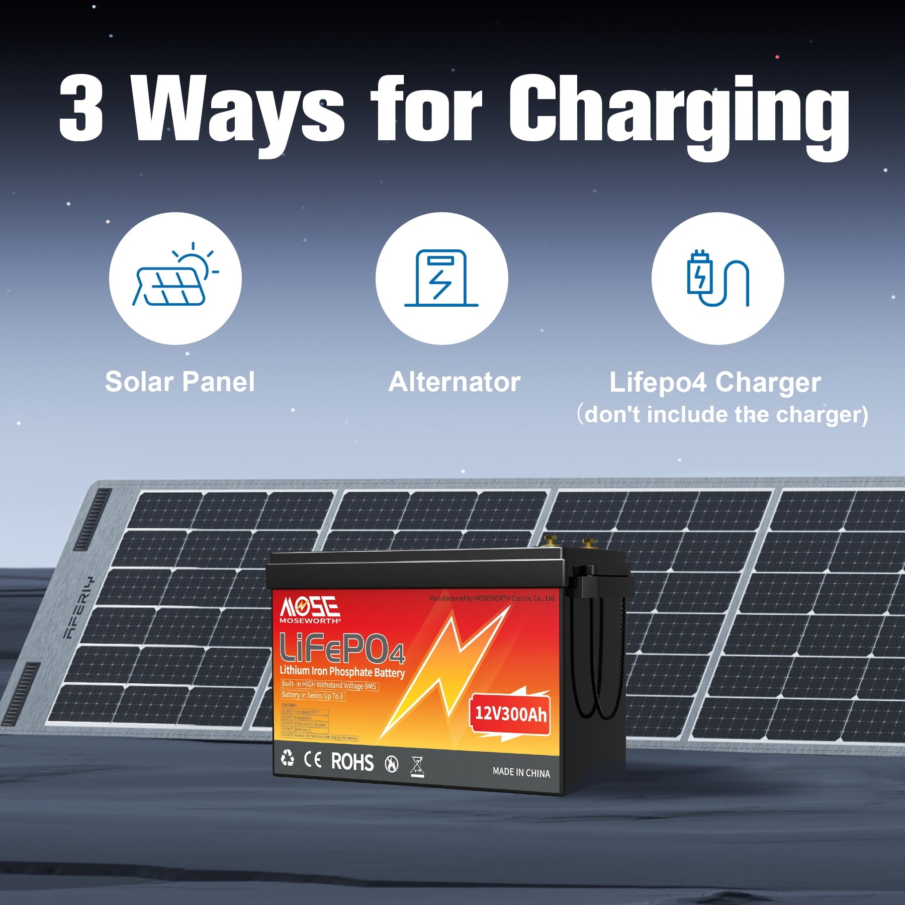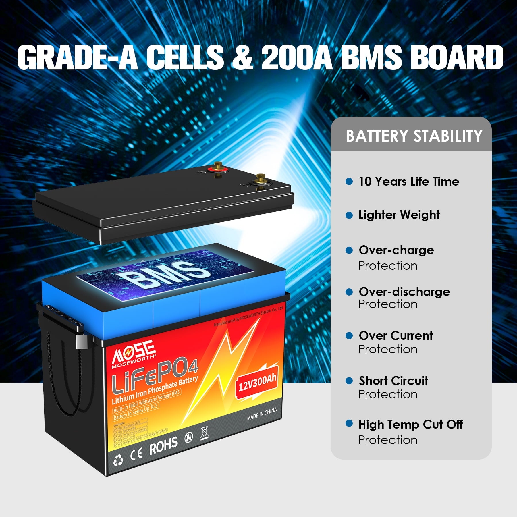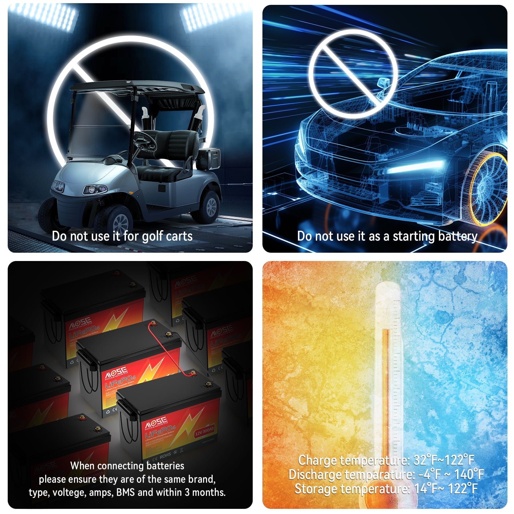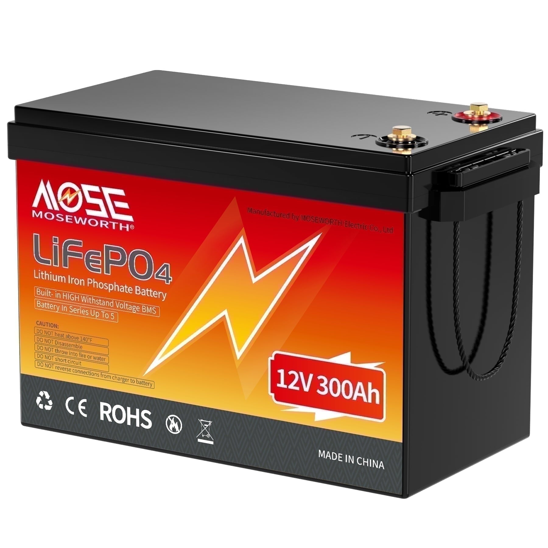 MOSEWORTH have our own factory, have been specialized in developing sustainable and green energy products, that is the superior LiFePO4 batteries. Our batteries pollution-free, 100% safe and non-toxic. This 12.8V 300Ah LiFePO4 battery deep cycle battery delivers rapid and reliable power, whether it’s camping, boating, solar systems, or emergency backup power, our battery provides long-lasting and dependable energy for your devices.