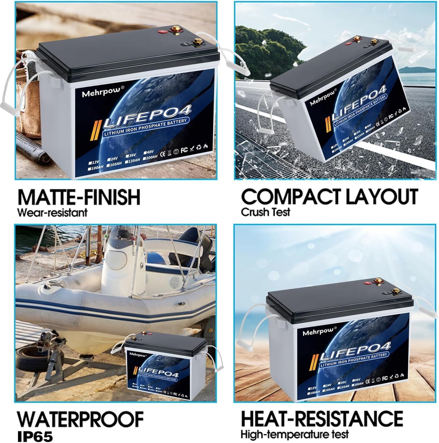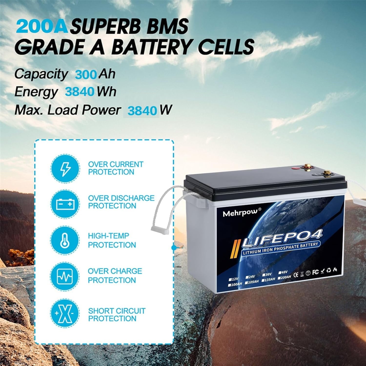 - 【Industry-Leading Compact Design|50% Space Saved|300Ah High Capacity|Grade A High-Density Cells】 The Mehrpow 12V 300Ah LiFePO4 Battery features an ultra-compact design (13.58×7.48×9.65 inches, 980 cu in), 50% smaller than 3*100Ah lithium setups (industry average: 2022 cu in), perfect for RVs, boats, and off-grid systems with limited space! Powered by premium Grade A LiFePO4 cells with 30% higher energy density, it delivers 300Ah true capacity (100% Depth of Discharge) in a single unit—no need for parallel battery banks. Ideal for solar energy storage, UPS backup, trolling motors, and high-demand devices, this battery redefines space-saving, high-capacity power for modern adventures!
