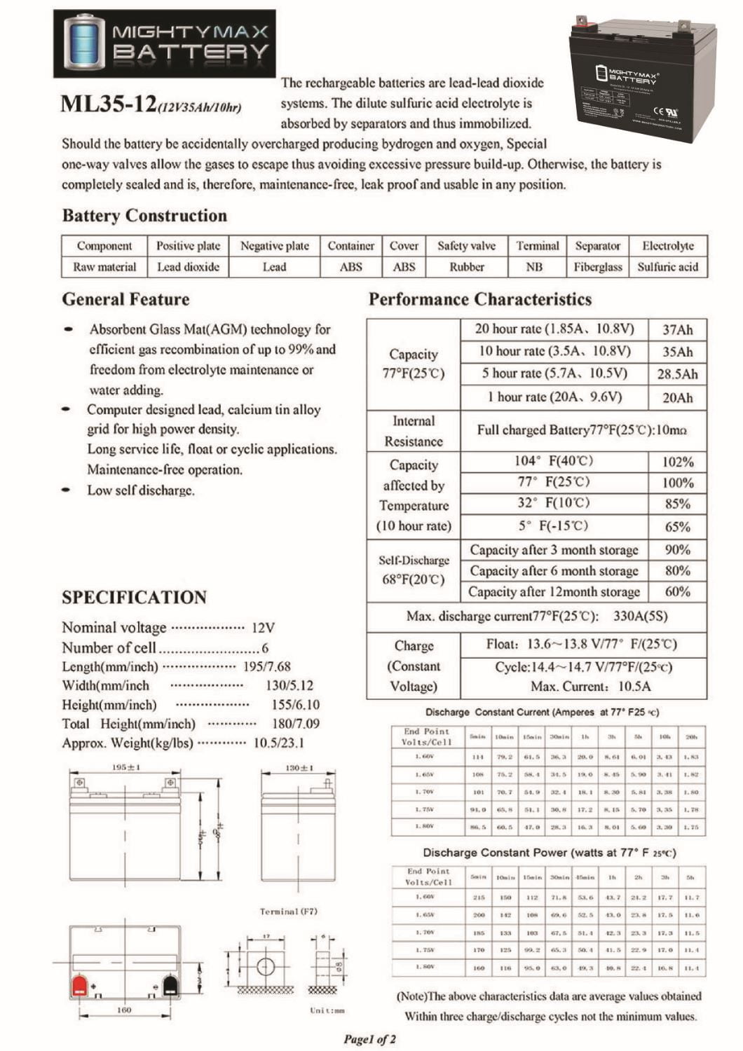 The ML35-12 is an Absorbent Glass Mat (AGM) technology with a valve regulated design, that can be used in enclosed and indoor environments without leaking or maintenance, providing a superior performance for thousands of models.