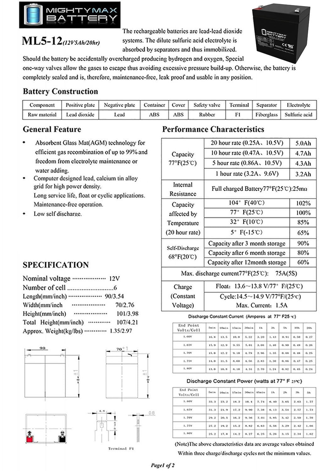 - ML5-12 SLA is a 12V 5AH Sealed Lead Acid (SLA) rechargeable maintenance free battery, Pack of 2 – UL Certified