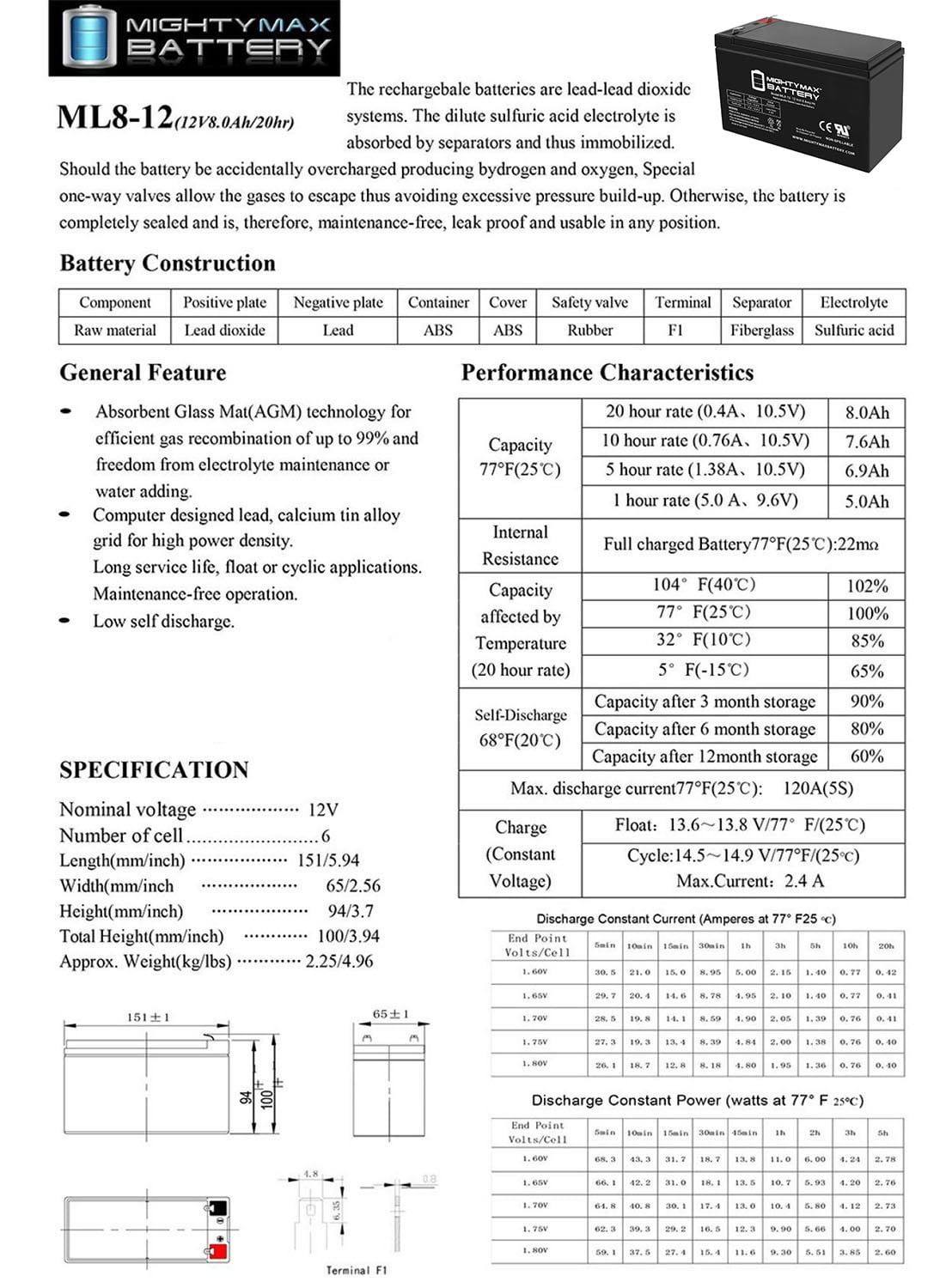 Delivering power when you need it, the Mighty Max ML8-12 12 Volt 8 AH uses a state of the art, heavy-duty, calcium-alloy grid that provides exceptional performance and service life in both float and cyclic applications.