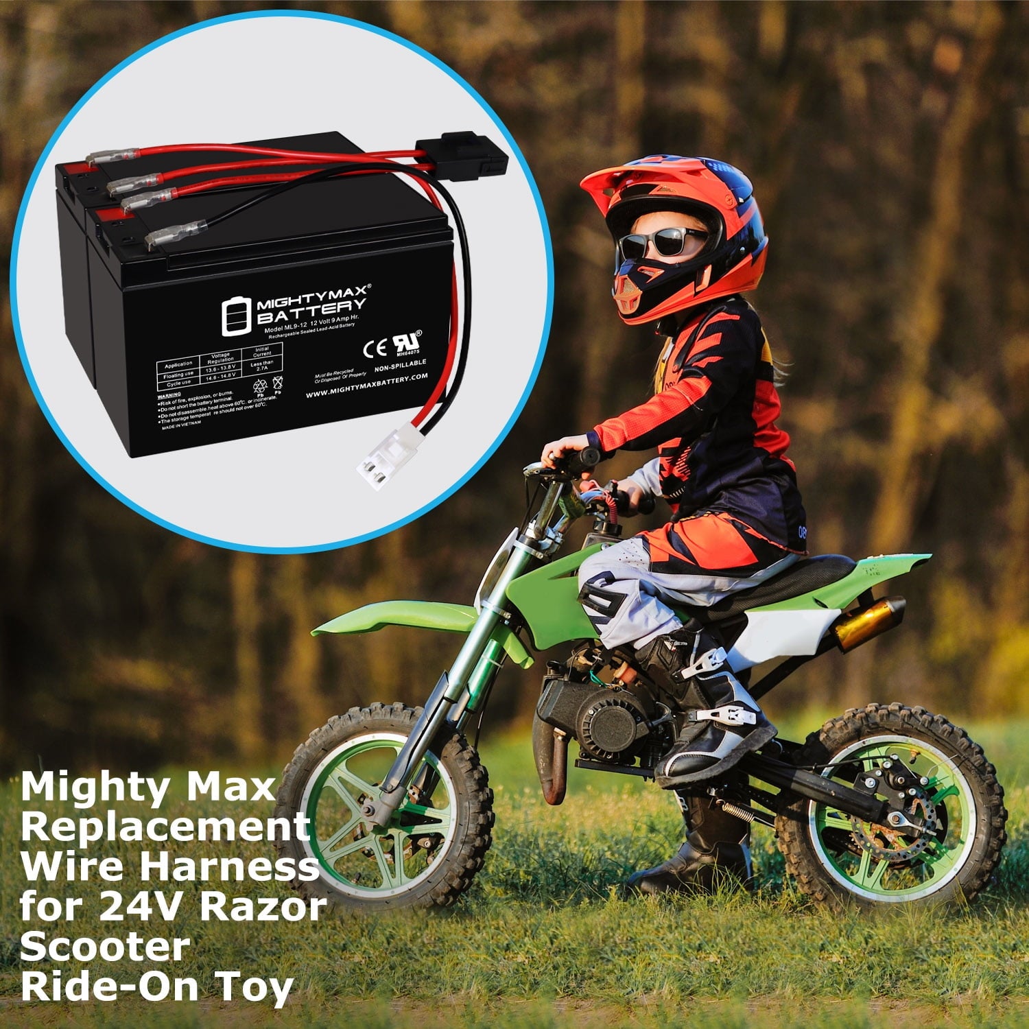 Mighty Max 12V 9Ah Sealed lead acid Battery and Wire harness Direct drop in replacement for 24 Volt Razor Scooter ride on toys. The harness comes equipped with everything needed to secure your battery to your little one’s ride on toy. Our harness has an added built-in safety measure with an easily accessible in-line safety fuse. Simple, Safe, and easy to assemble we’ll have your kids enjoying the outdoors in no time.