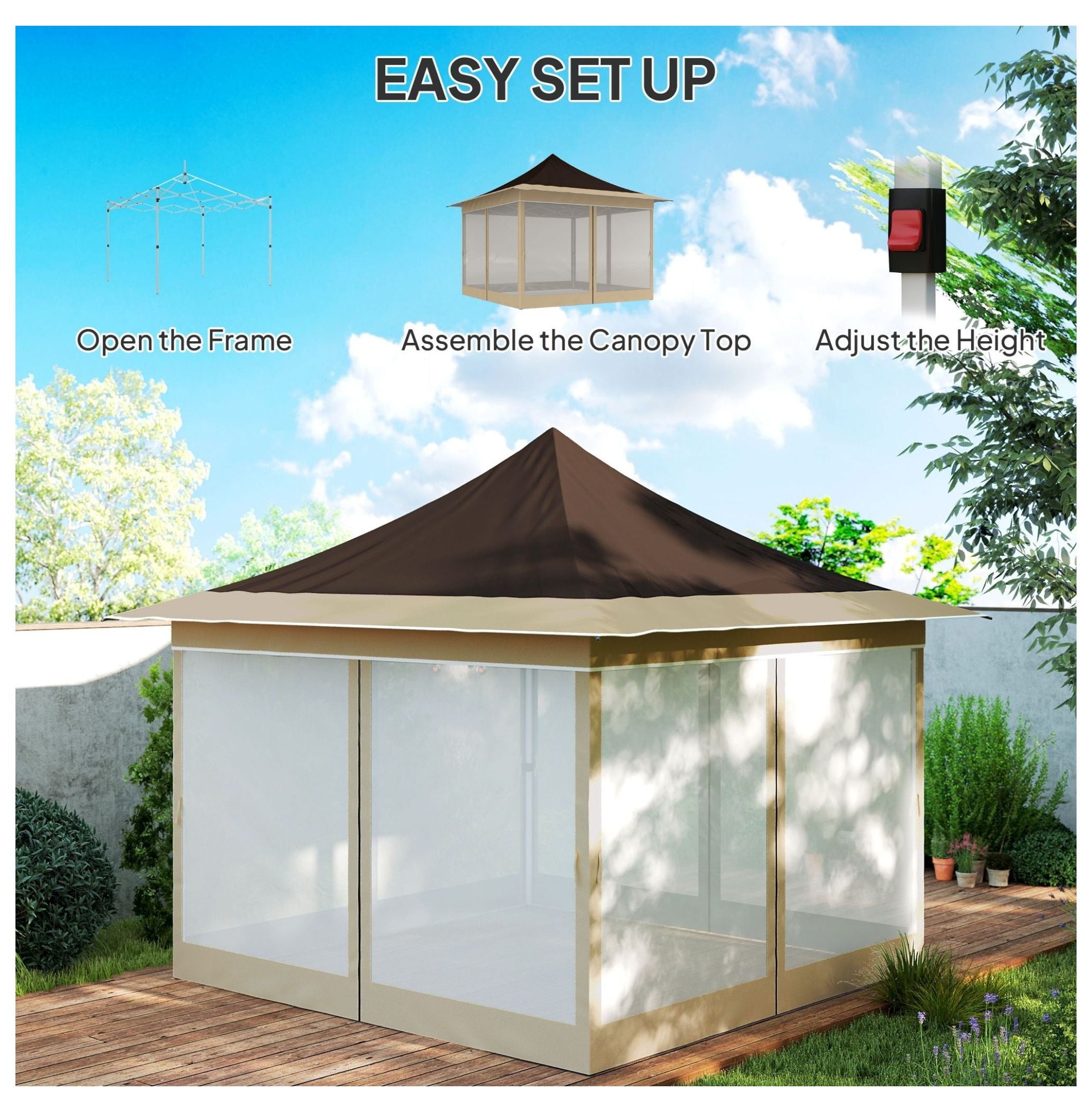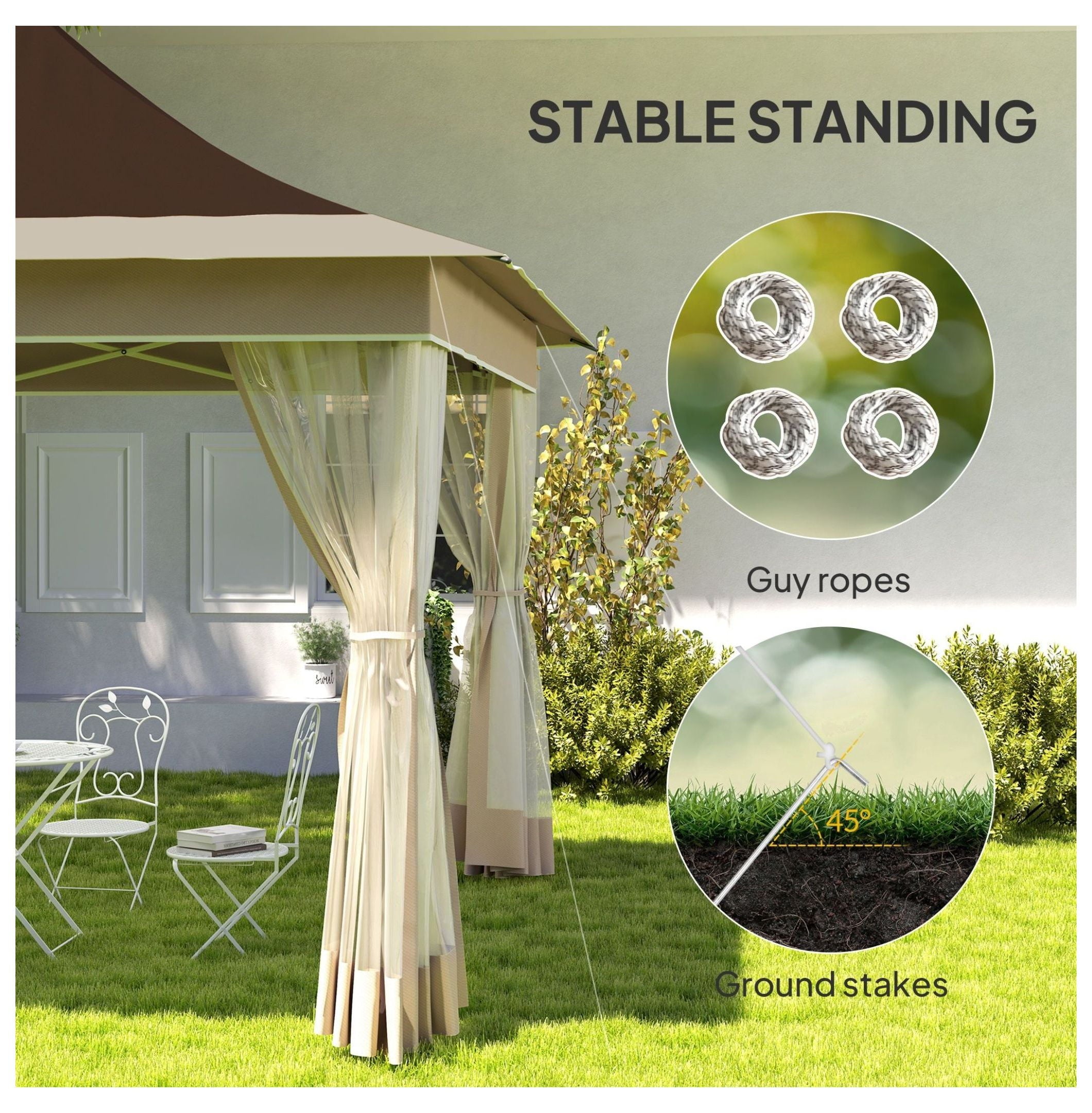 - 【Stable & Secure Design】: Constructed with a powder-coated metal frame for durability and stability; includes eight ground stakes and four guy ropes to securely anchor the canopy during outdoor use; suitable for light wind conditions