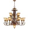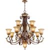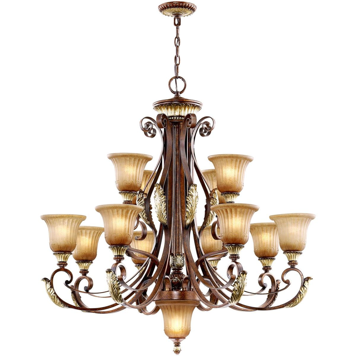 Bring a touch of traditional elegance to your space with the Traditional Chandelier in Verona Bronze with Aged Gold Leaf Accents. This exquisite lighting fixture is exclusively crafted with rustic art glass and features a resin and steel construction for durability. With a dimension of 40 inches in diameter and 39 inches in height, it is sure to make a statement in any room. The chandelier comes with a combination of medium, candelabra, and E12 bulb bases, requiring a total of 13 bulbs. It includes a 6-foot chain and 12-foot wire for easy installation. Suitable for both dry and damp locations, this chandelier adds a warm and inviting glow to your space. The bottom decorative light requires a 7W Cand Base Lamp for a charming accent. Please note that professional installation is recommended due to its heavy mounting. You can also order an additional 3-foot chain for added flexibility. Transform your space with this stunning Traditional Chandelier.