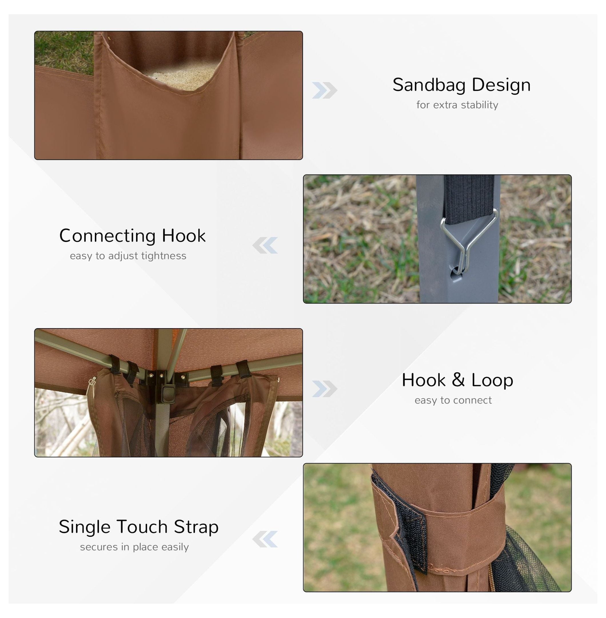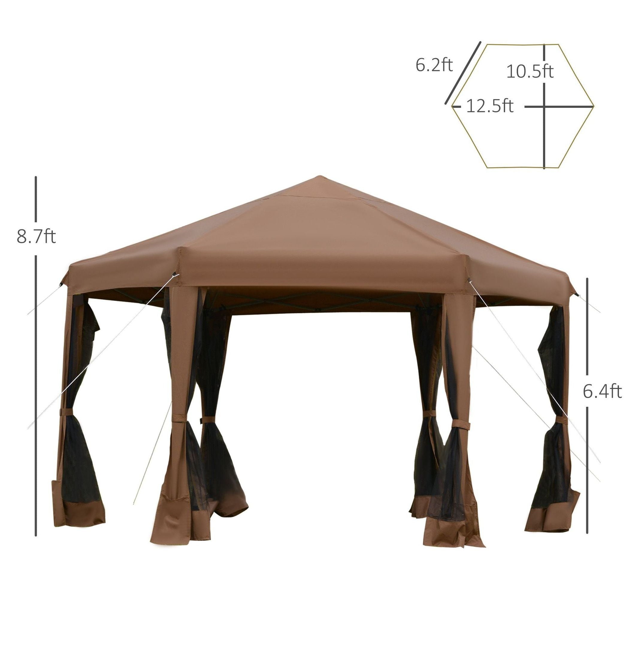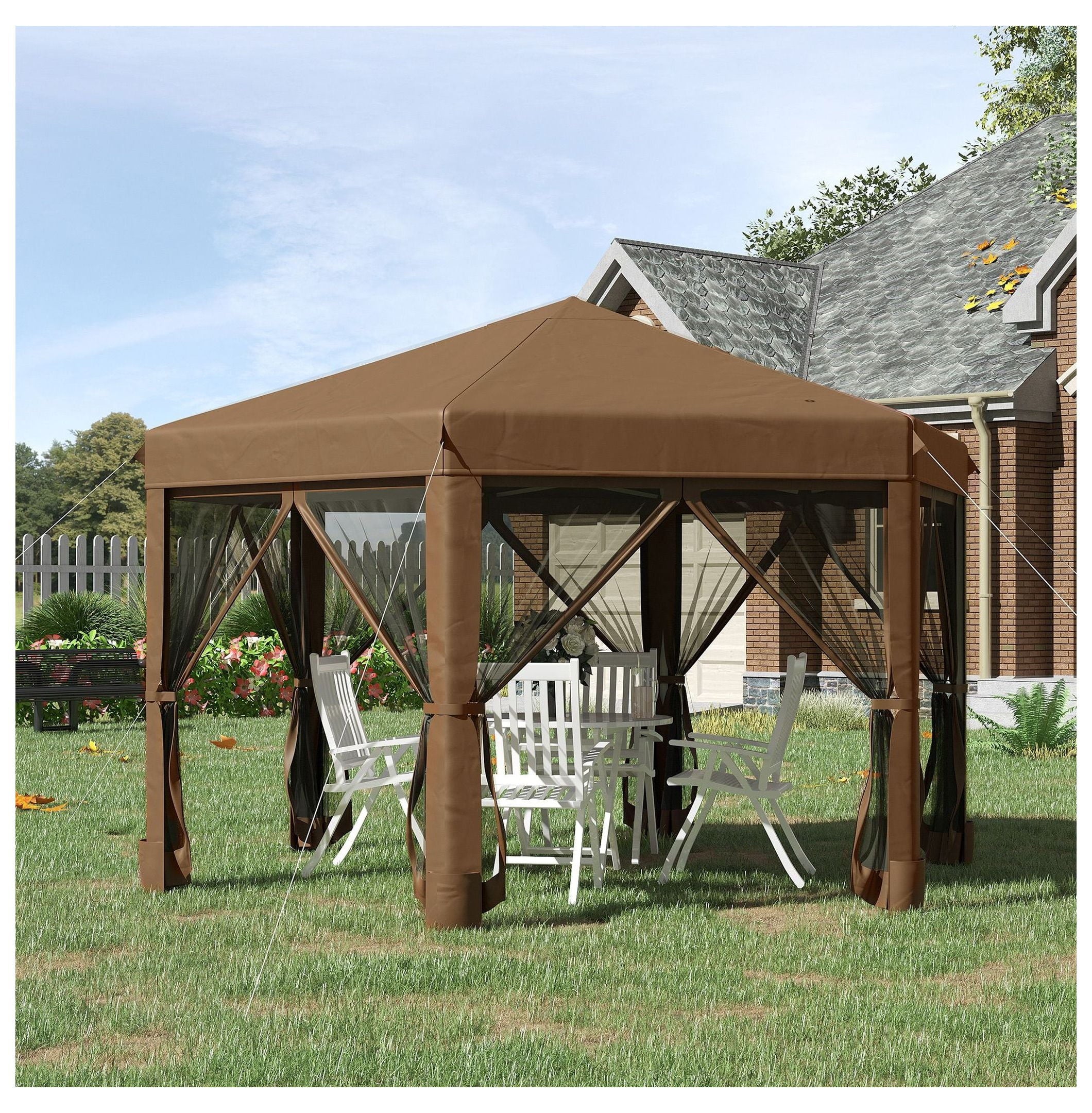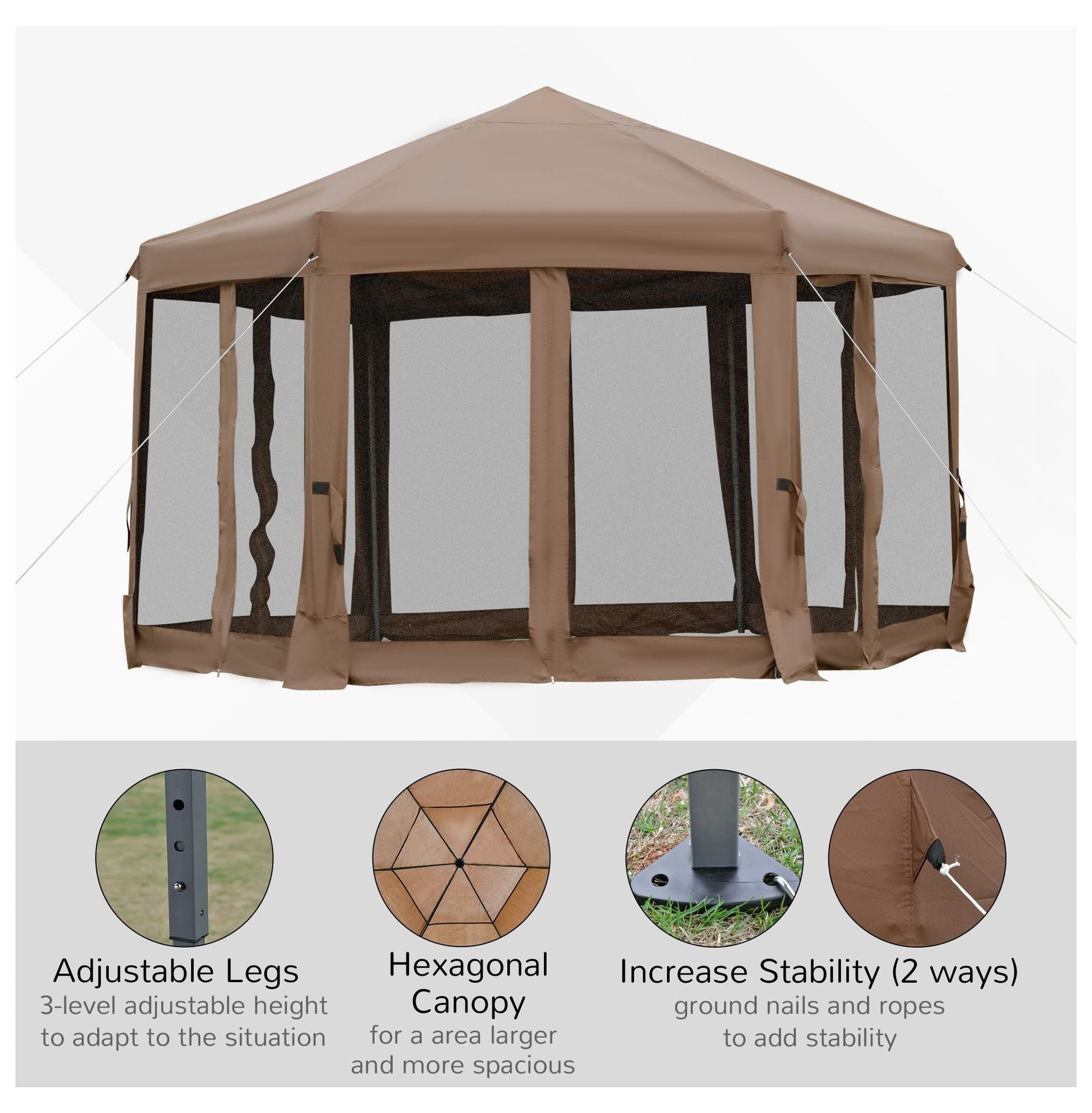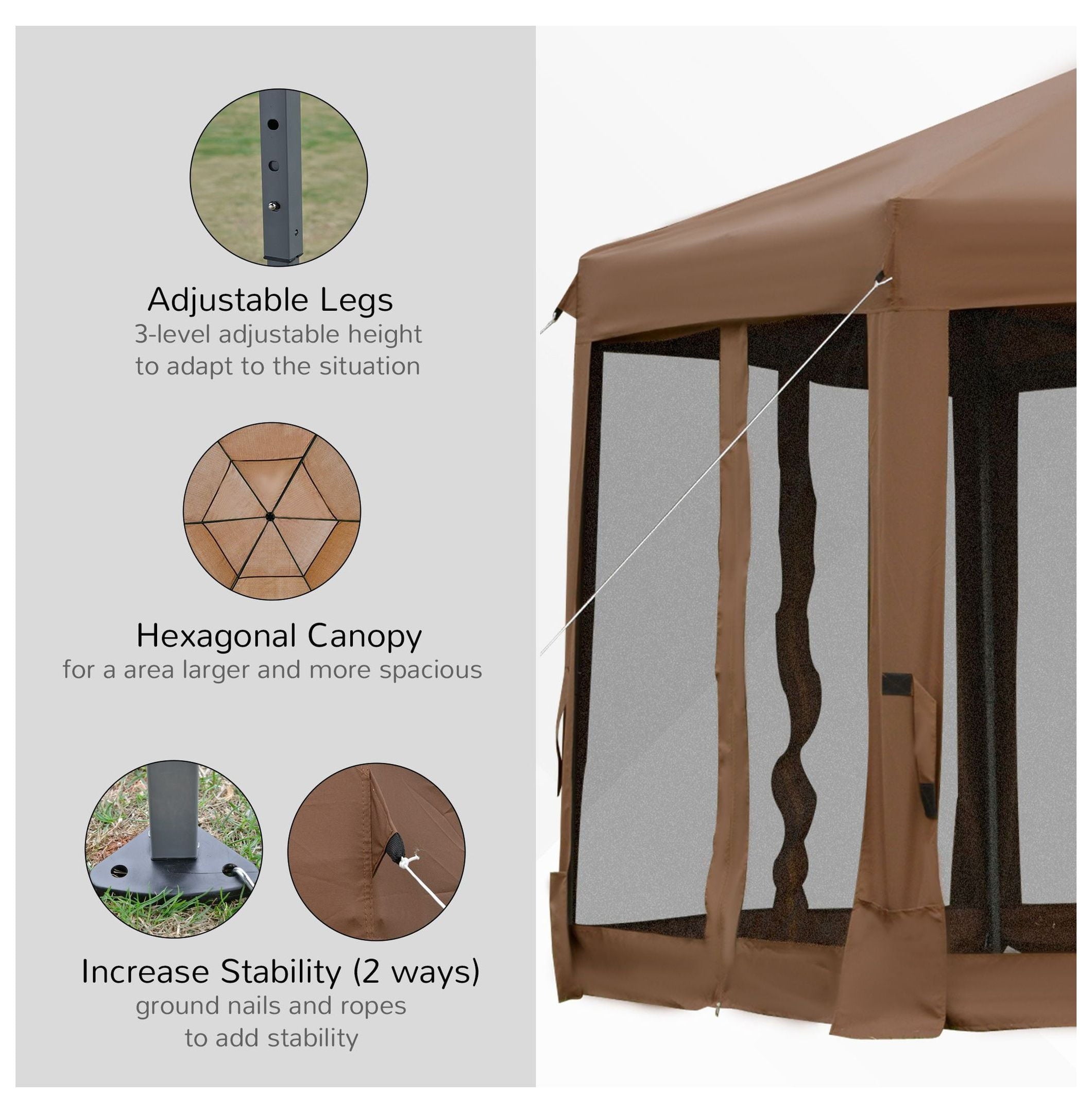 13x13 Pop Up Canopy, Hexagonal Brown Canopy with Mesh Walls - Adjustable Outdoor Camping Tent with Steel Frame & Stakes