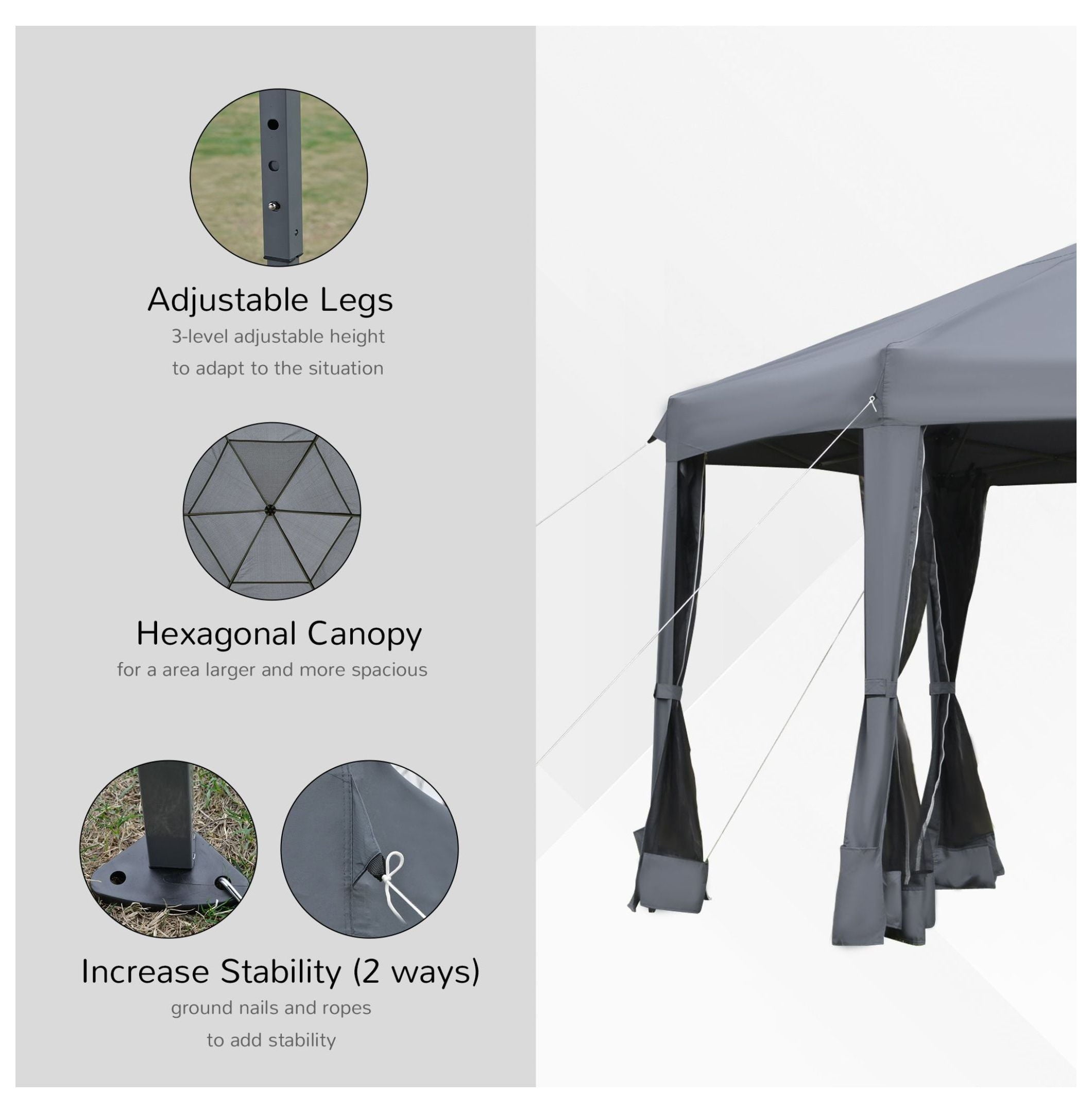 - 【Adjustable Height & Stability】: Features 3-level adjustable legs allowing for customized height settings; six sand slots in the sidewalls provide added weight and stability; included guy ropes and ground stakes ensure secure anchoring in various conditions