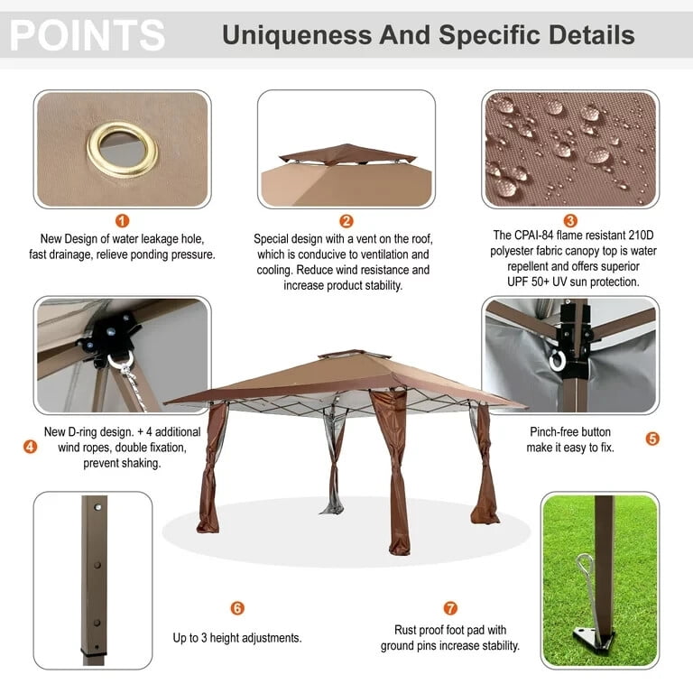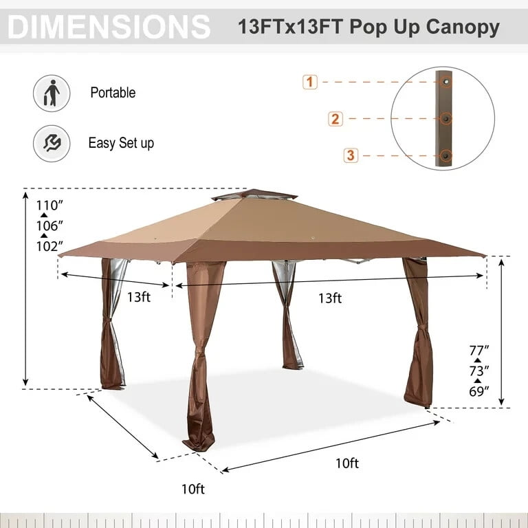 13 x 13 ft. canopy for 169 sq. ft. of shade, accommodate about 19 people
