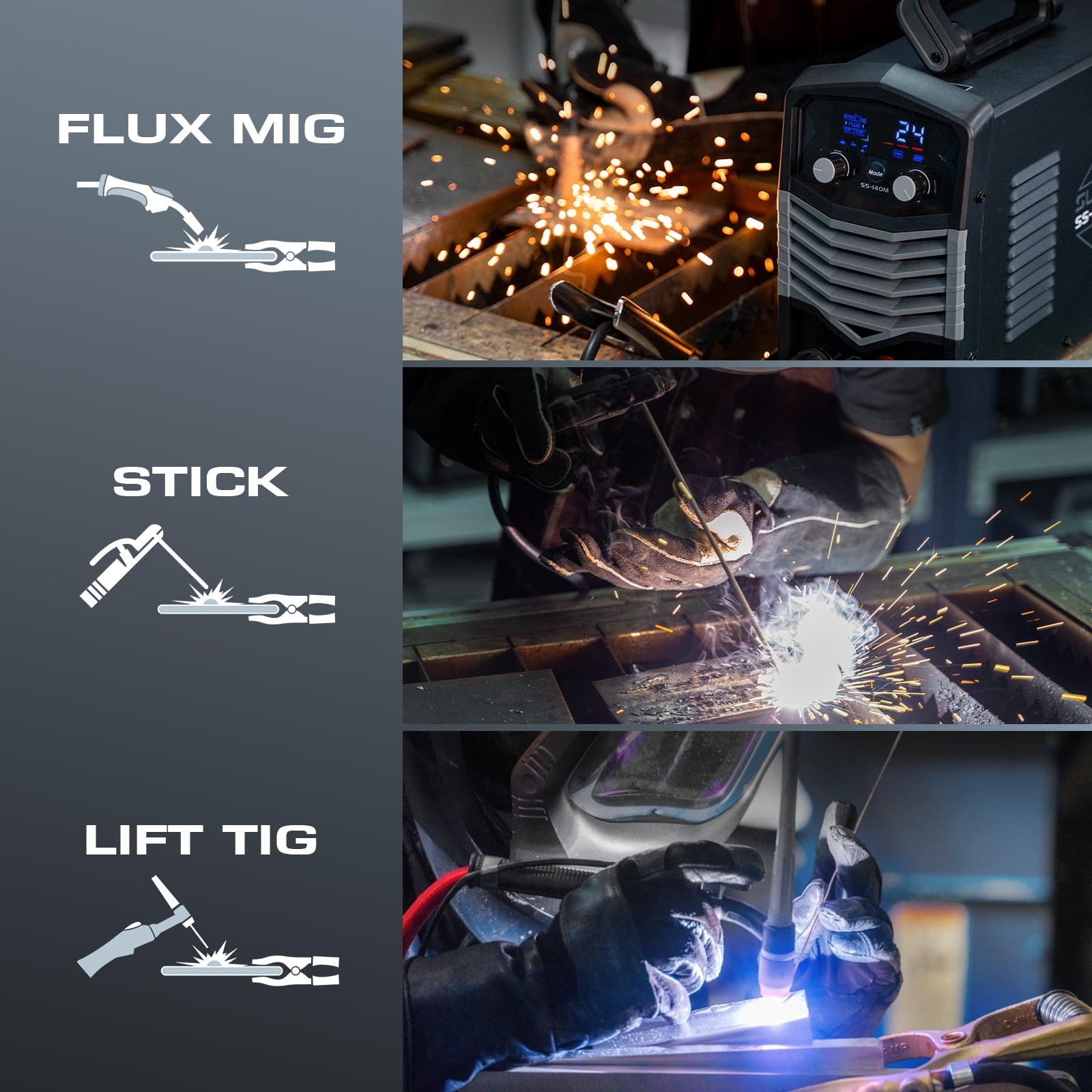 - Versatile 3in1 functionality: supports MIG, Stick, and Lift TIG welding processes