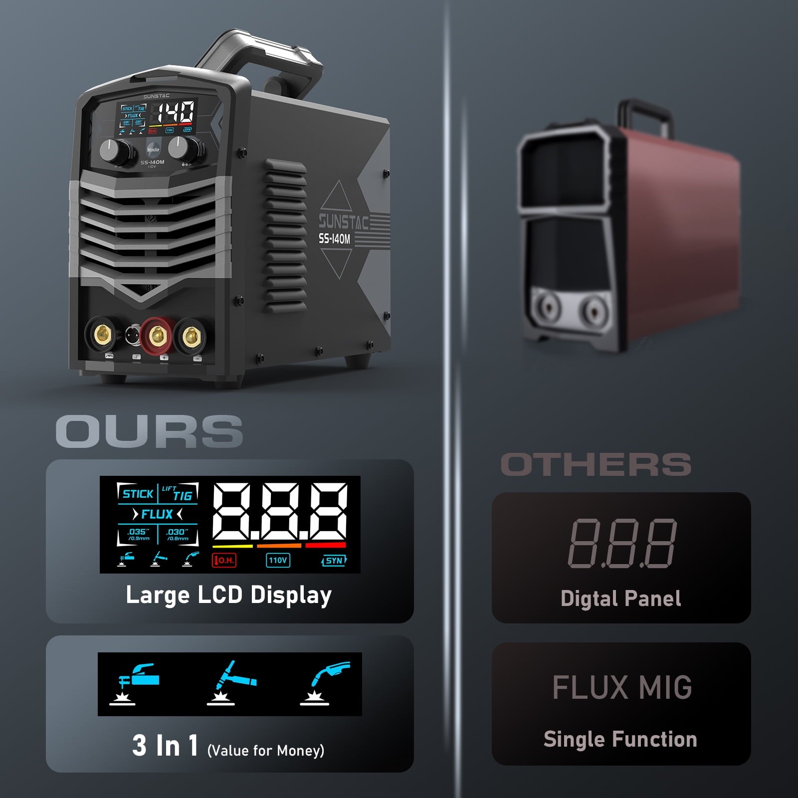 【Intelligent Synergic Control】: Sunstac welder is tailored for who are looking for a simple and user-friendly welding machine. With its intelligent synergic mode, the wire feeding speed will be automatically adjusted by regulating the current.