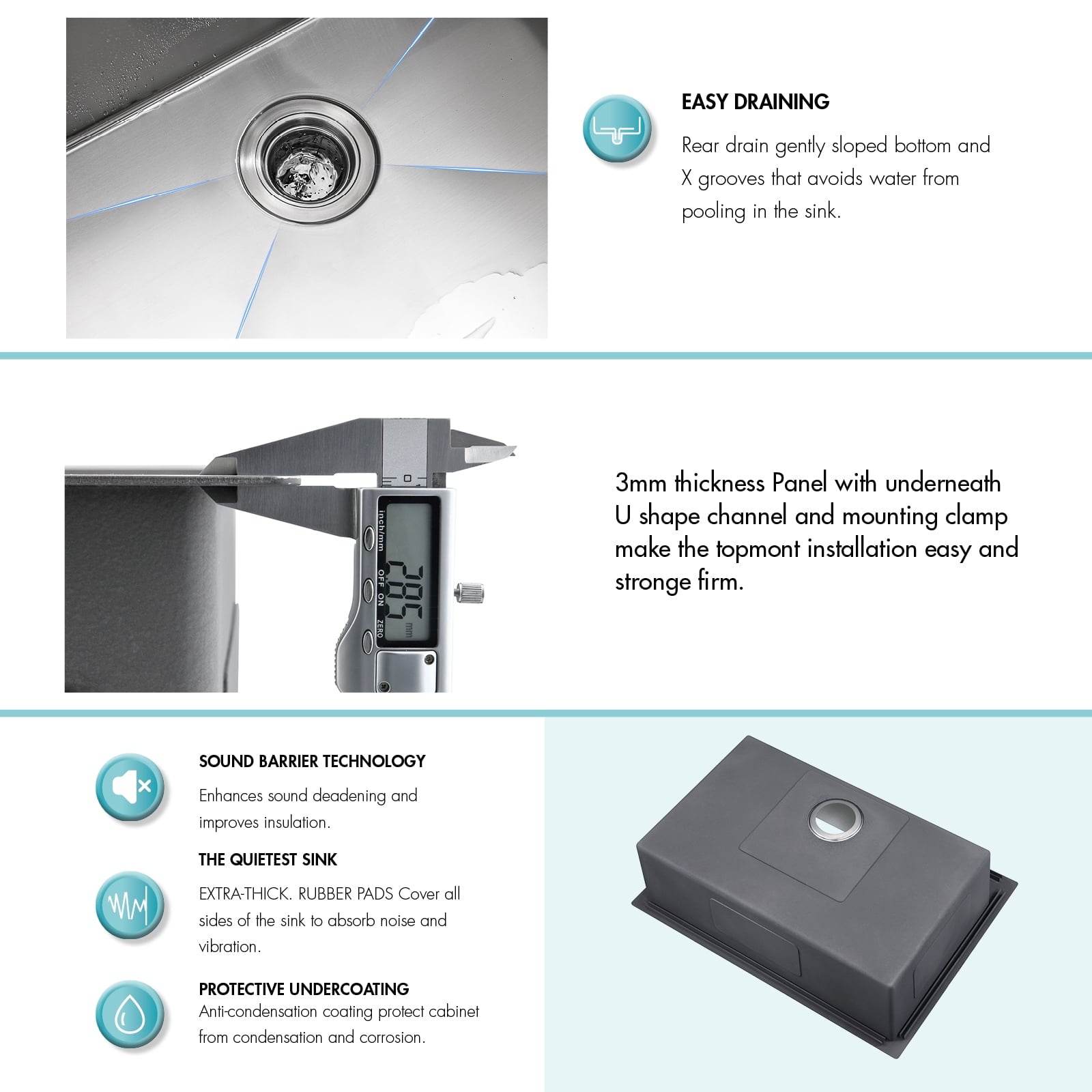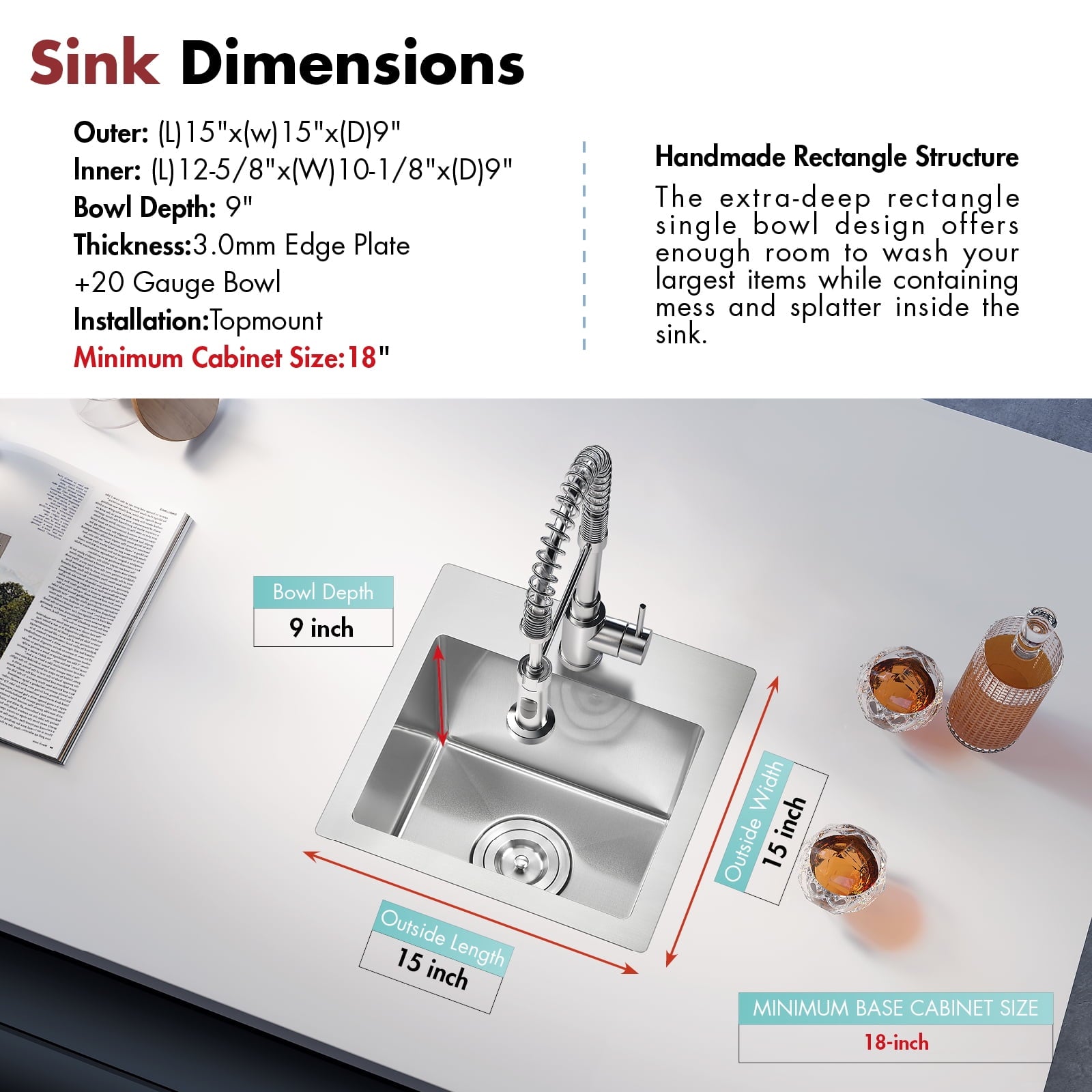 - 15IN SINGLE BOWL DROP IN SINK: 15″ L x 15″ W (front-to-back) x 9″, 3.0mm edge plate and 20 gauge bowl stainless steel thickness.