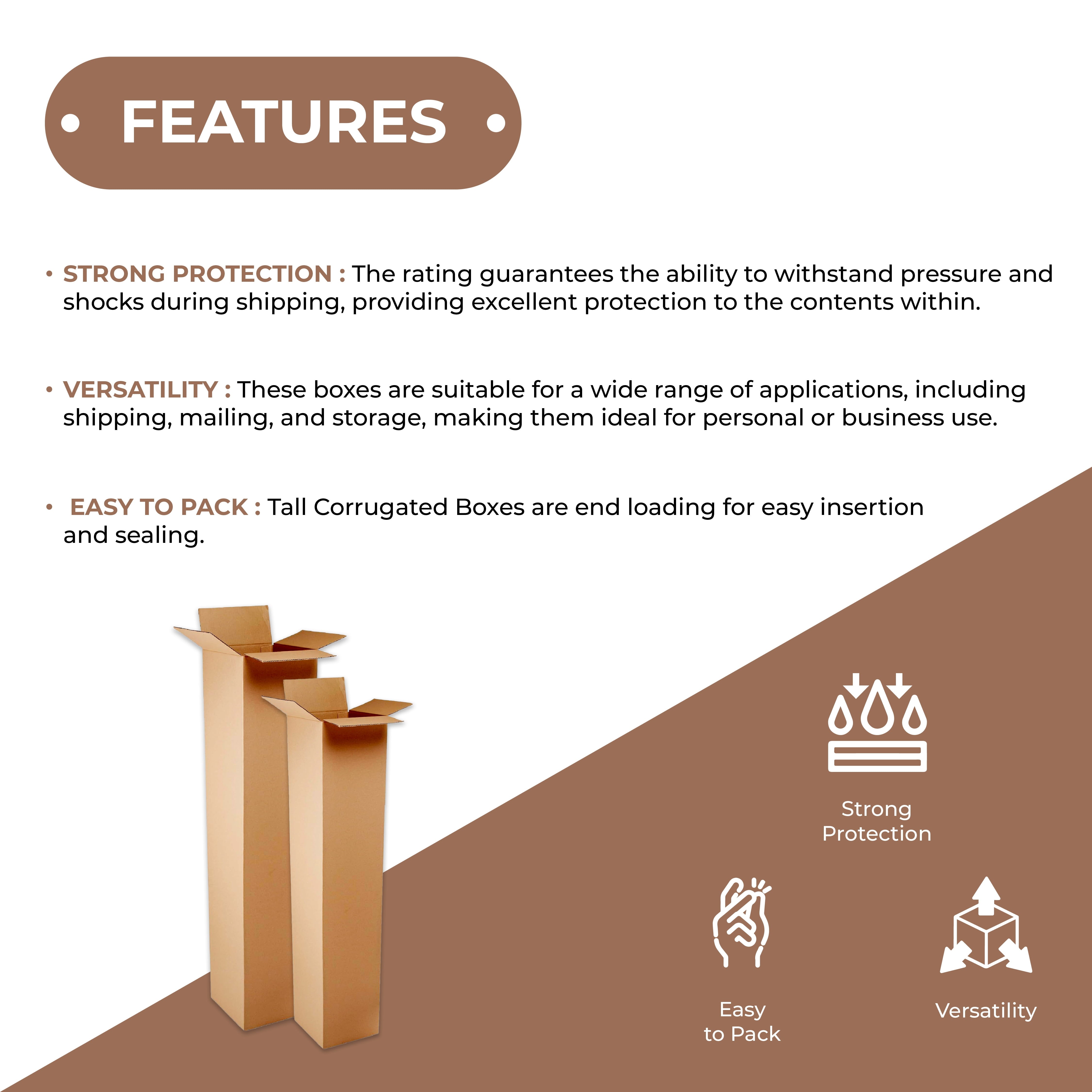 8″ x 8″ x 60″ Tall Corrugated Boxes, 15/Case: Tall Corrugated Shipping/Moving/Packing Boxes, sold in cases of 15, are specifically designed for packing and shipping long, tall items such as trophies, shelving, fishing rods, or other elongated products. With an end-loading design, these boxes make insertion and sealing simple and efficient. Constructed from strong ECT-32 kraft corrugated material, they offer reliable protection during transit and can even be used as an alternative to mailing tubes. The boxes ship flat to save on storage and shipping costs.