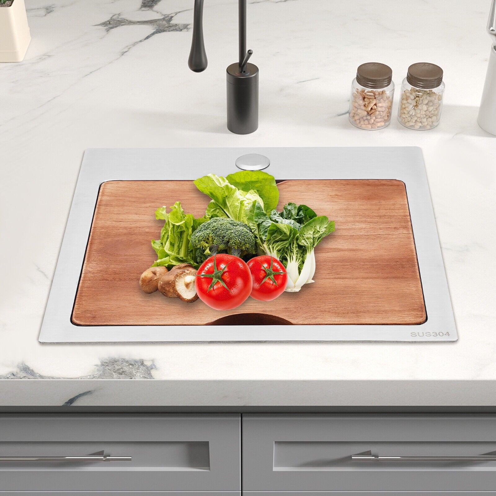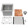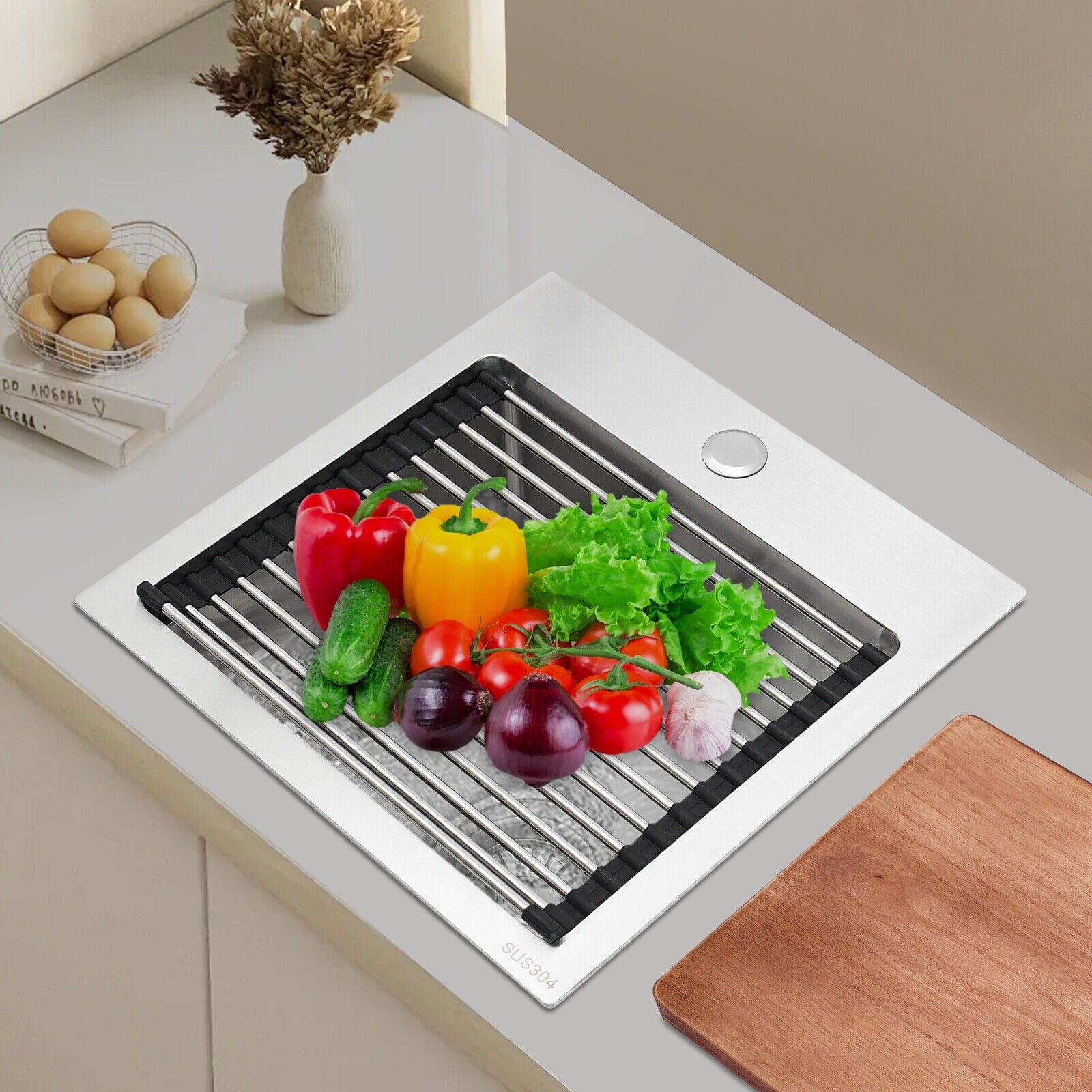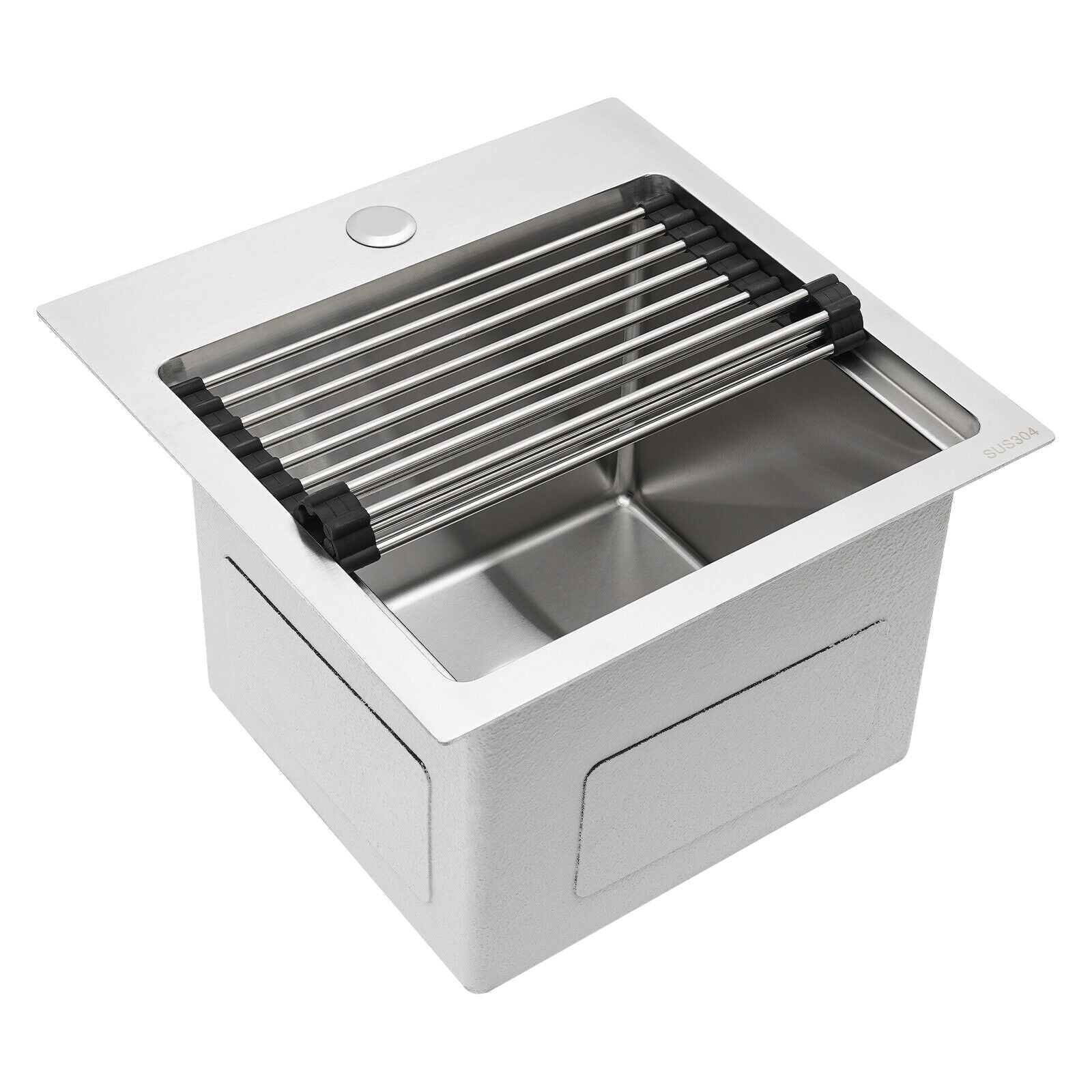 Made of high-quality 304 stainless steel, this kitchen sink is exquisitely crafted, wear-resistant, and corrosion-resistant. Its enlarged and deepened sink not only alleviates the splashing problem but also increases space utilization for cleaning numerous cookwares. The design with a cutting board, bottom rinse grid, and roll-up dish drying rack allows you to wash and cut fruits and vegetables simultaneously, with which you can enjoy a more convenient life.