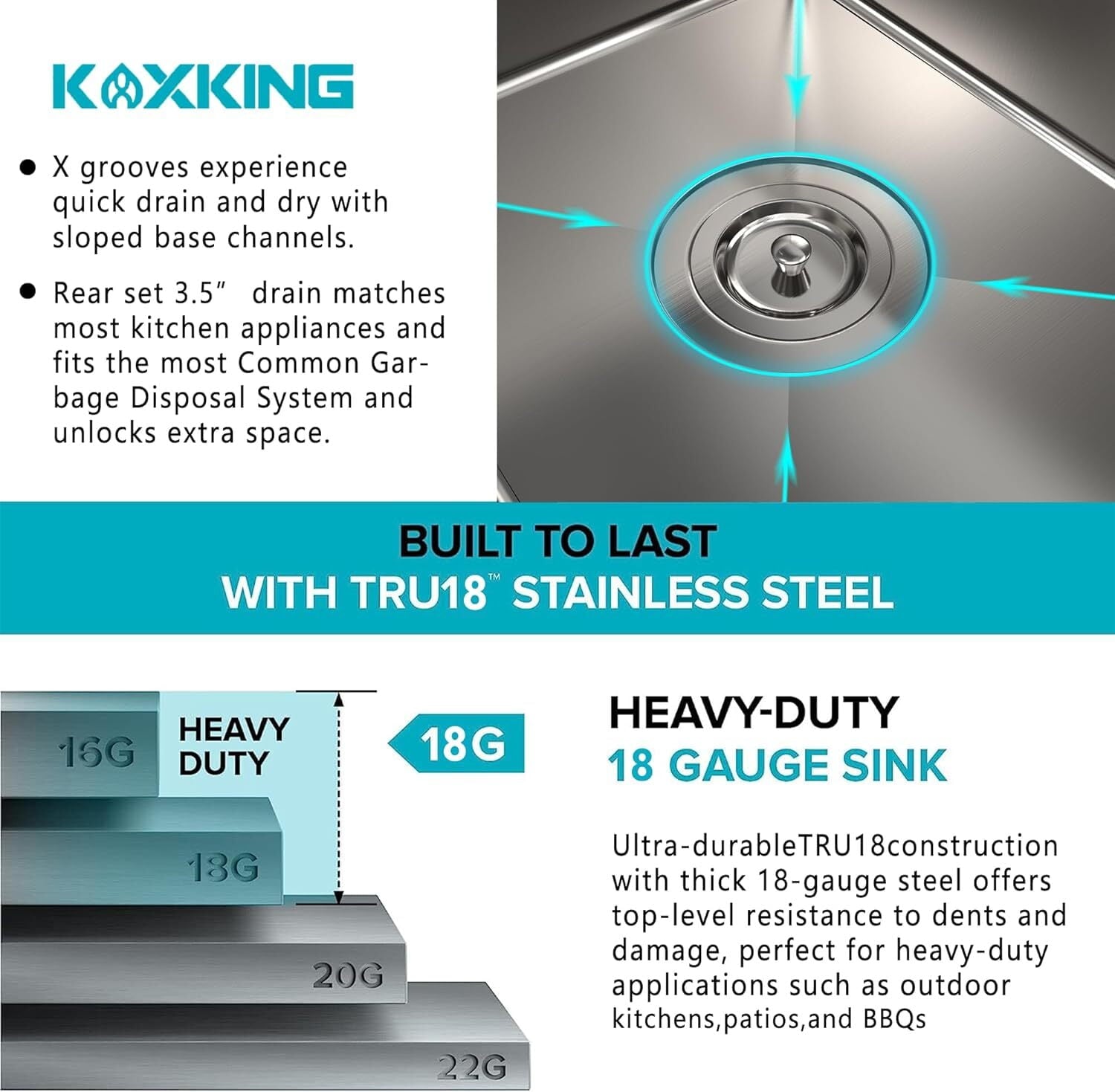 KITCHEN SINK DIMENSION: Basin size 13″(L) x 11″(W) x 9″(D). External dimensions 15″(L) x 15″(W) x 9″(D). Standard 3.5″ drain openings will fit any garbage disposal unit.
