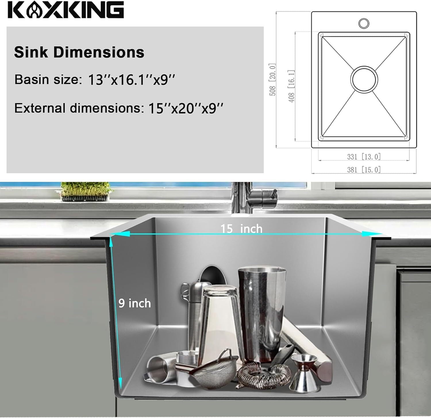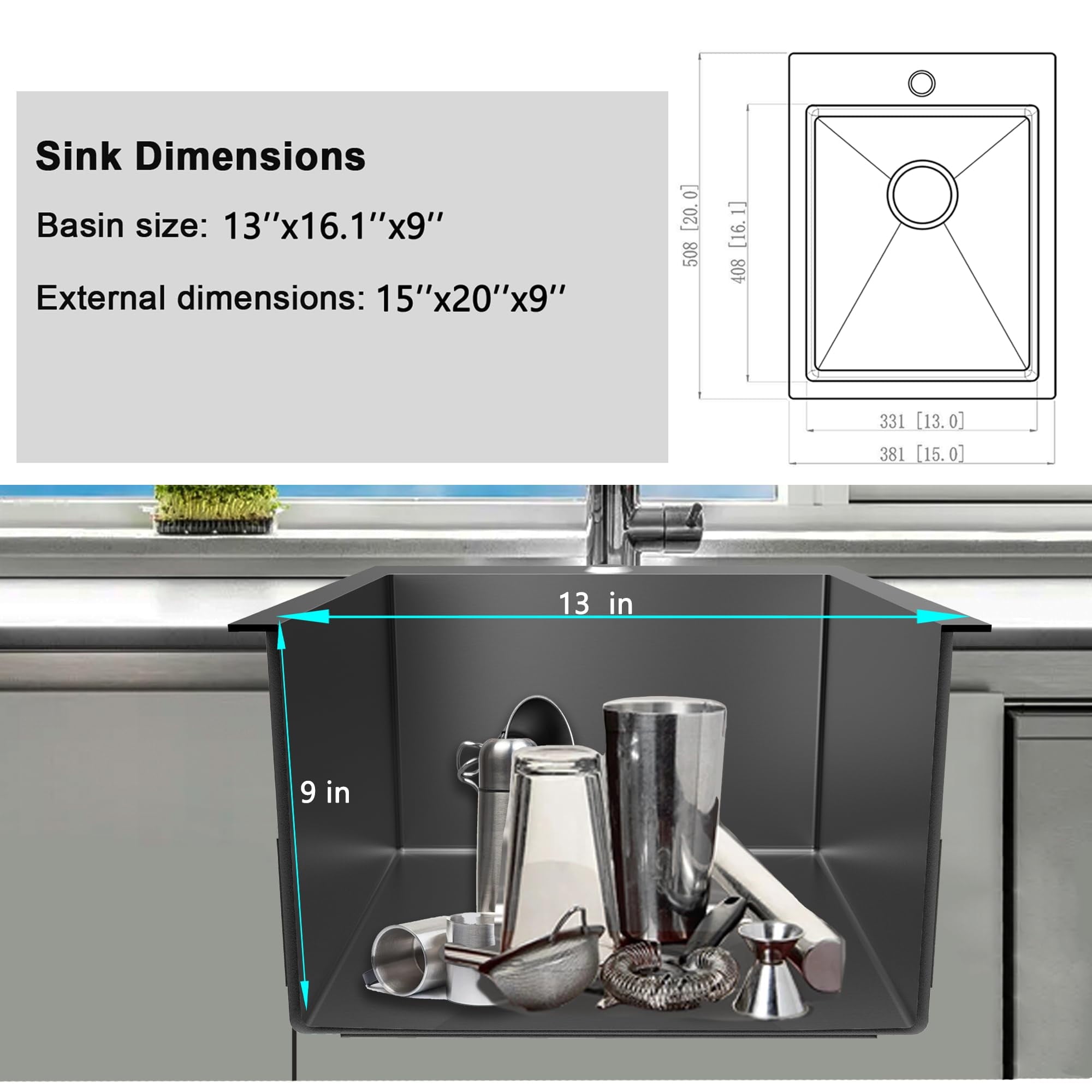 - KITCHEN SINK DIMENSION: Basin size 13″(L) x 11″(W) x 9″(D). External dimensions 15″(L) x 15″(W) x 9″(D). Standard 3.5″ drain openings will fit any garbage disposal unit.