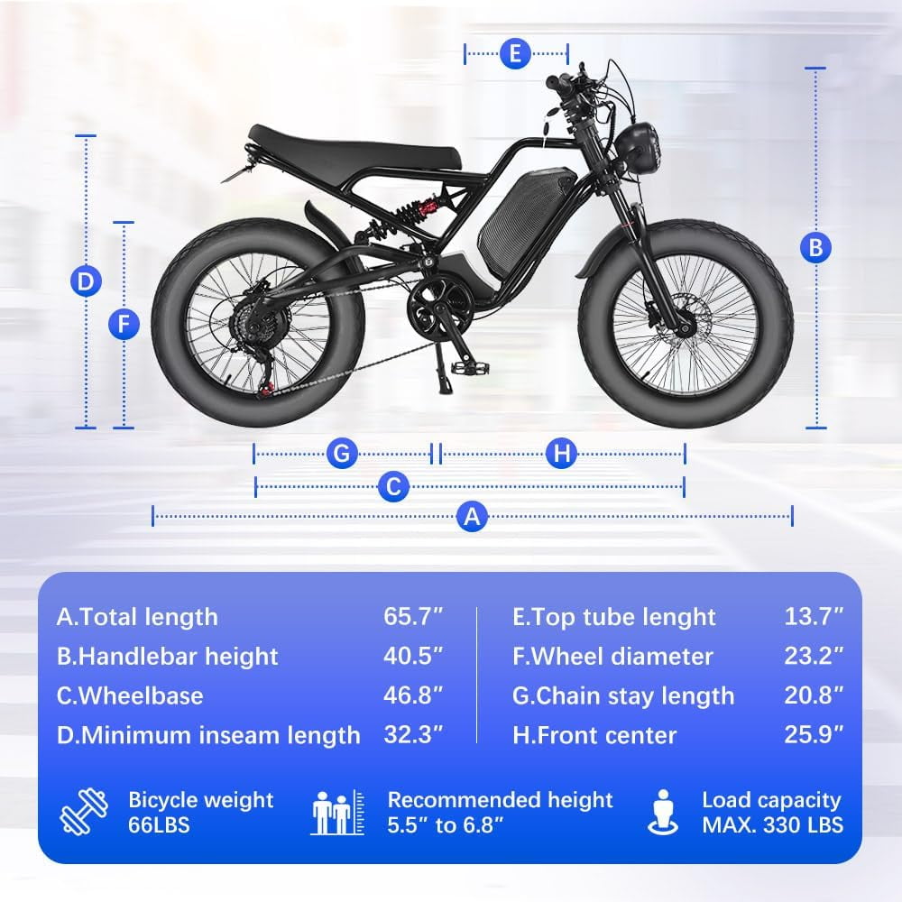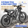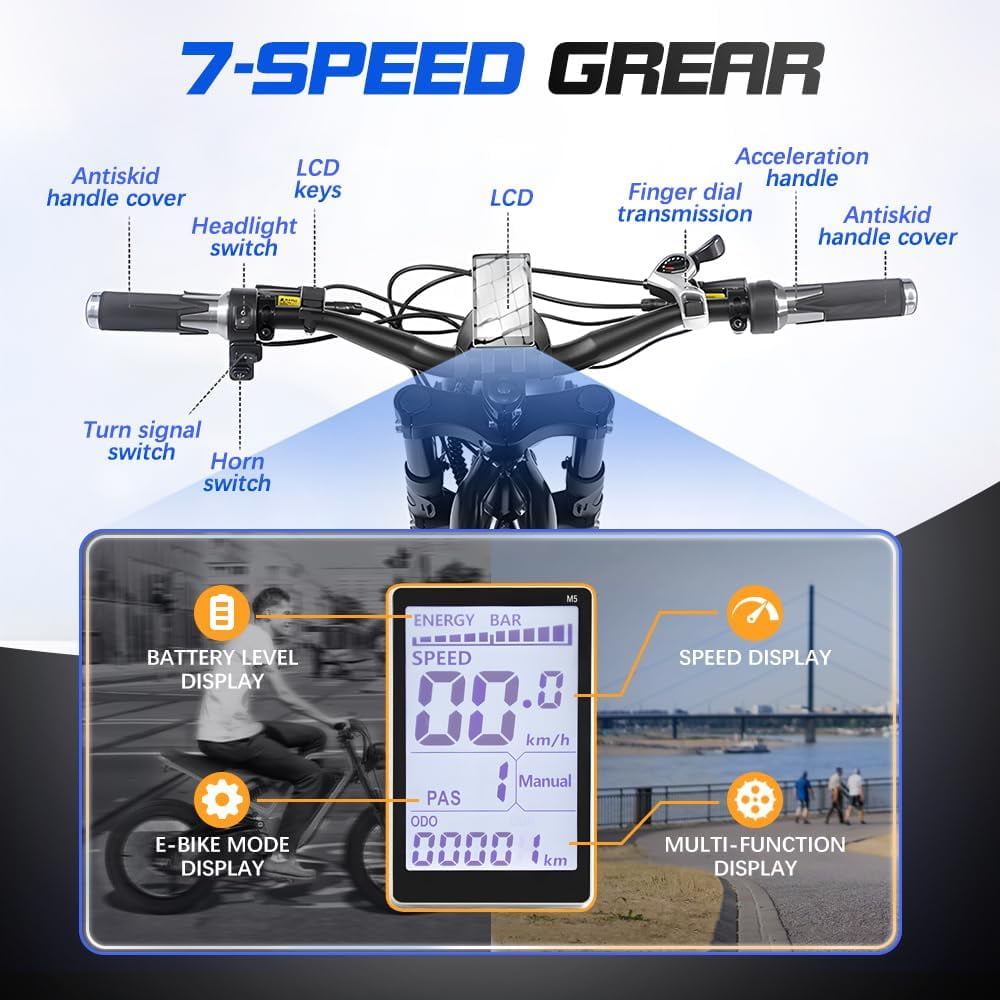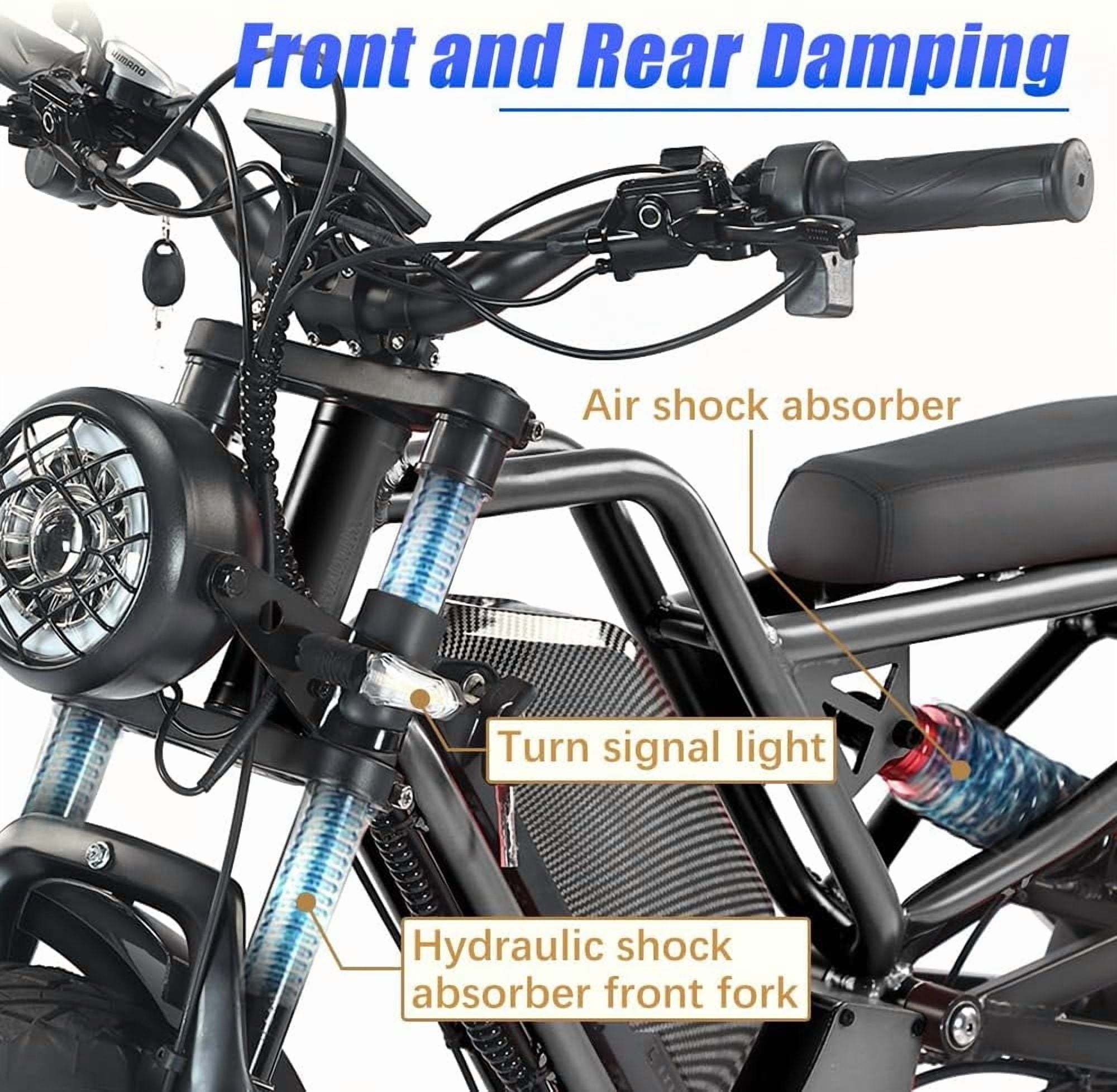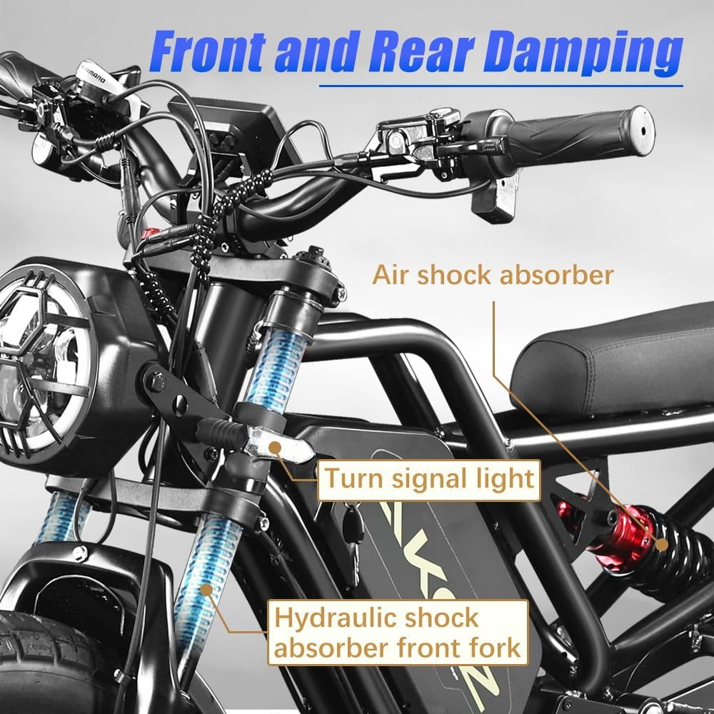 - 【Easy to Assemble and High Quality】This electric bike arrives 80% pre-assembled for quick and easy setup. Built with a durable yet lightweight 6061 aluminum alloy frame, it ensures long-lasting performance and effective shock absorption. Outfitted with headlights, an aluminum suspension fork, hydraulic brakes, and dual suspension damping, it delivers a smooth, safe, and comfortable riding experience across different terrains.