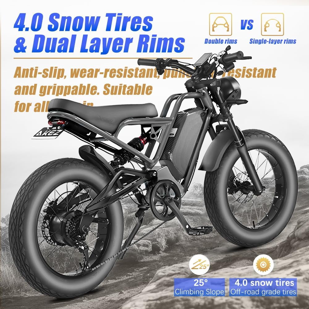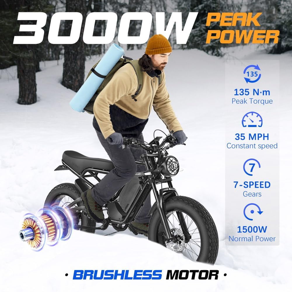 - 【135N.M Peak 3000W Brushless Motor】 Powered by a rear-mounted 1500W motor with peak output up to 3000W, this eBike reaches speeds of 35 mph or more for thrilling performance. Combined with 20″ × 4.0″ puncture-resistant fat tires, it offers excellent grip and stability, making it easy to handle mountain trails, rough paths, and diverse terrains with confidence.