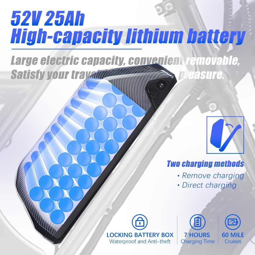- 【Upgraded Removable 48V18A】 Large Battery This eBike is equipped with an upgraded 48V 18Ah removable battery that delivers reliable, long-lasting power for daily rides. It fully charges in 6–8 hours, helping reduce downtime, and is built for extended service life to meet long-term use. The design also supports compatibility with a 52V battery, giving you the option for even greater performance and longer range.