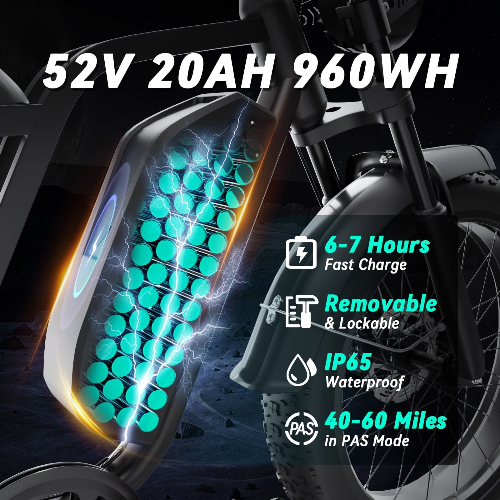 • 52V 20Ah Large Capacity Battery: The detachable large capacity battery offers a long riding range of 40-60 miles in pedal assist mode, sufficient for adventures . Two charging methods are available: charging the battery in the bike or removing the battery for charging