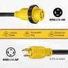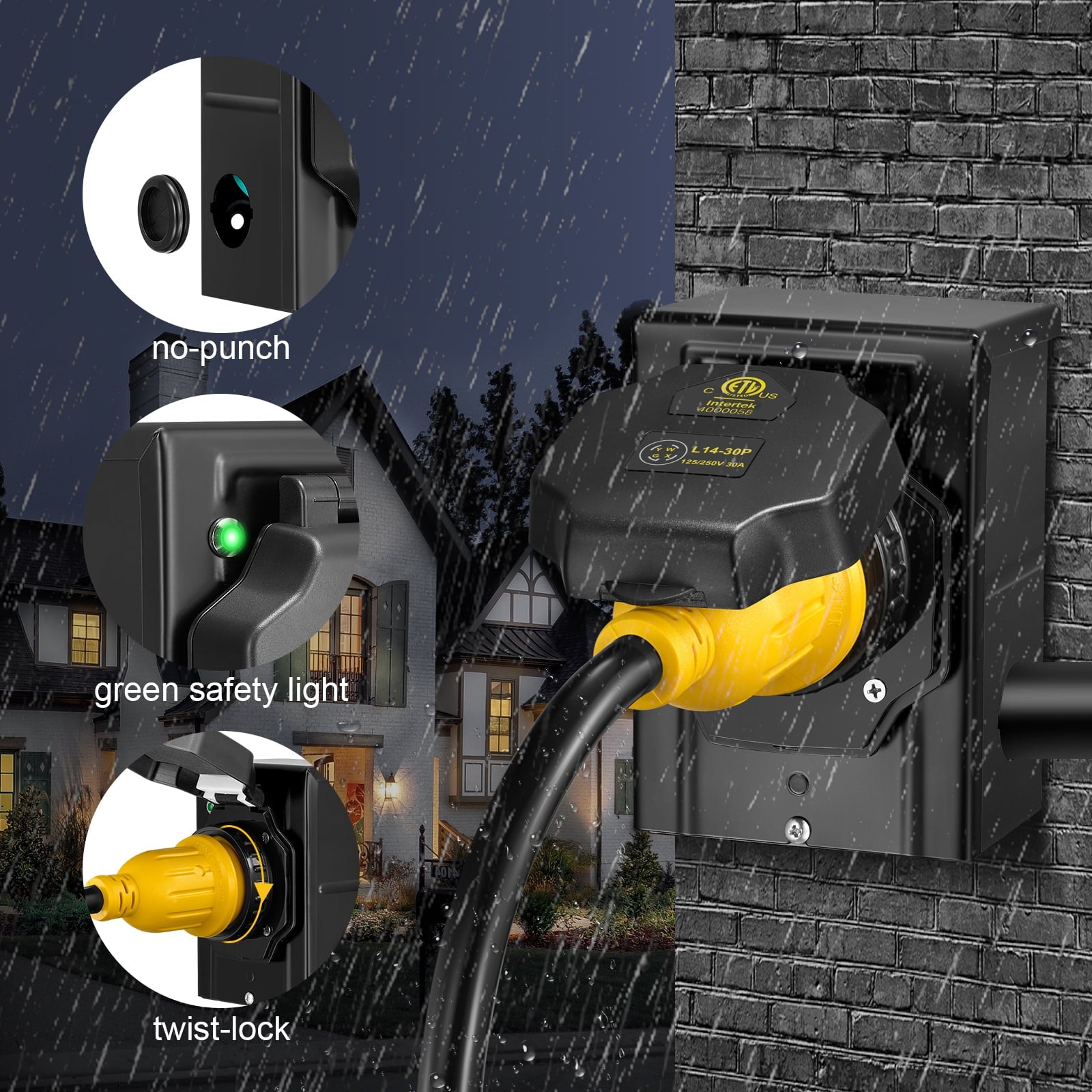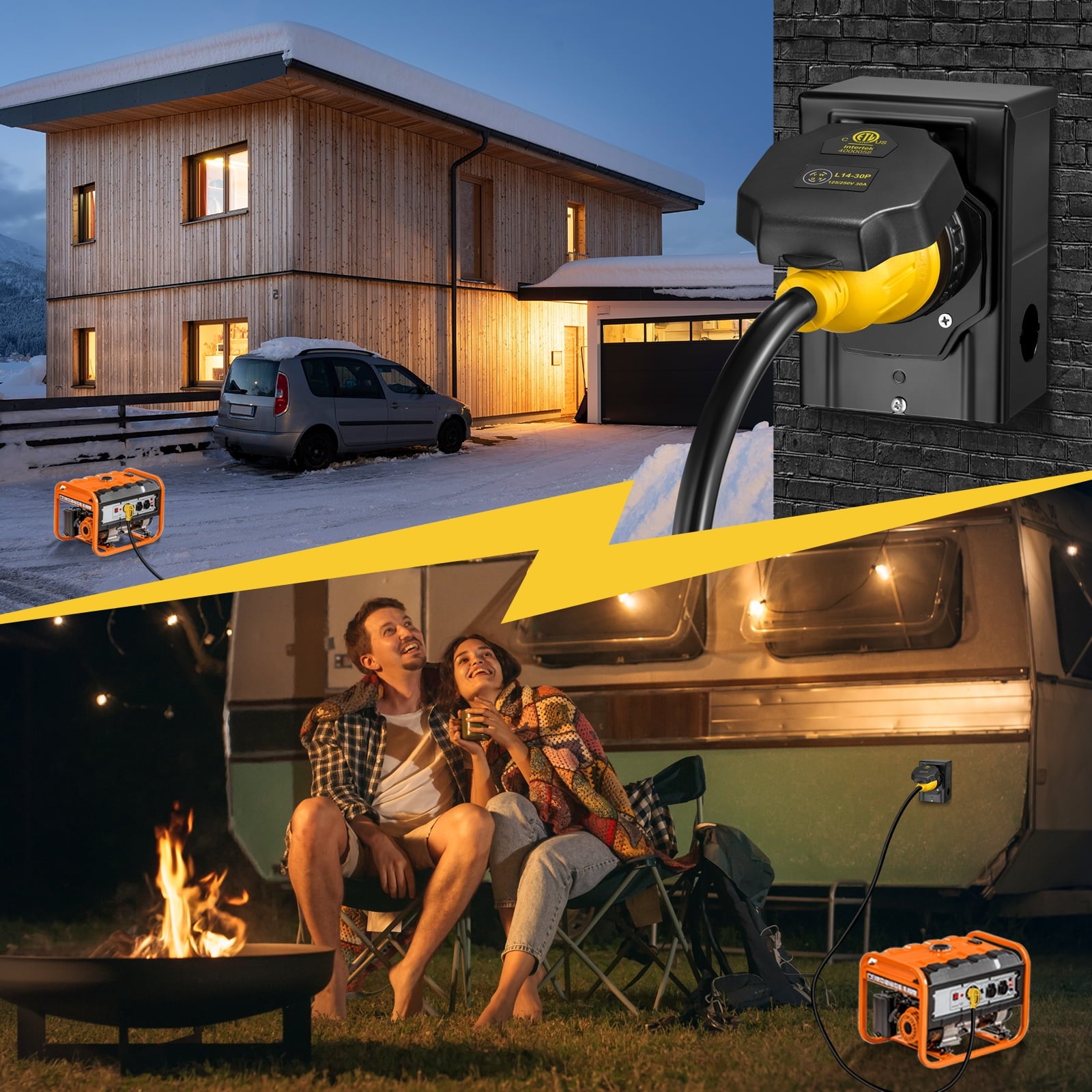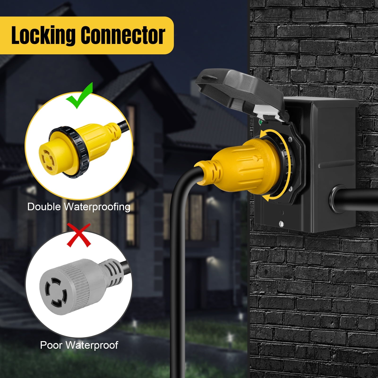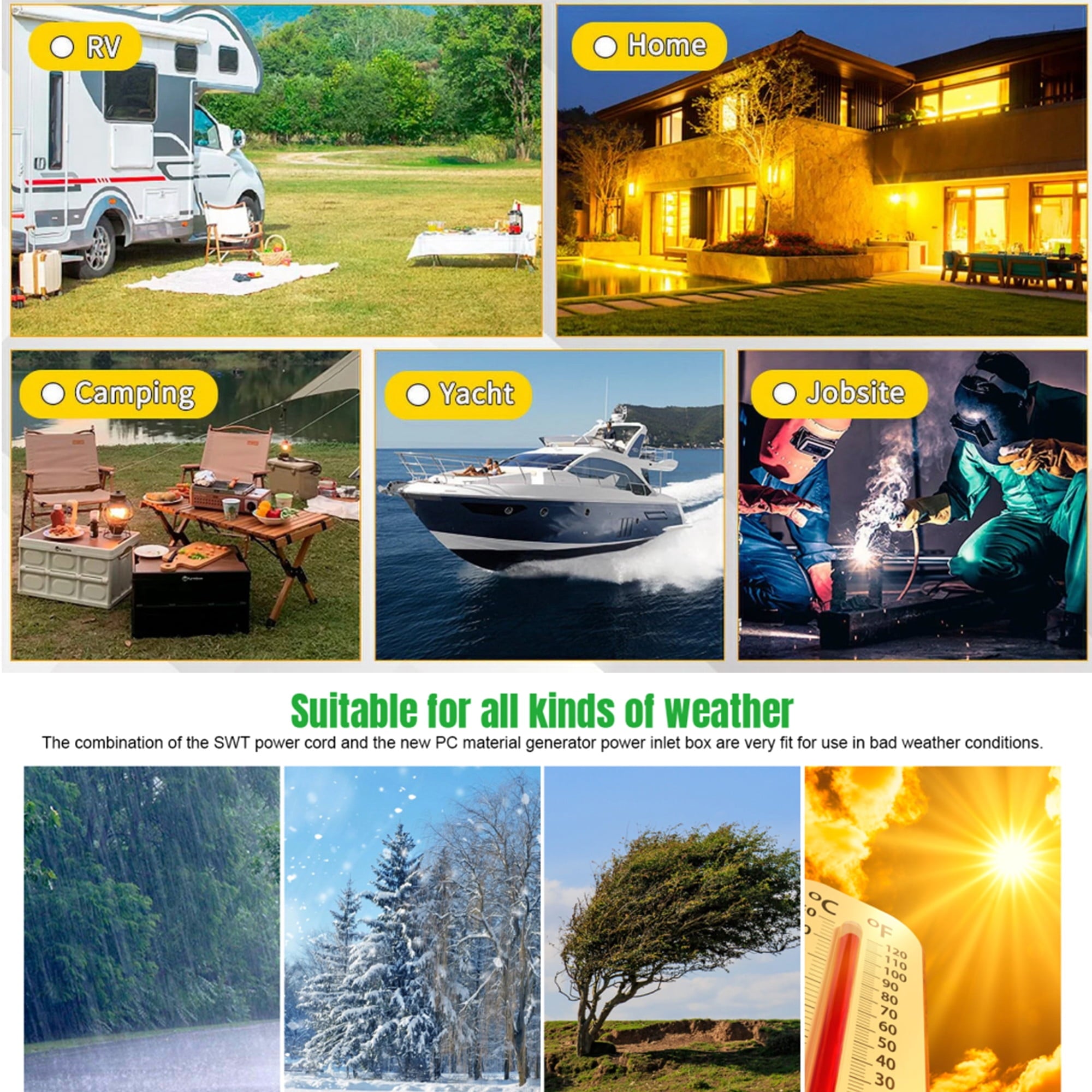 🚍🔌➤【Wide Application】: Combination of SJTW generator power cord and new PC inlet box, flexible & not easy to break & not easy to rust & good sealing of twist-lock connector; extension cord perfect for RV power and emergency power at home, camping and other outdoor occasions; waterproof&anti-oxidant&UV protection, even in hurricanes rainstorms and snowstorms, and other bad weather can also be used.