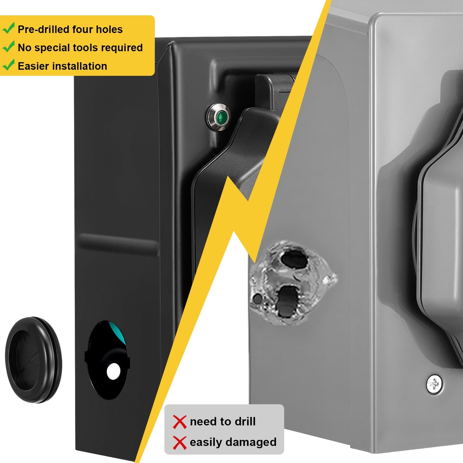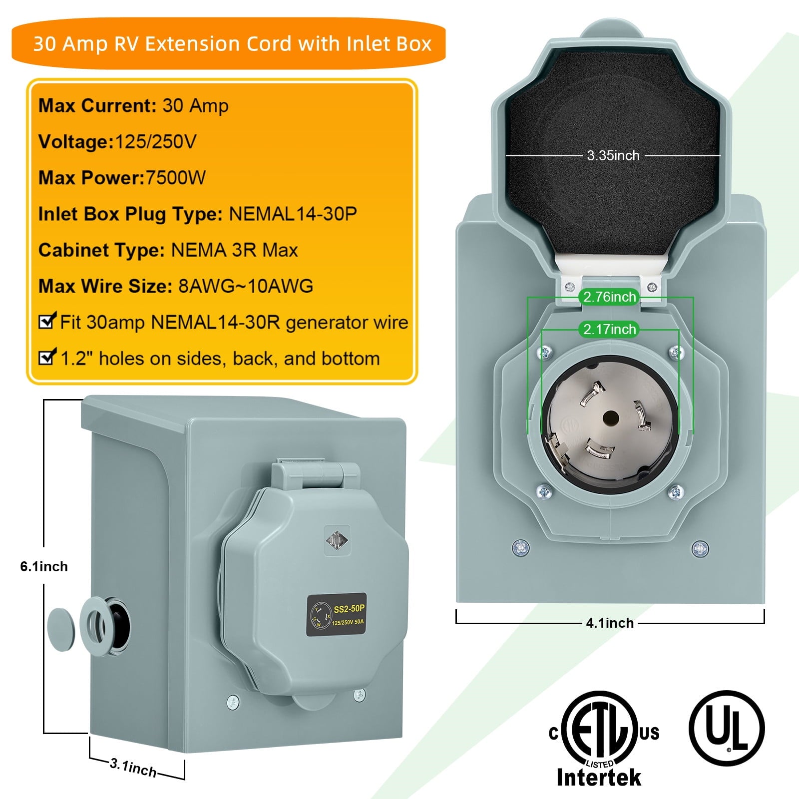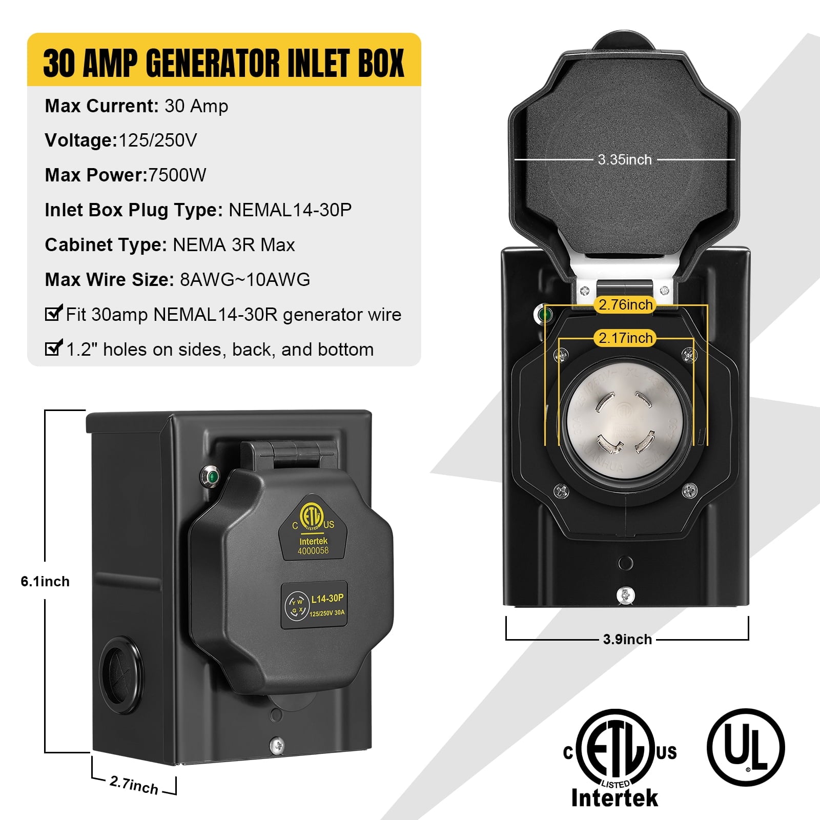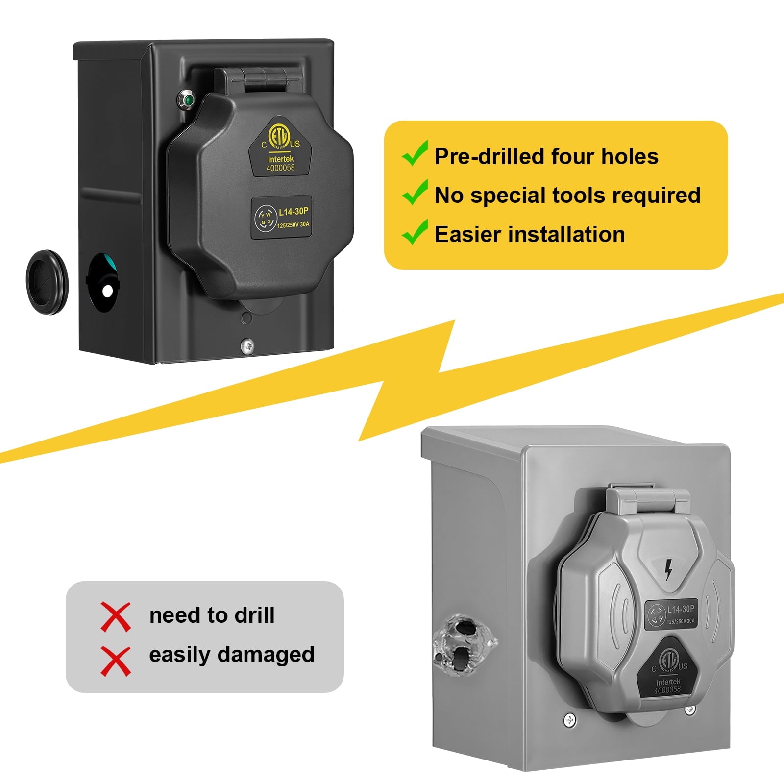 🚍🔌➤【Size Larger & NO Drilling Required】: 30Amp generator power inlet box,125/250V,7500W,designed for 30 amp NEMAL14-30P extension cord, maximum support for 8AWG~10AWG. THIS HILL UPGRADE ADVANTAGES: 👍① made of new PC material,thicker and resistant to rust;👍 ② 30 amp power inlet box internal space size has been upgraded to 3.1”, wires don’t crush easily;👍 ③ four holes are pre-drilled,eliminating need to re-drill for user convenience.