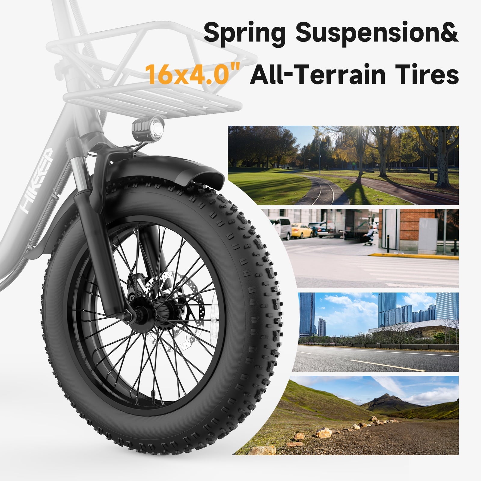 🛞 16×4” Fat Tires – Safer, More Stable, Puncture-Resistant: Wide snow/mud-proof tires with reinforced anti-puncture layers offer better grip and balance than standard 3” or thin tires. Combined with front suspension, bumps and slippery ground are less of a concern. Ideal for riders who want extra safety, stability, and reduced risk of skidding.