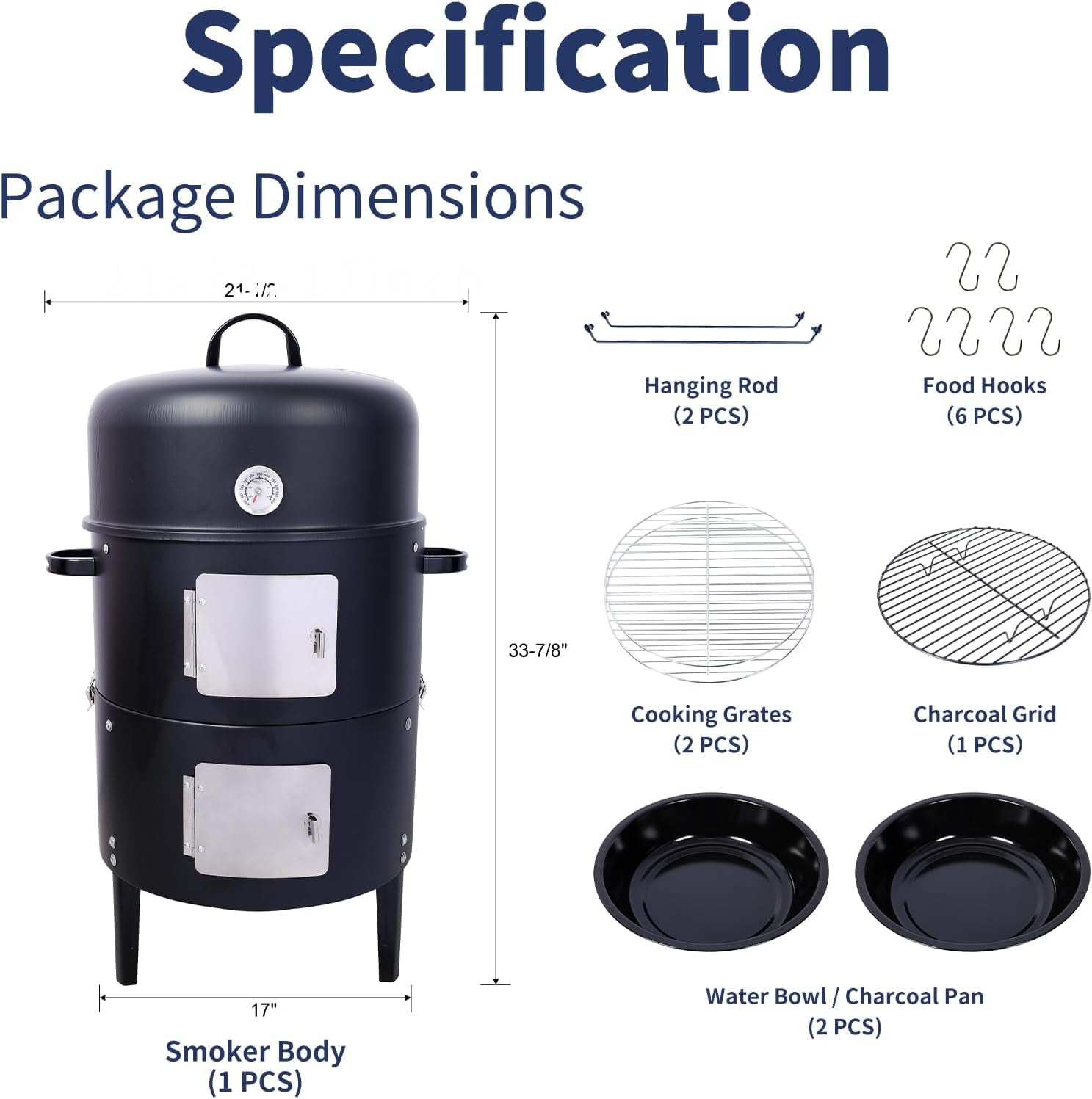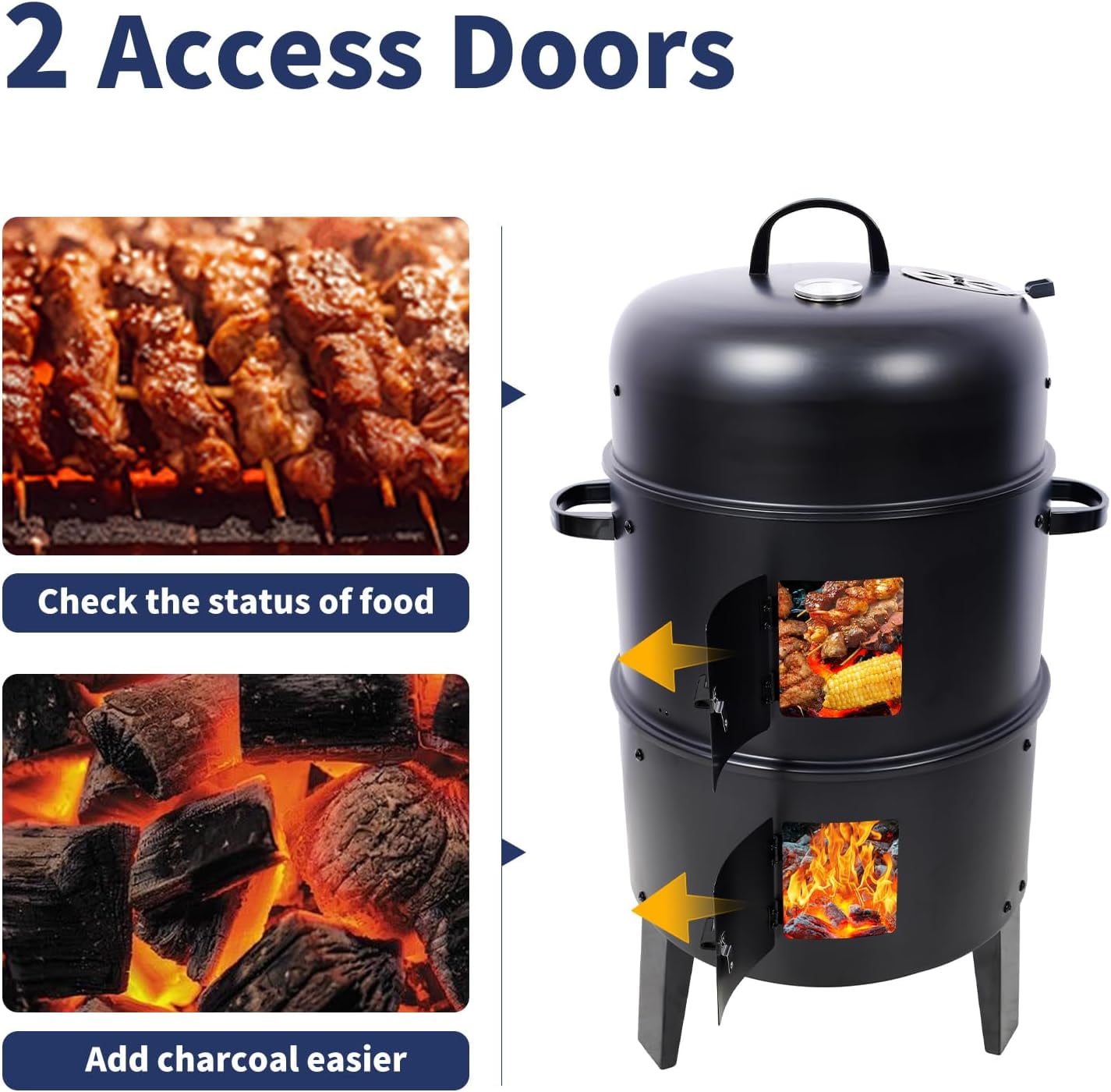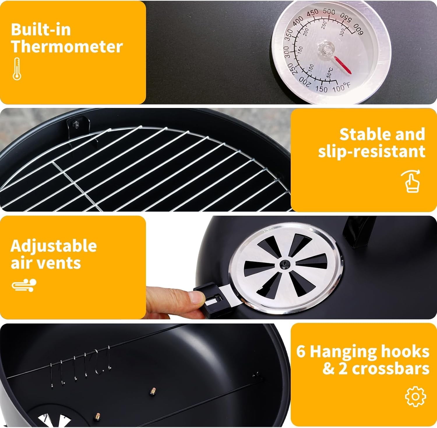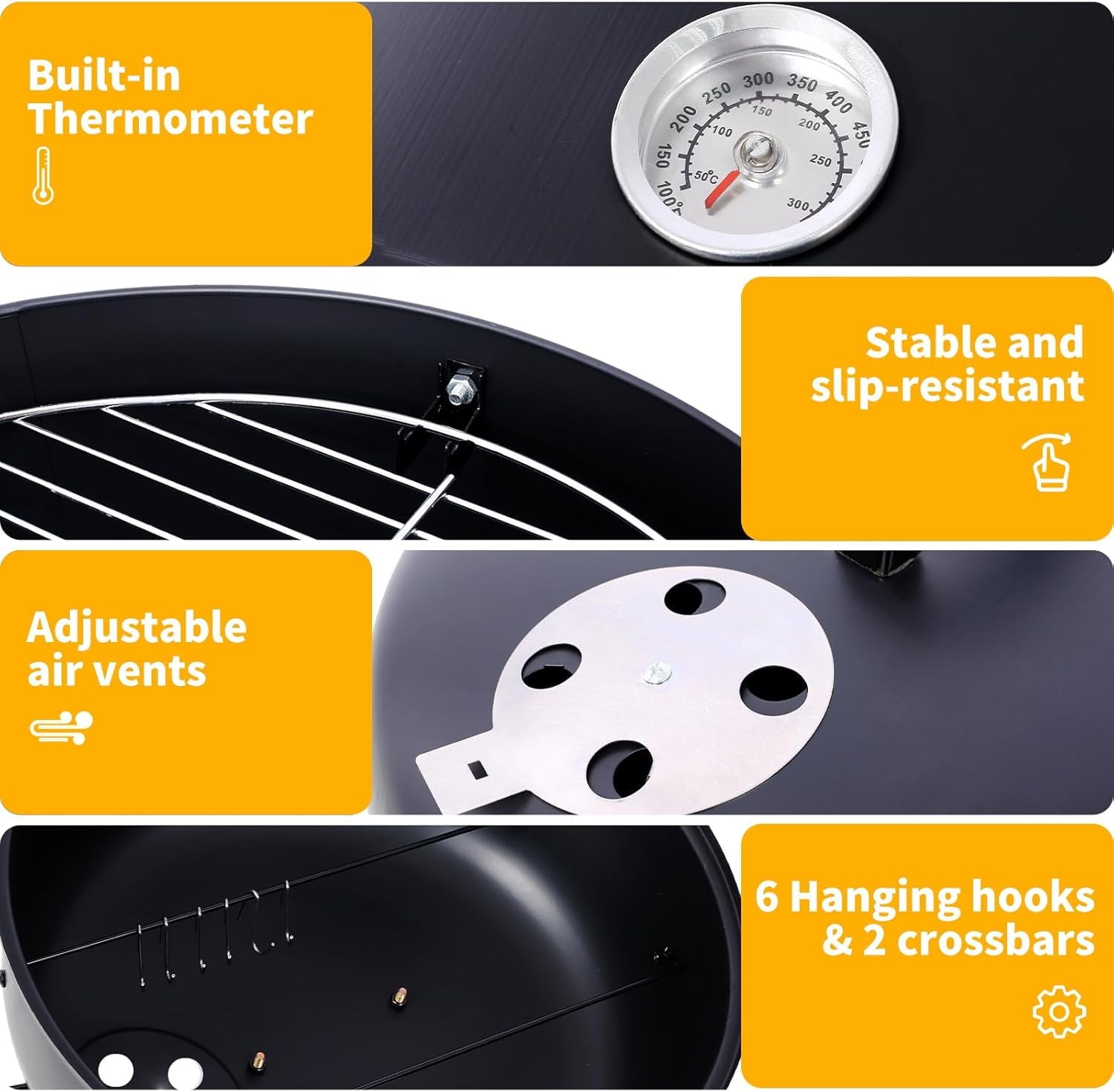 - Thoughtful Design: This smoker is designed for optimal performance, featuring accurate temperature control via a built-in thermometer and adjustable vents, a robust build with heat-resistant materials and stable structure, and user-friendly access with viewing windows and convenient doors.