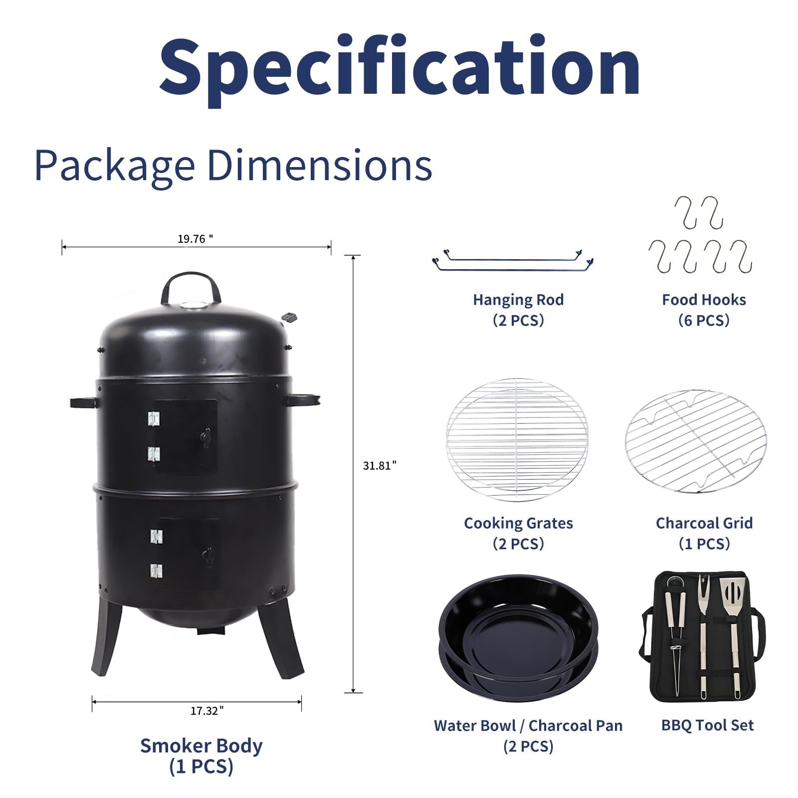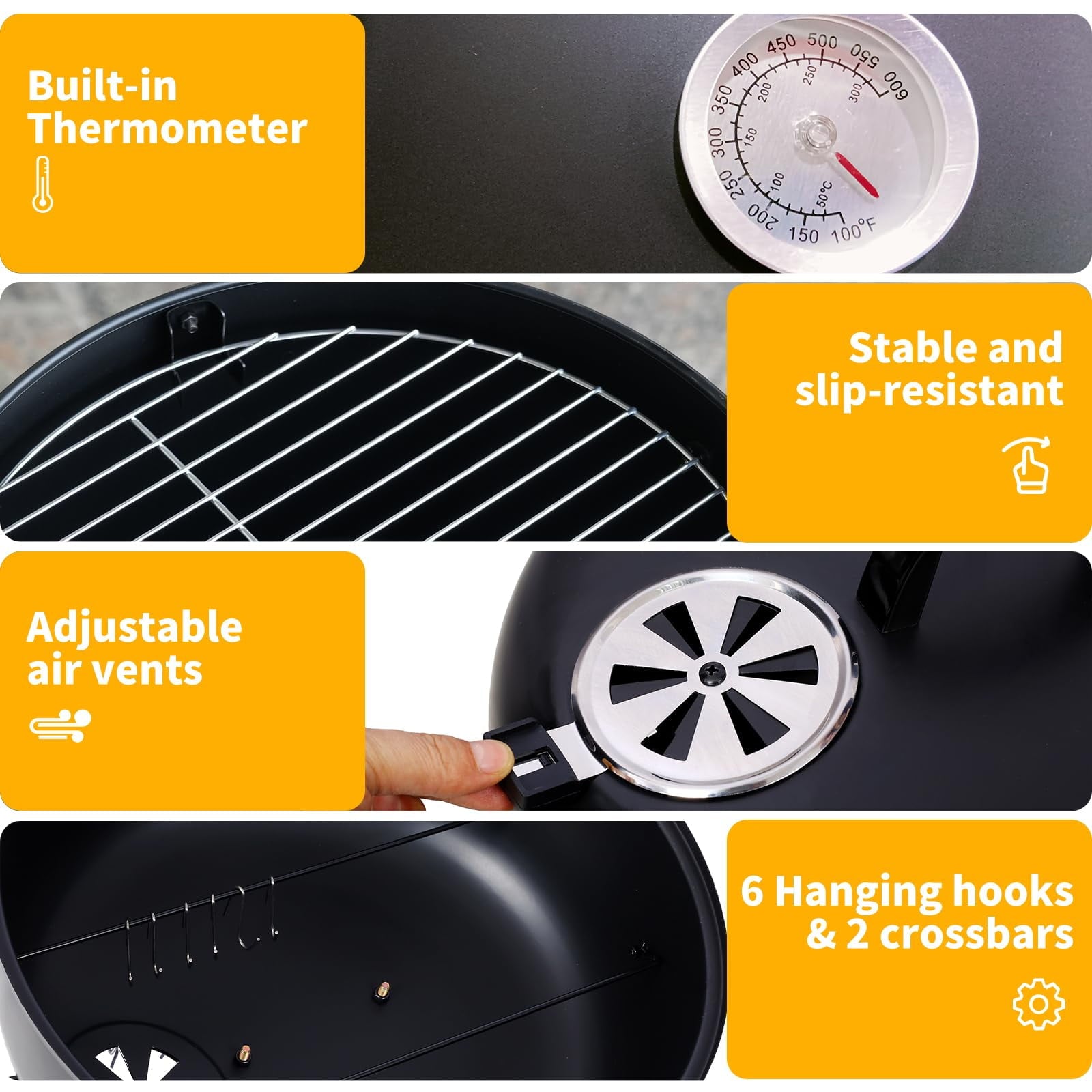 • Thoughtful Design: This smoker is designed for optimal performance, featuring accurate temperature control via a built-in thermometer and adjustable vents, a robust build with heat-resistant materials and stable structure, and user-friendly access with viewing windows and convenient doors.