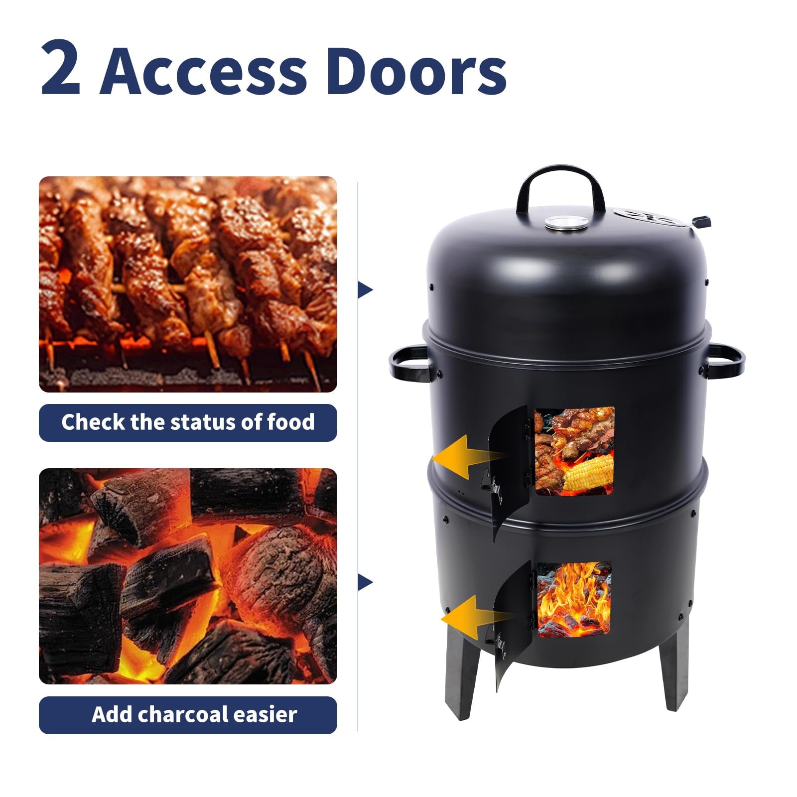 • User-Friendly & Safe Operation: Designed with dual access doors for easy charcoal and wood chip addition, plus heat-resistant handles for safe handling. Includes a built-in thermometer for precise temperature control.
