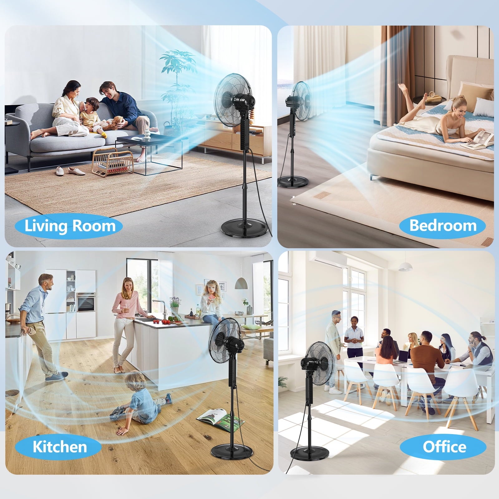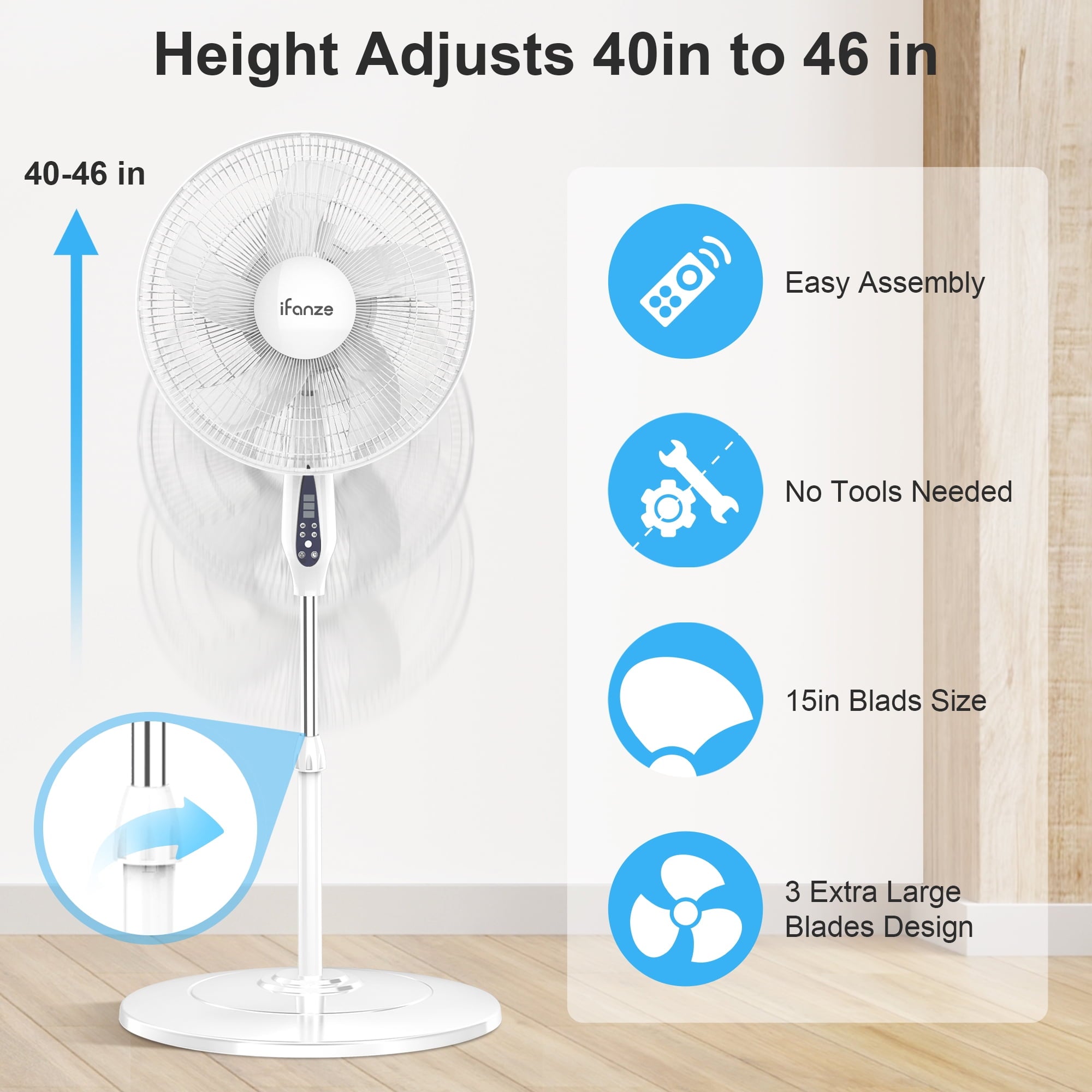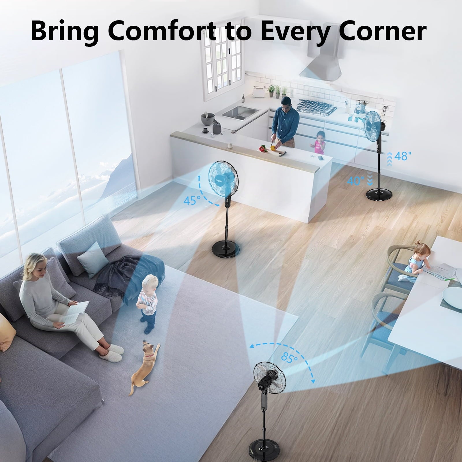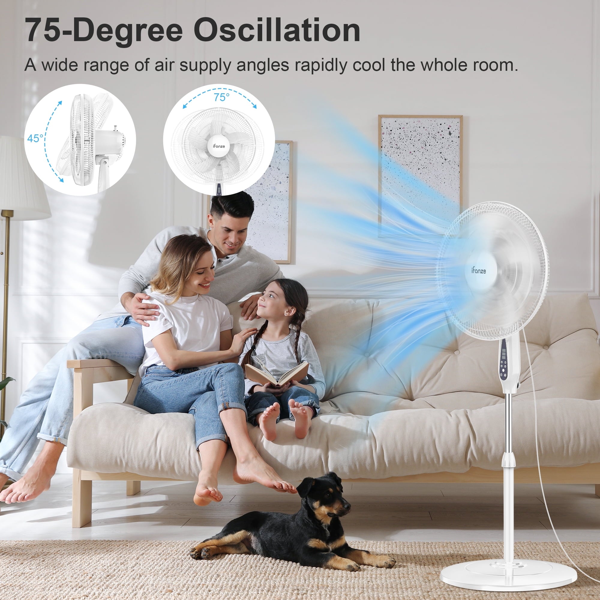 Designed for versatile use, this fan for bedroom features an adjustable height (40″ to 48″), a 75° oscillating head, and a 45° tiltable angle. Whether you need a fan that blow cold air, floor fan, electric fan or stand fan, this all-in-one design lets you customize airflow to your preference—near or far, high or low.