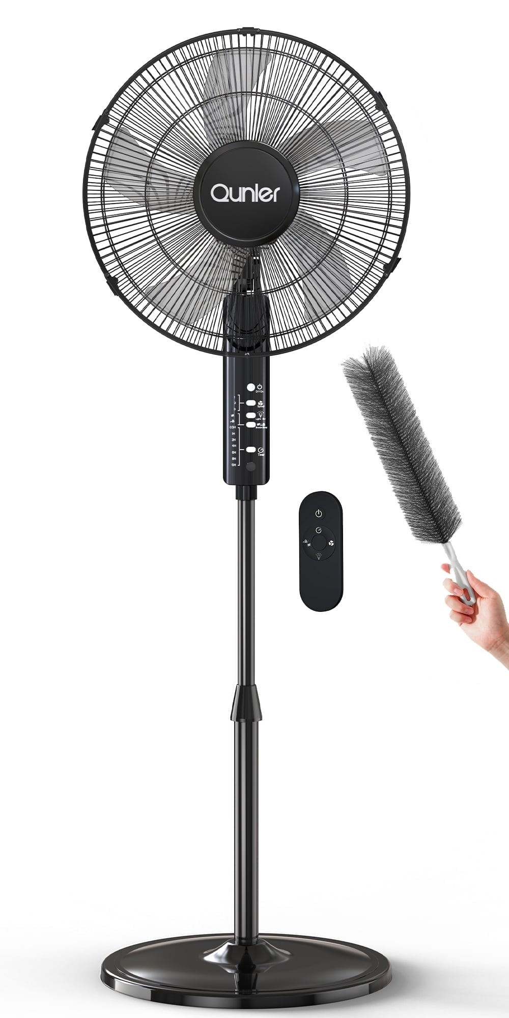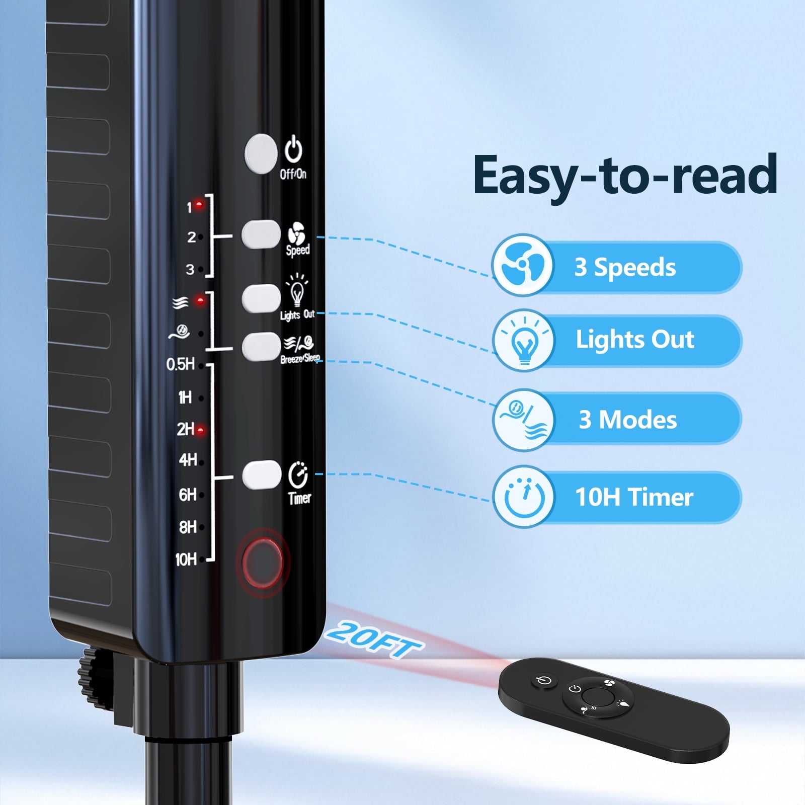 Control your comfort from up to 20 feet away with the included remote control of this standing fan. Choose from three wind speeds—strong wind mode for instant cooling, breeze mode for gentle airflow, and sleep mode for a quiet, restful night. The fan’s lights-off button lets you turn off the indicator light to avoid distractions while sleeping. Plus, the 10-hour timer ensures energy-efficient operation, so you can set it and forget it.