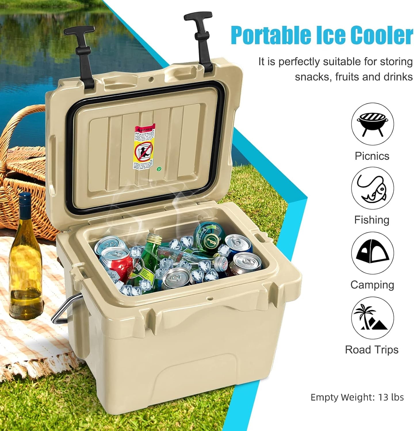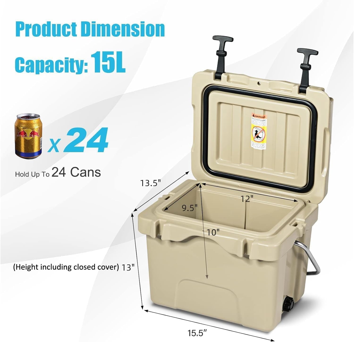 [16 Quart Large Capacity]Measuring 15.5” x 13.5” x 13”, this ice cooler features large capacity of 16 quart, which can hold 24 cans (no ice added).It will be a good helper to cool your drinks or keep your food warm when you go outside for camping, fishing, picnics or other outdoor activities.