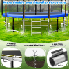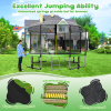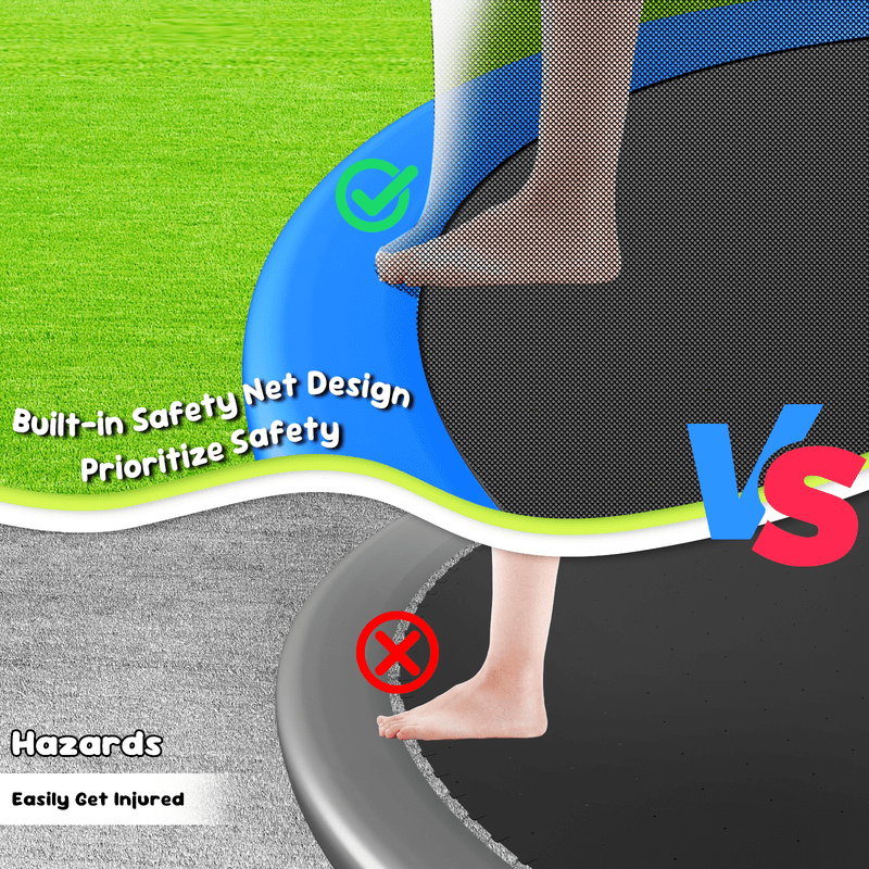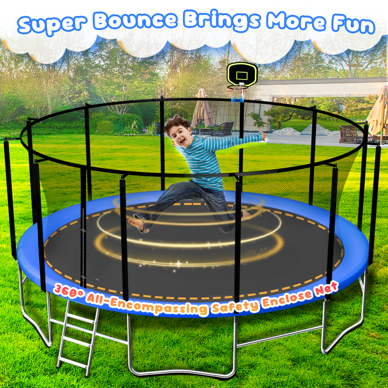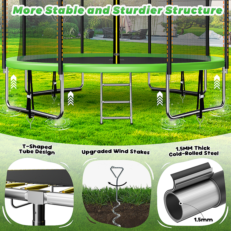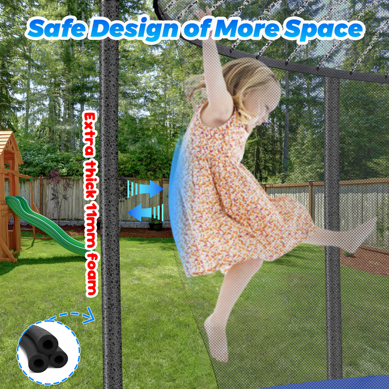 6 W-shaped legs provide 12 balanced points, upgraded T-shaped joint ensures the tight connection of the trampoline structure, to increase the stability of the trampoline. 64 inches height anti-UV high-density trampoline safety enclosure, the thickened foam sleeve, all the springs are covered with thick and durable foam pad is designed to protect the user of your trampoline when bouncing, 12 net poles enhance the stability and safety of this large trampoline.