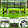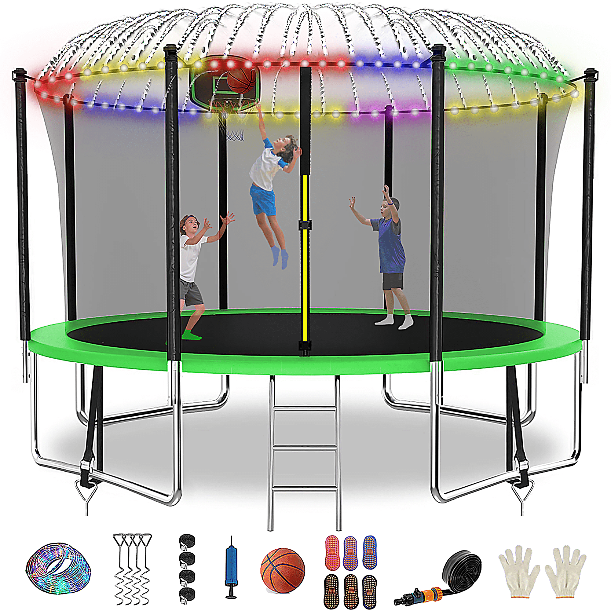 Our outdoor trampoline provides 1* rubber ball+ inflator,1*sprinkler,1* LED light,6 socks,6*wind stakes straps combination. The wind stakes twist deep into the ground for the highest level of trampoline stability, help protect your trampoline during stormy/windy conditions, safely secure the trampoline to the ground. Strong belt straps easily connect to the steel buckles for fast assembly and disassembly. Playing rubber ball can improve kids’ motor coordination, ideal as the best gift for kids.