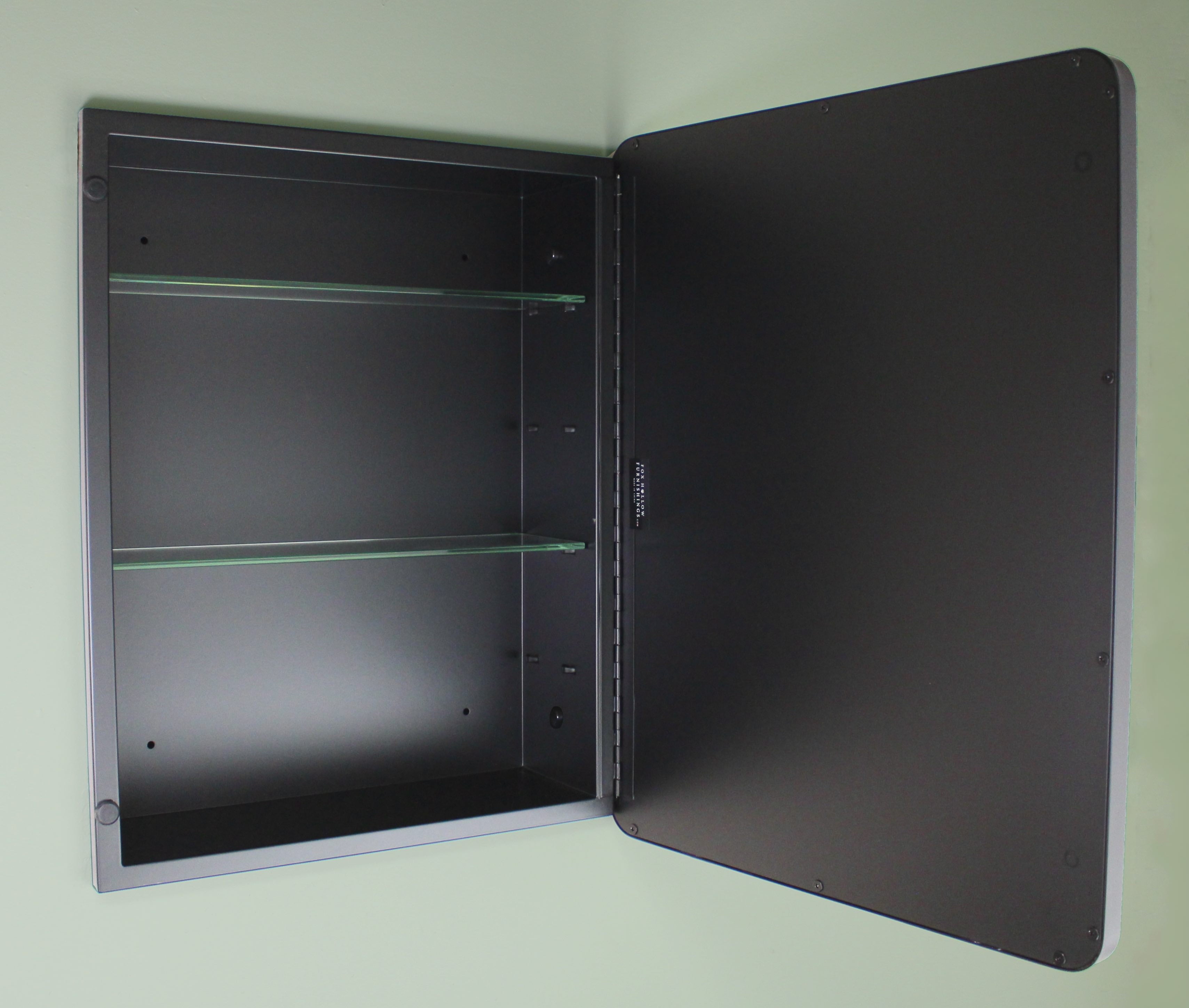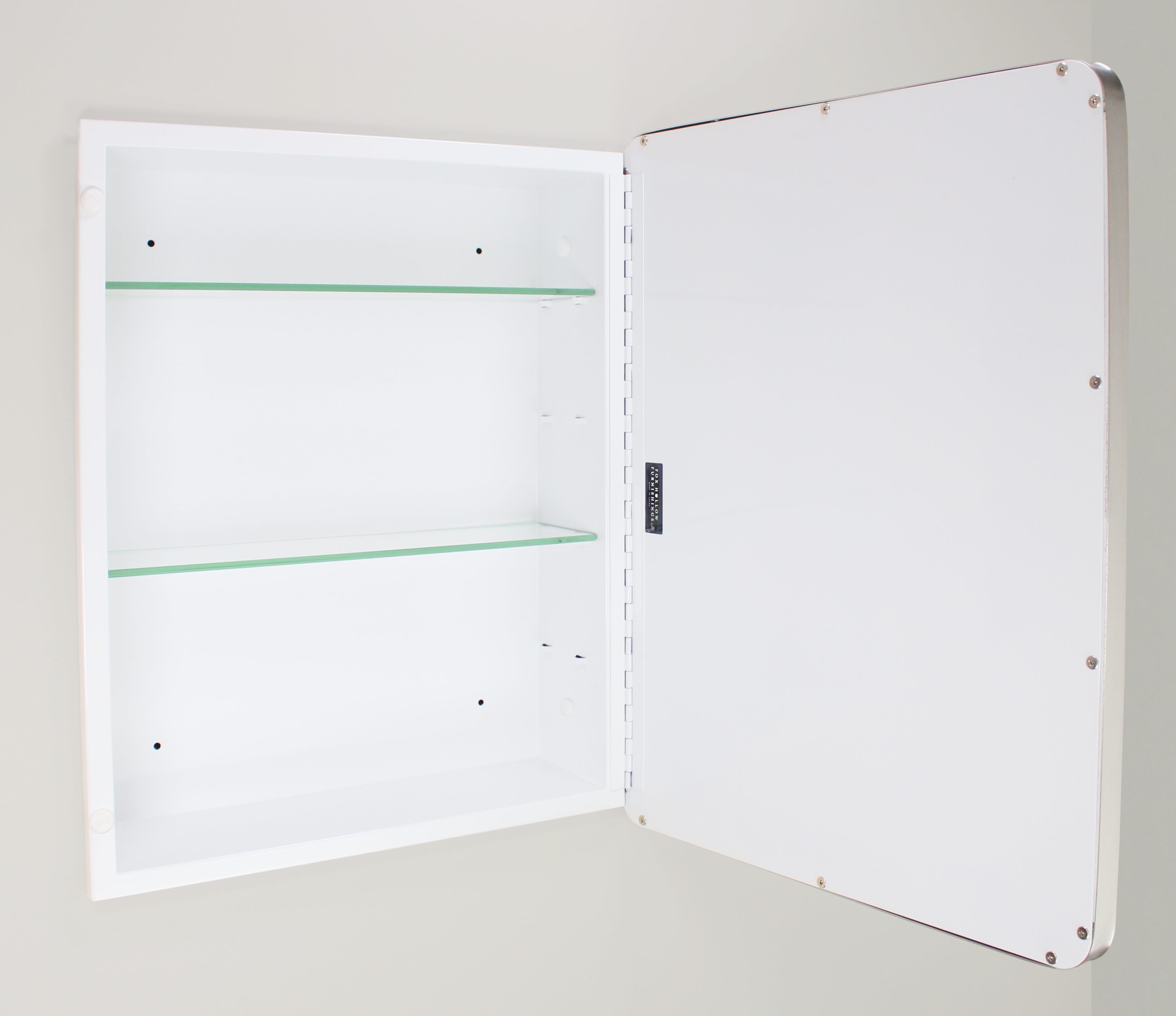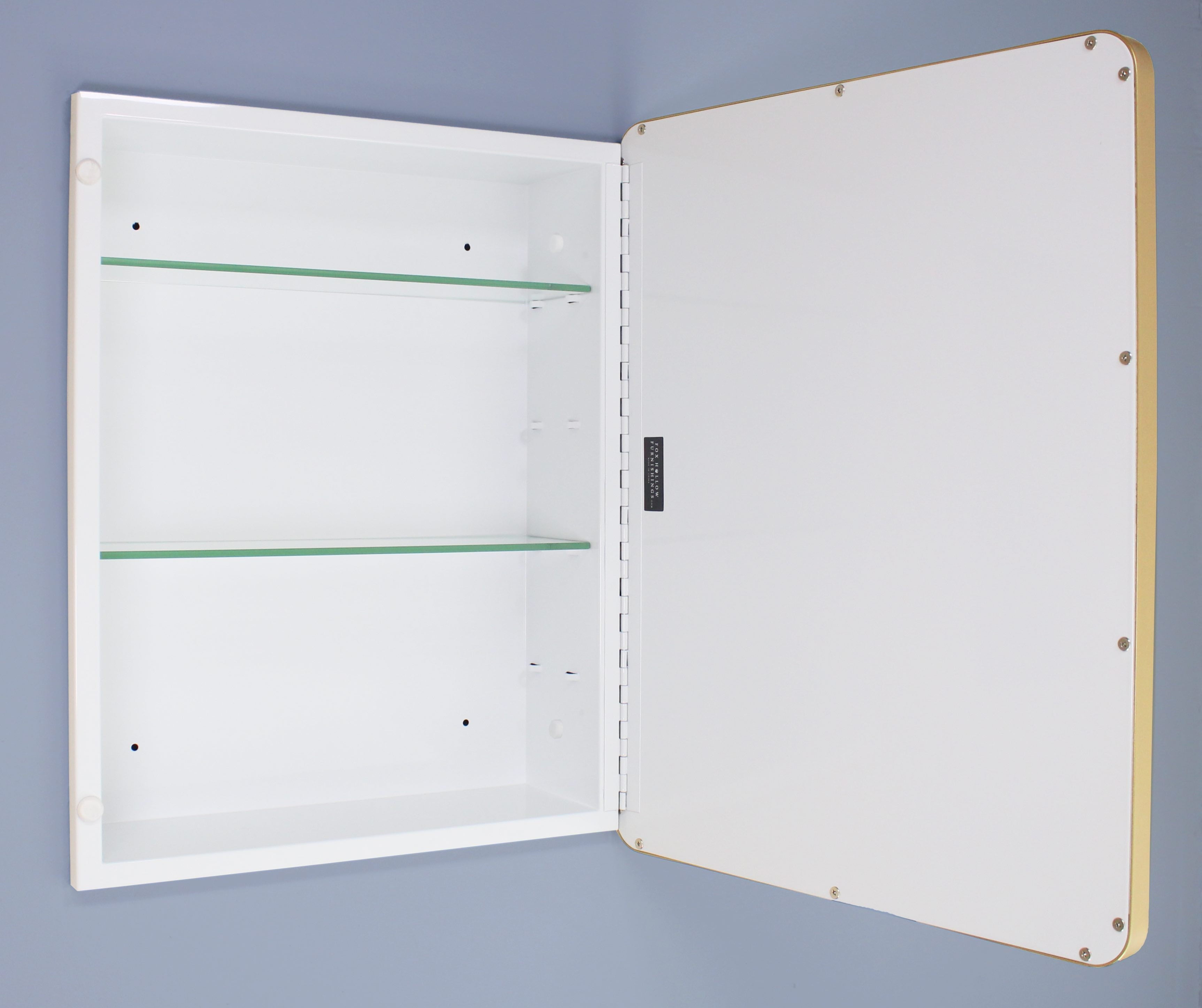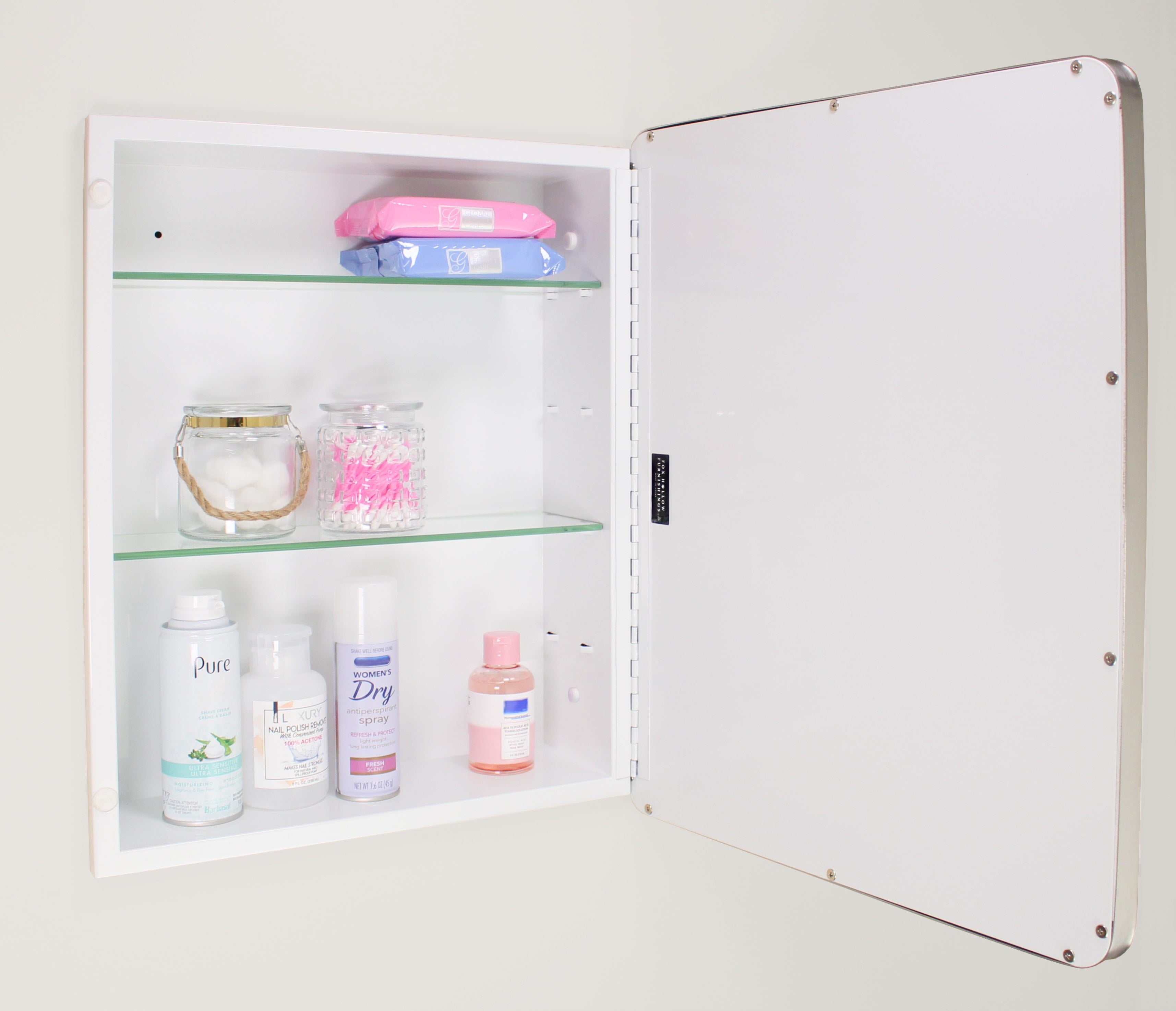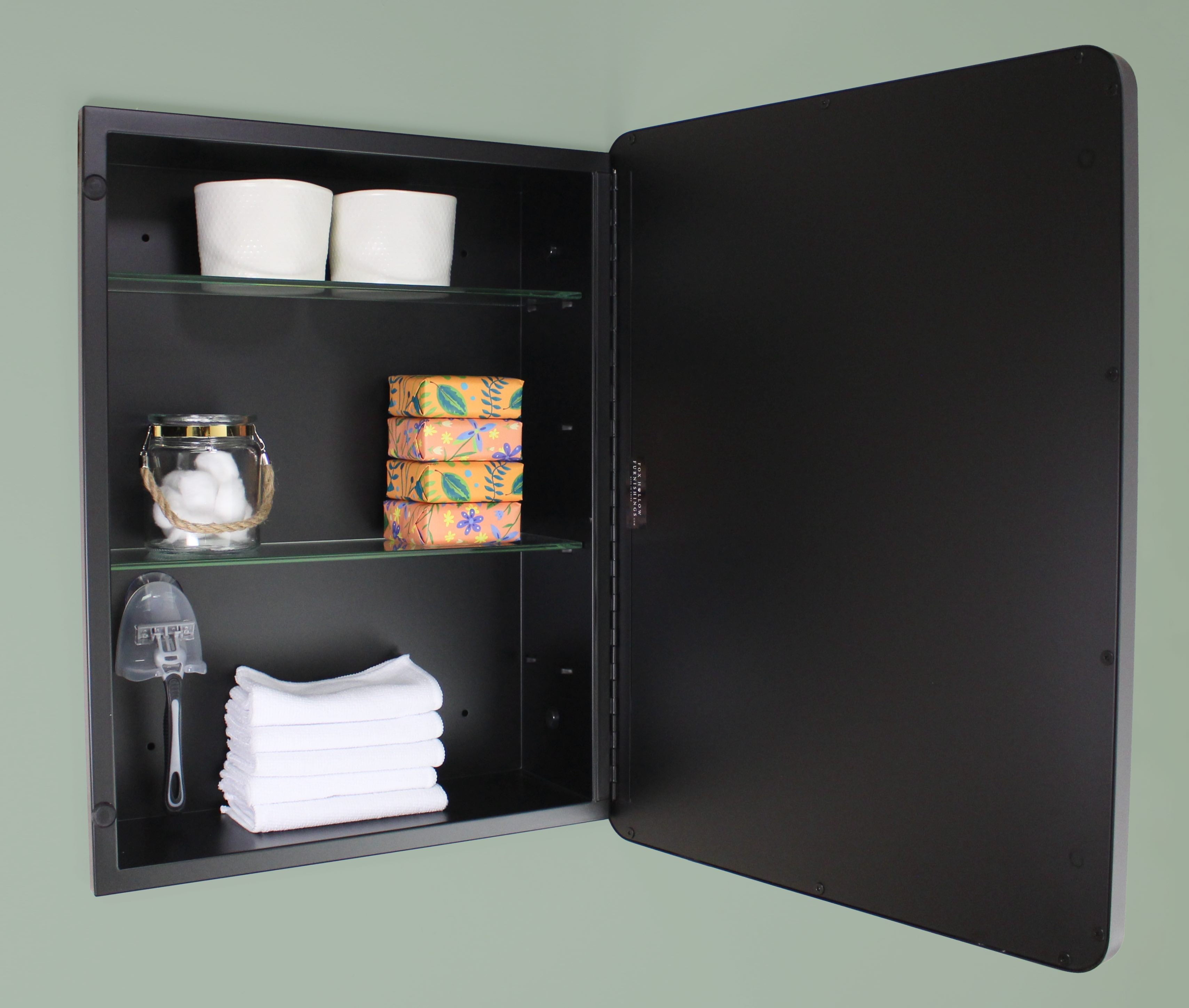 Available in multiple sizes (14×18 with 16×20 door, 14×24 with 16×26 door) and colors (Black, White, Chrome, Brushed Nickel, Gold) to suit your space. The magnetically closed door conceals adjustable, tempered glass shelves.