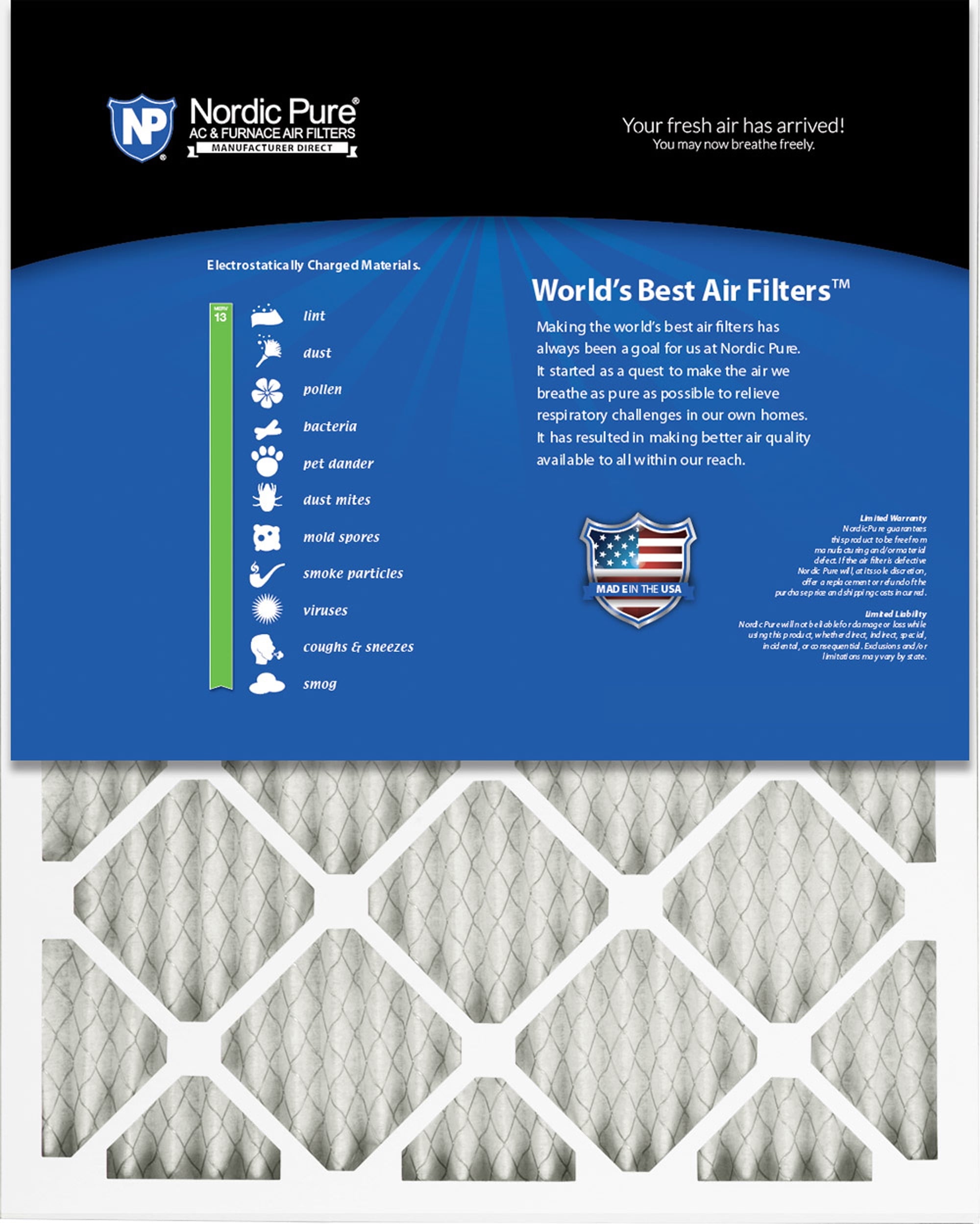 Nordic Pure MERV 13 Pleated AC Furnace Air Filters provide excellent filtration for both home and commercial environments. Our MERV 13 furnace filters are comparable to HVAC filters with the rating of MPR 2200-2400. Nordic Pure furnace air filters are manufactured using a heavy-duty 2-part, moisture resistant beverage board frame and the media is made to attract unwanted particles. The media used is better at trapping airborne particles than fiberglass filters. For fresh, clean air in your home and office, it is important to regularly change your AC filter to improve indoor air quality and help your HVAC unit perform more efficiently. We recommend changing your filter every 1-3 months, depending on your environment. People with pets or those who suffer from allergies should change their A/C air filters more often. Important Note: Almost all air condition filters have a different Actual Size (the exact dimensions) than Nominal Size (the name) printed on the air conditioning filter. It is best to measure the exact size of your A/C filter and compare it to our Actual Size to be sure your HVAC replacement filter fits.
