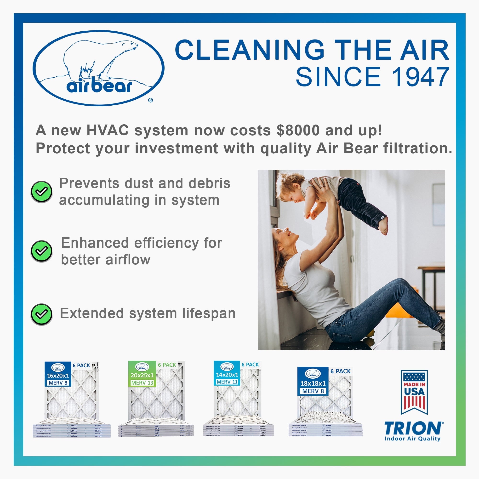 We’ve been cleaning the air since 1947 and take pride in every filter we manufacture. Air Bear filters deliver clean air and protect your HVAC system. Our filters are a great upgrade from typical fiberglass filters. You can expect quality, American-made air filtration products when you choose the Bear.